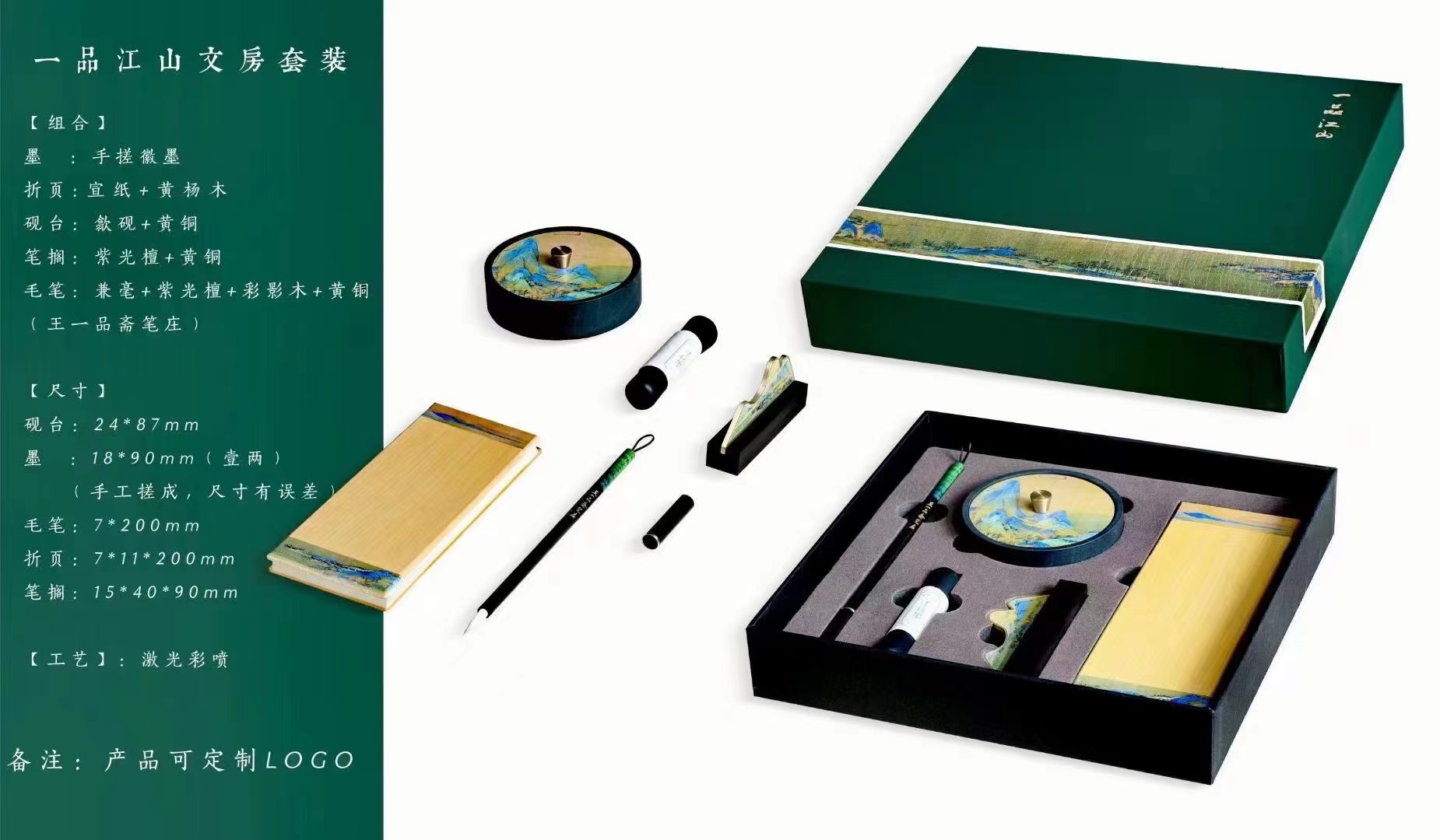 产品采用了湖笔知名品牌“王一品”毛笔头,徽州“胡开文”手工搓墨,泾县手工宣纸、歙砚。现代与传统相结合,演绎中国文房文化…