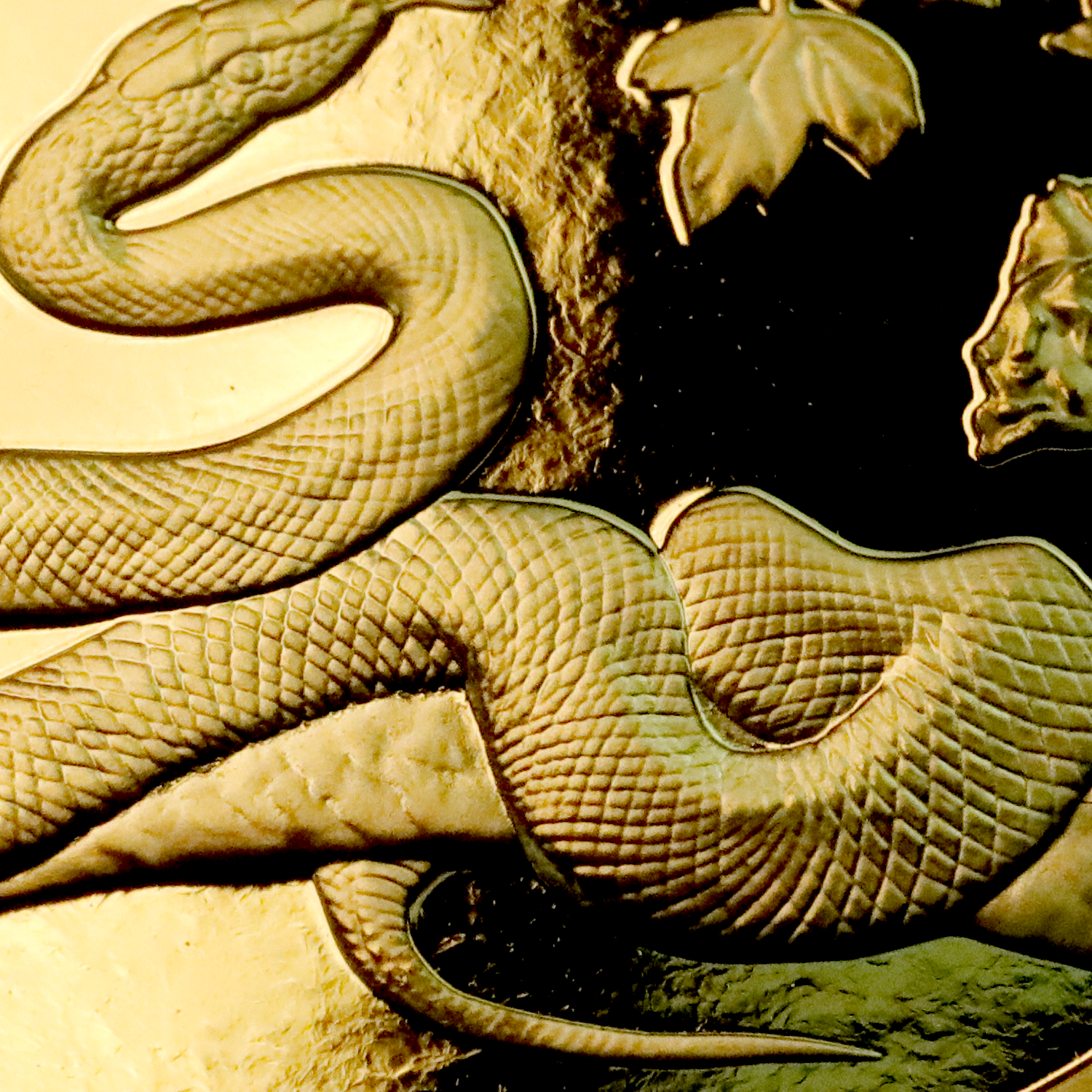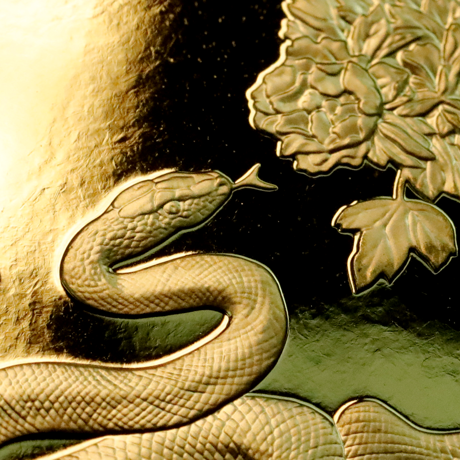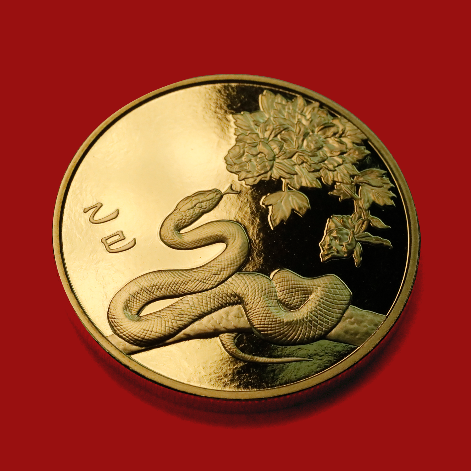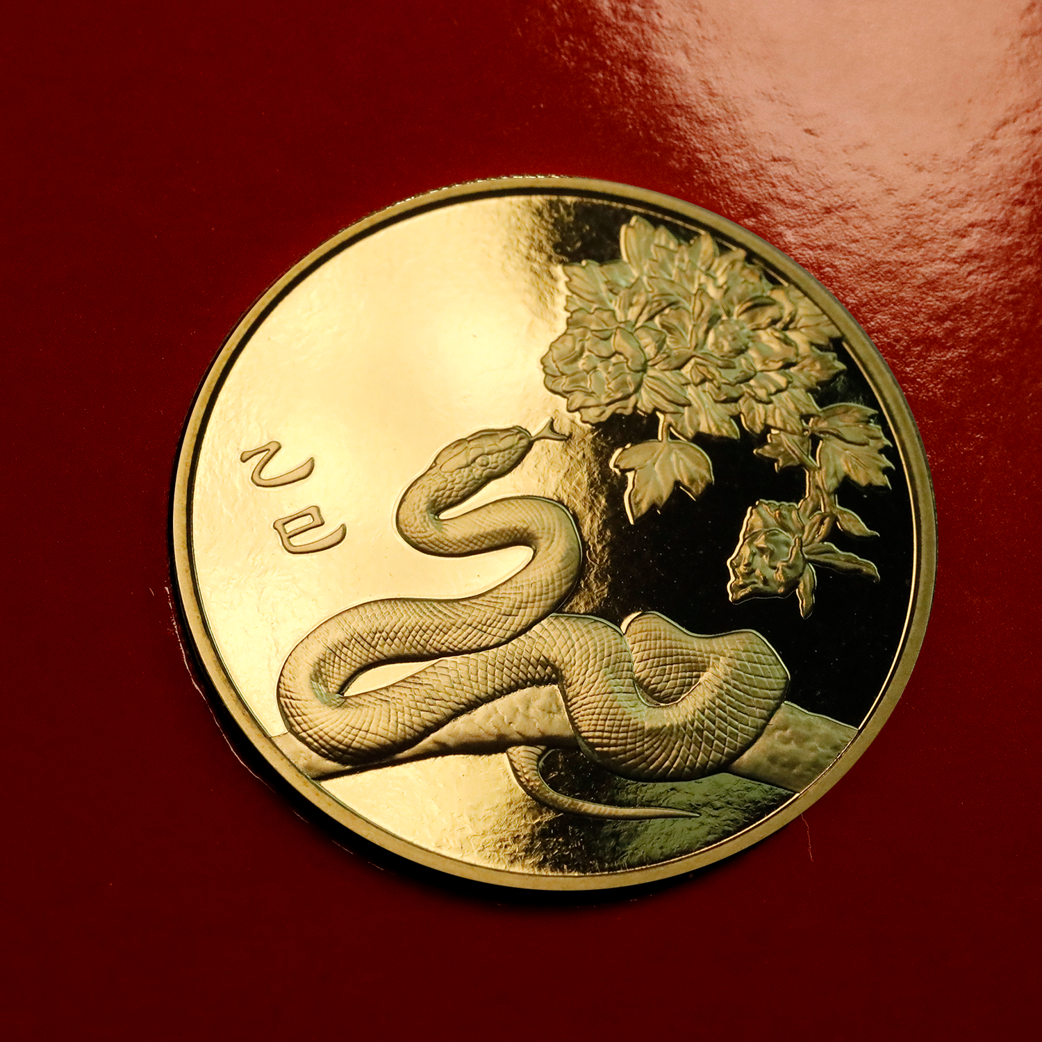 币面采用了浮雕设计,正面主景为一条小蛇盘旋在树枝上,精雕细刻使得小蛇的形态栩栩如生,既机敏又灵动。