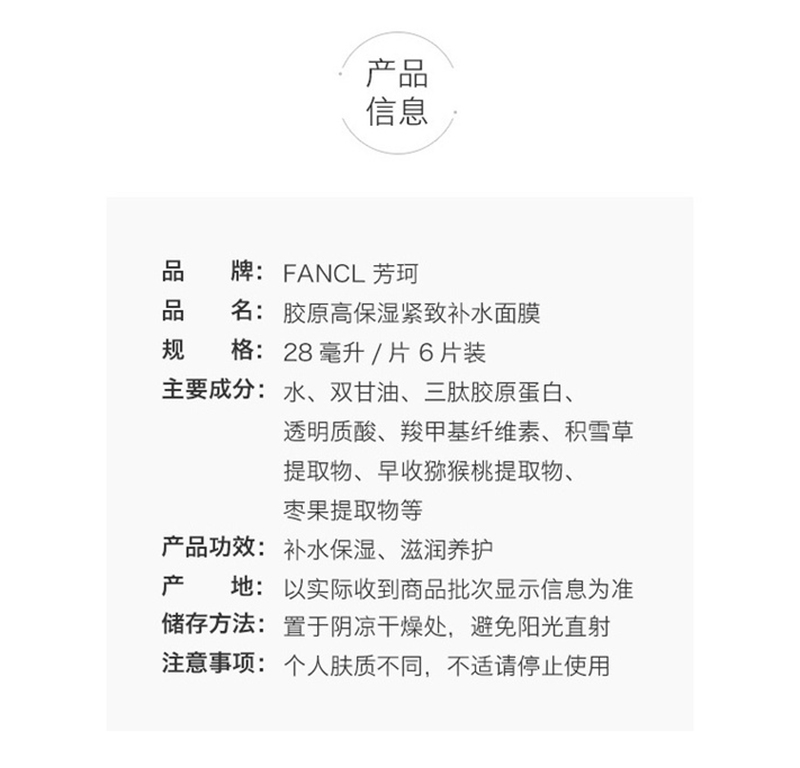 芳珂 胶原蛋白补水滋养亮白提拉紧致保湿面膜*6片/盒