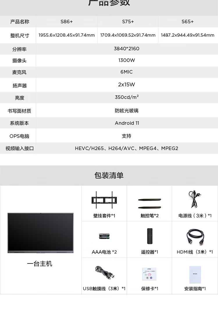 | 联想thinkplus S65+ 会议平板65英寸4k触摸大屏(无摄像头/麦克风/手写笔/遥控器/壁挂支架/安卓系统) |