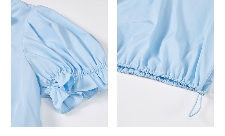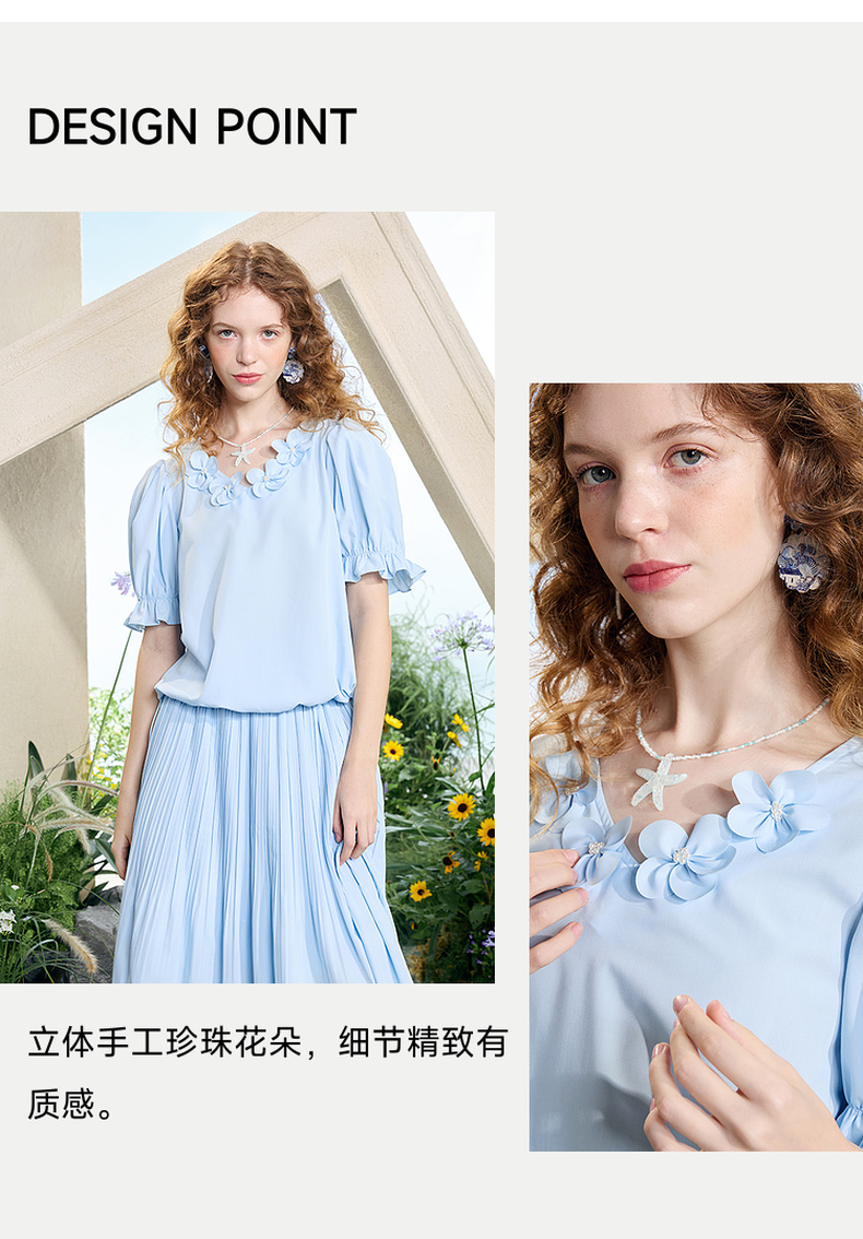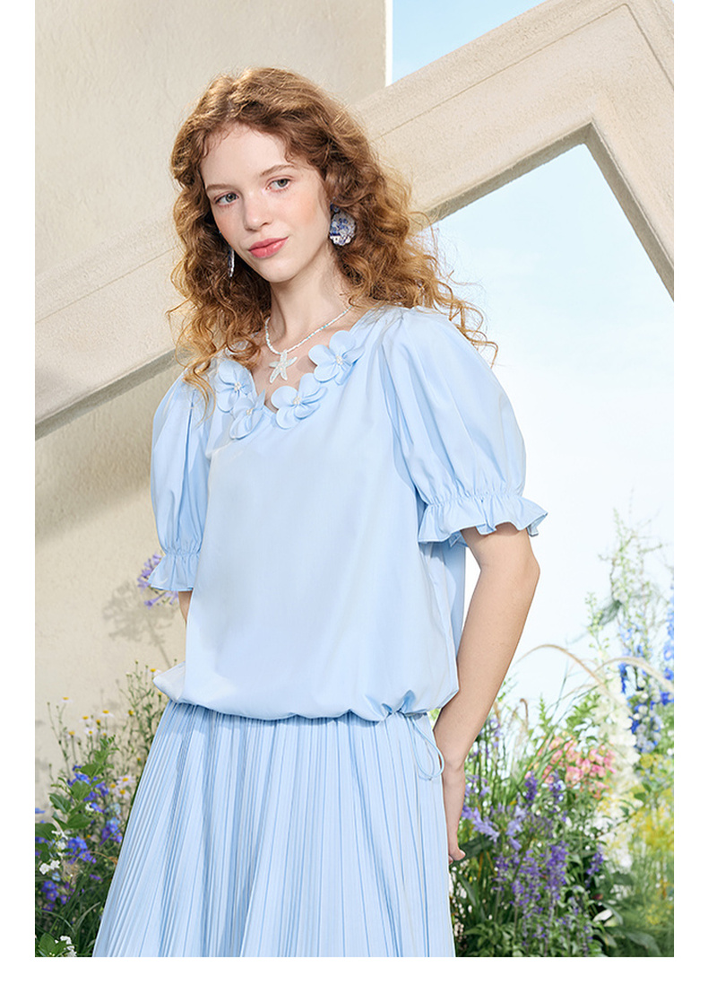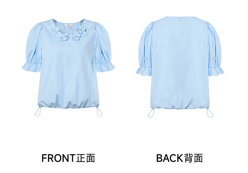 两三事 花雨倾落 2025夏季新款甜美立体花朵抽绳下摆泡泡袖衬衫女
