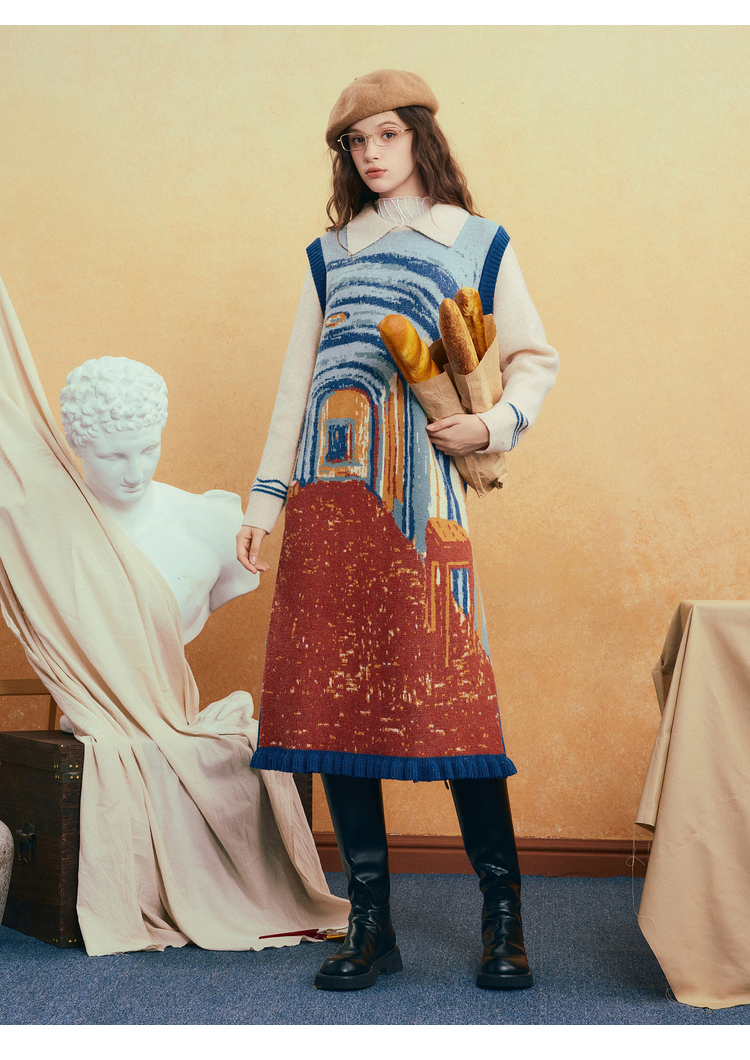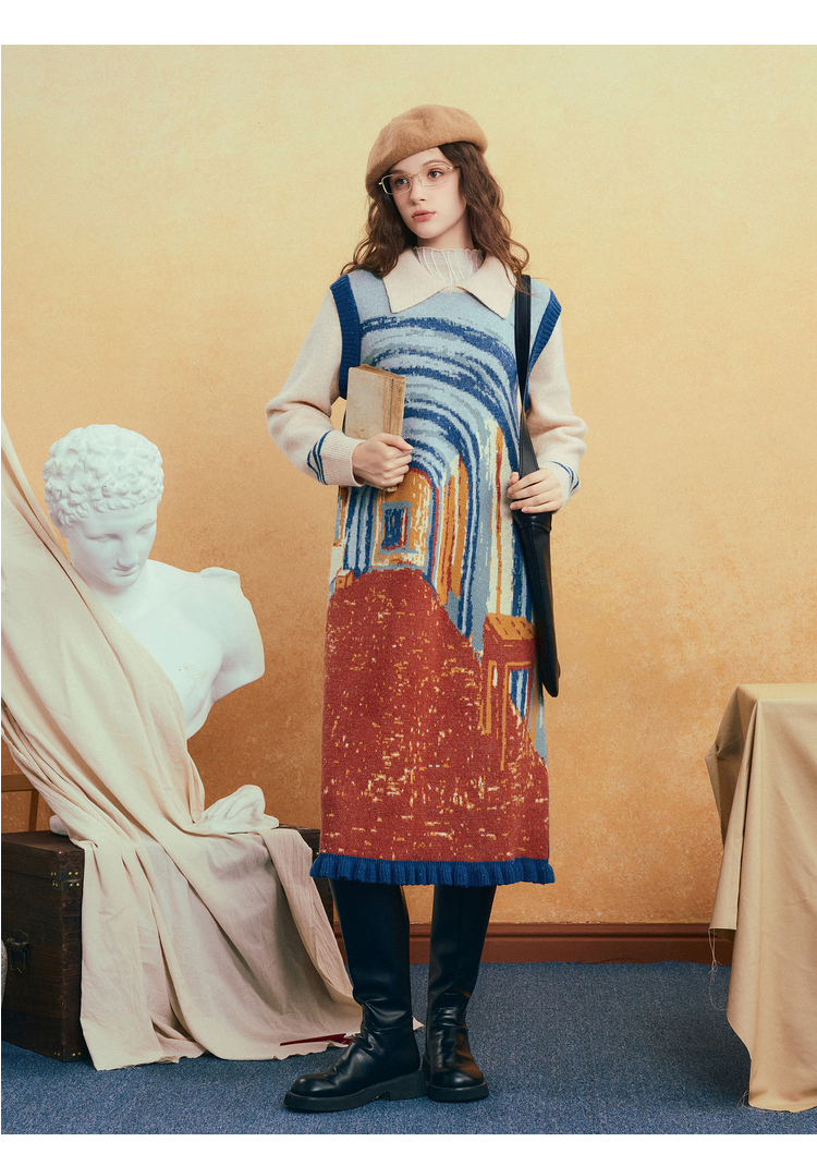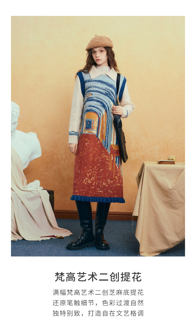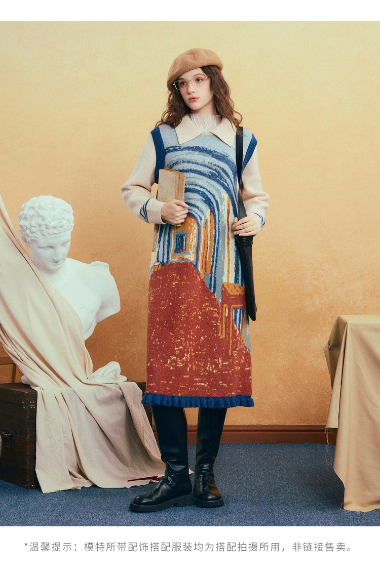 两三事梵高文艺时光回廊2025冬季新款荷叶边裙摆花色假两件连衣裙