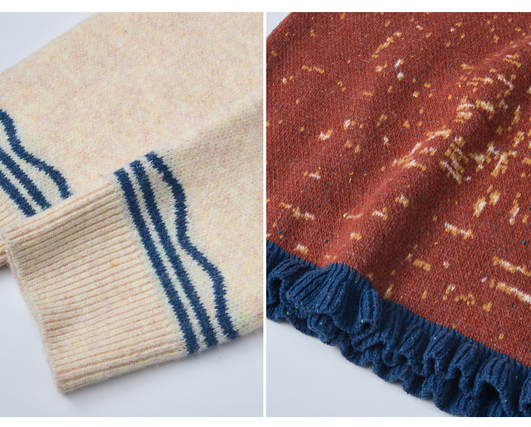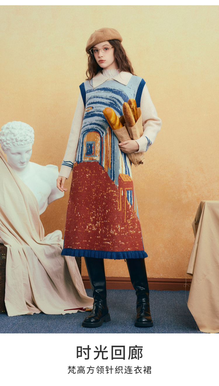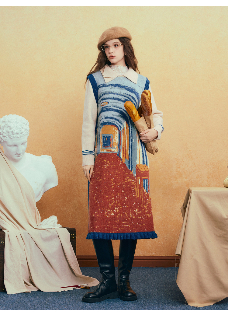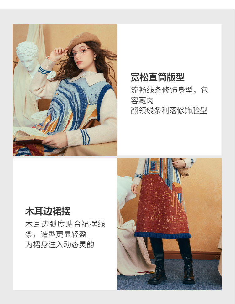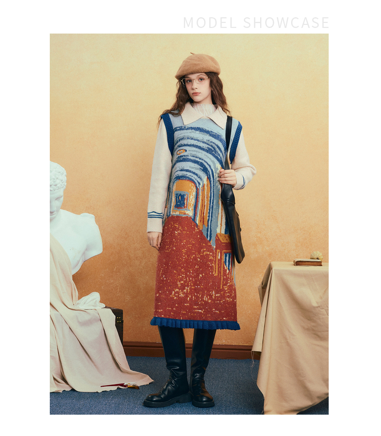 两三事梵高文艺时光回廊2025冬季新款荷叶边裙摆花色假两件连衣裙
