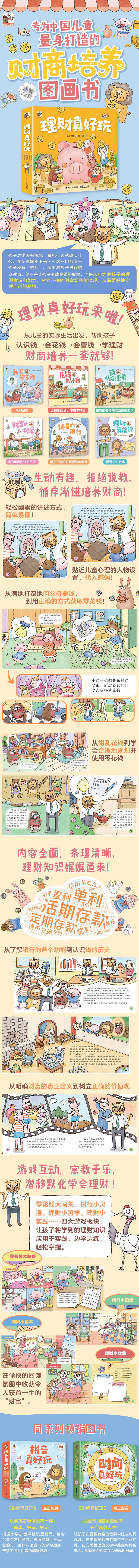 该系列是继《拼音真好玩》《时间真好玩》热销之后,策划出版的"5-10岁儿童刚需产品线”的第三套图书《理财真好玩》。深入地关注儿童财商培养,让孩子认识金钱的起源、了解金钱的作用,学会如何合理花钱,了解金钱和自我以及社会的关系,建立健康的金钱观和理财观念。内容上贴近孩子的生活,让儿童和家长产生强烈共鸣。画面上延续"真好玩”系列的动物城IP形象,通过寓教于乐的故事和活泼可爱的图画,让孩子全面地了解金钱,让家长再也不必为谈钱而发愁。
