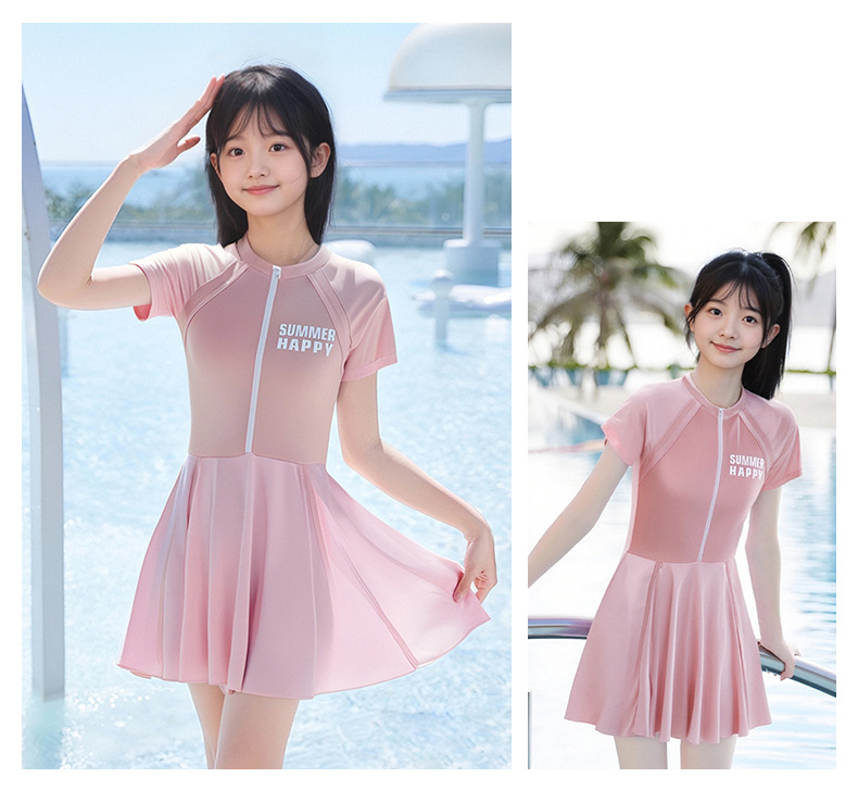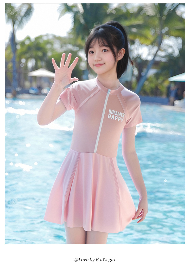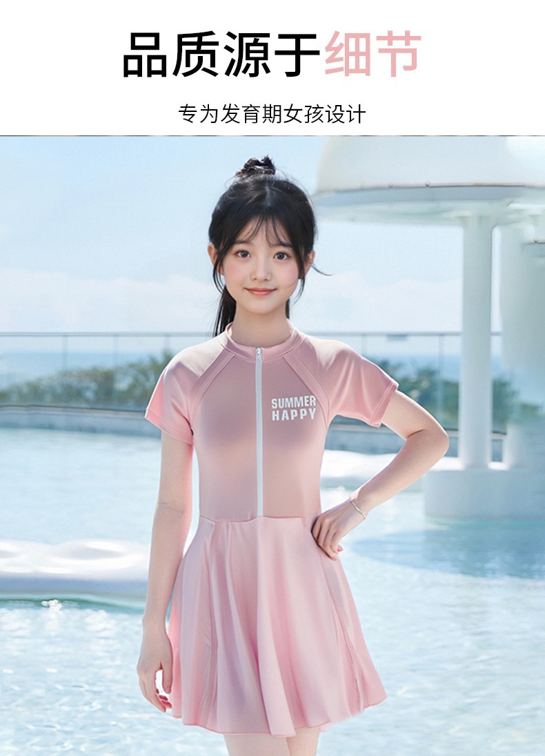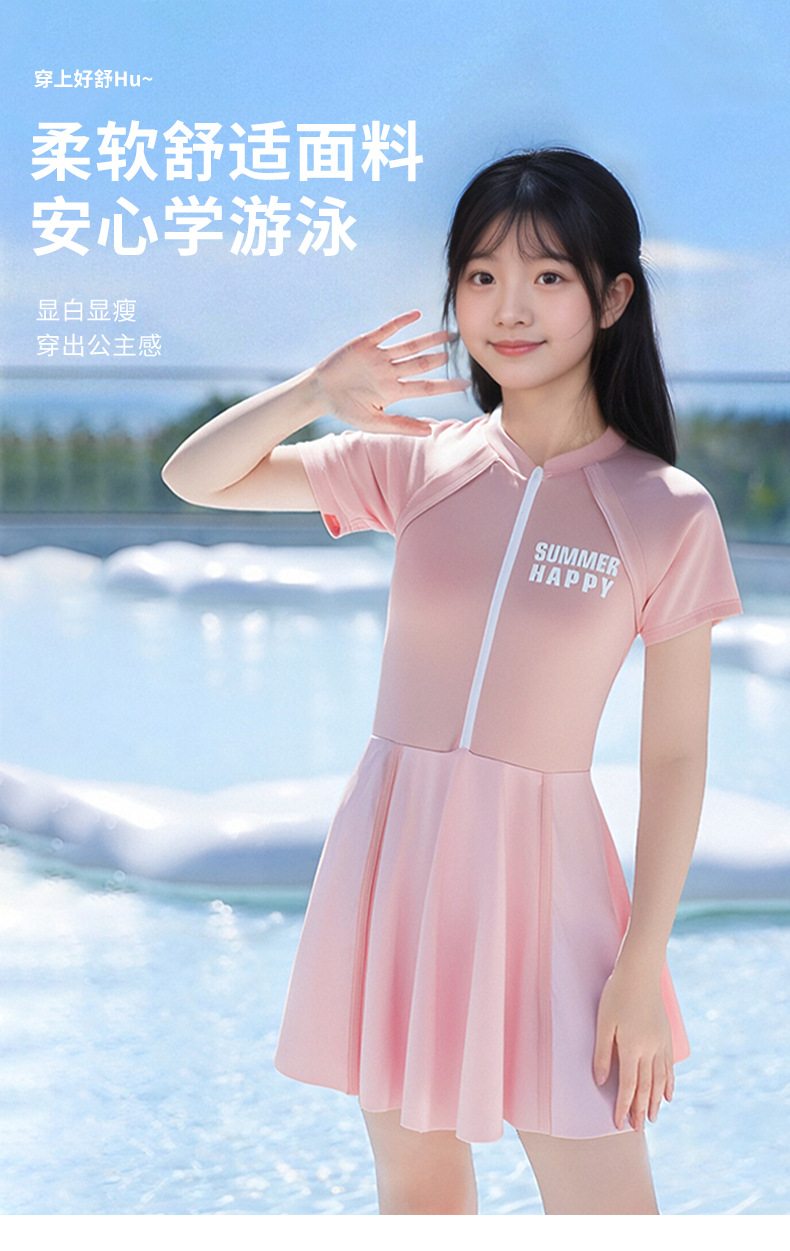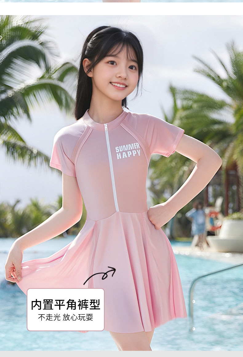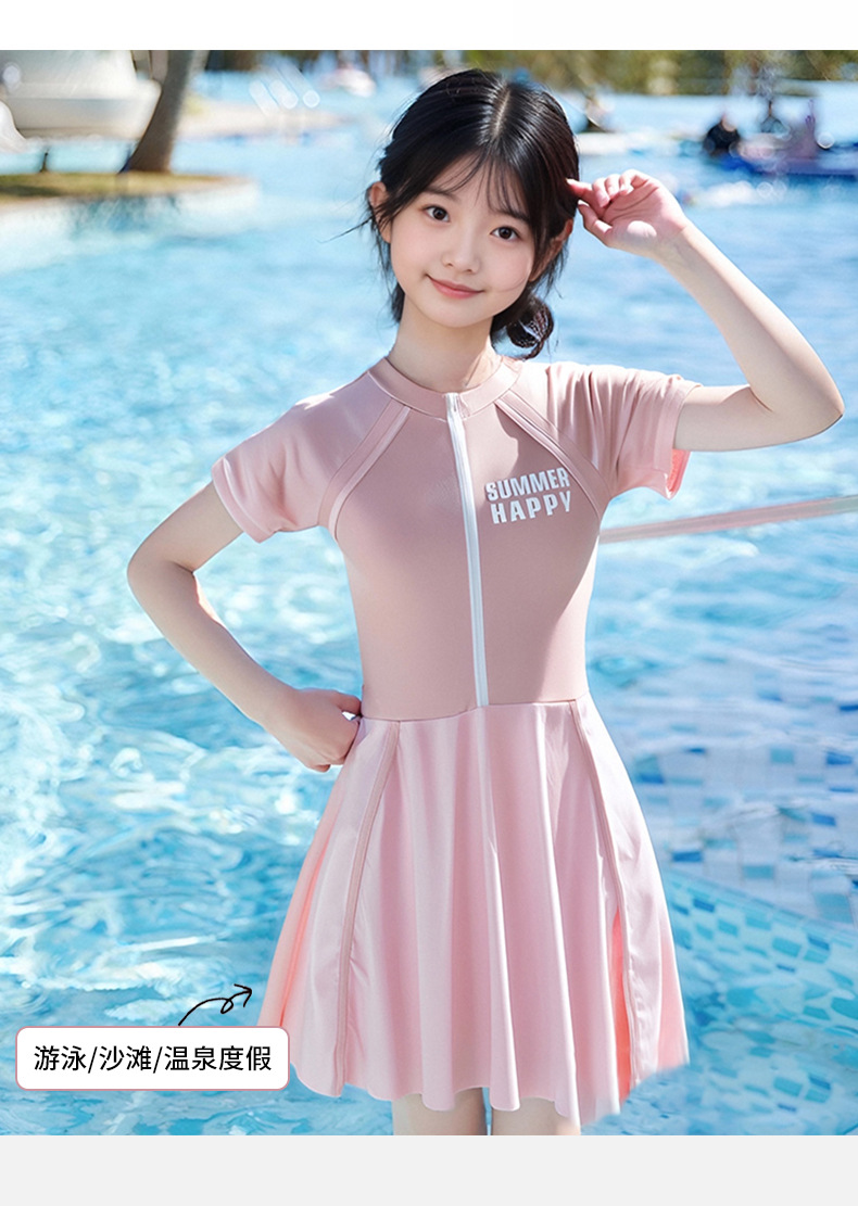 大童泳衣女童连体可爱公主粉裙式时尚平角训练温泉游泳装