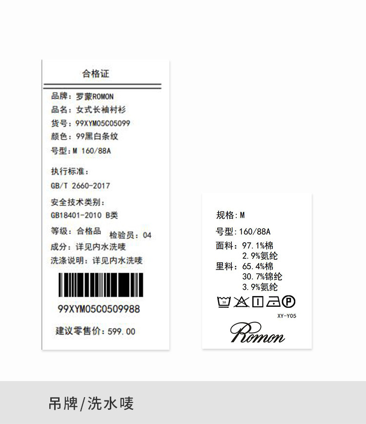 面料:97.1%棉 2.9%氨纶 里料:65.4%棉30.7%锦纶3.9%氨纶