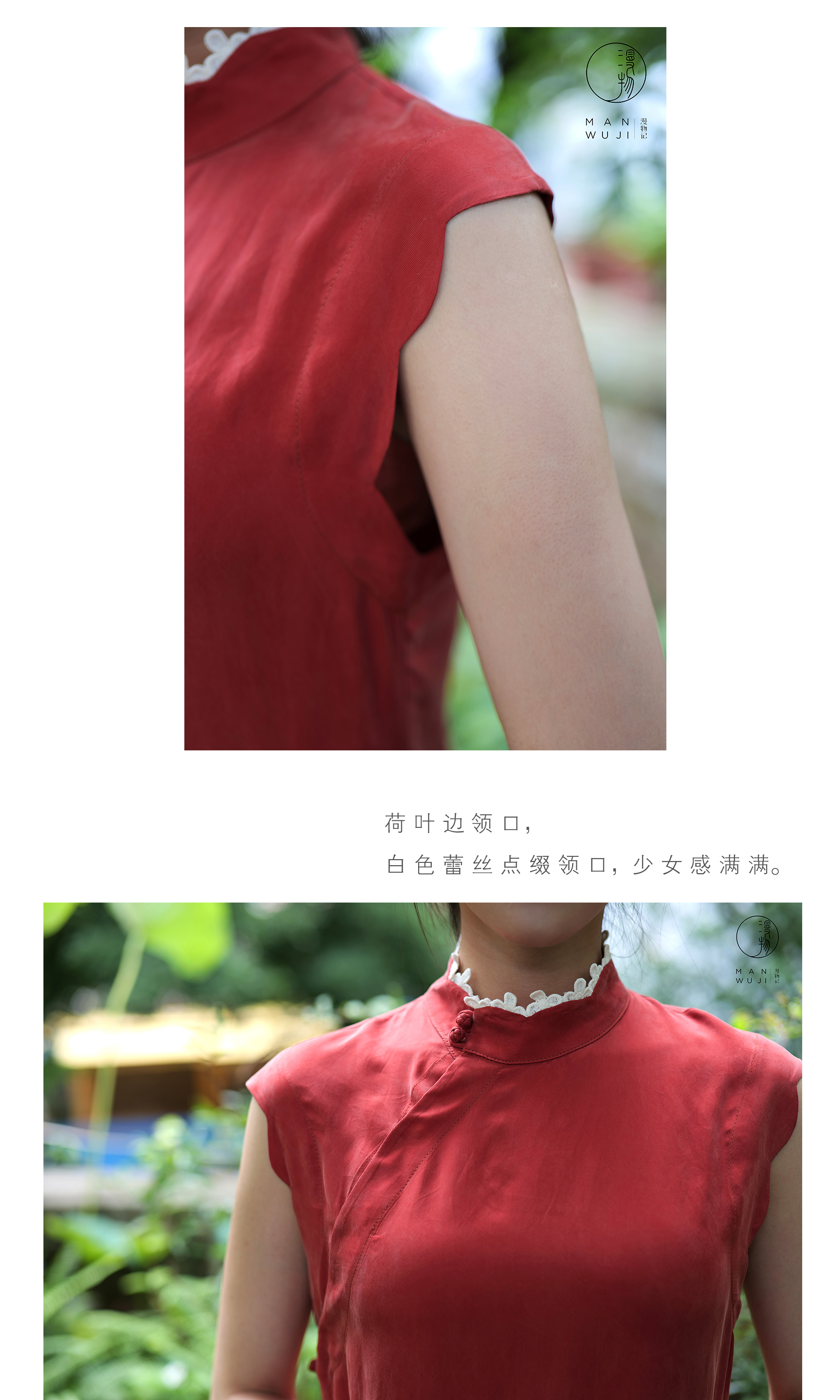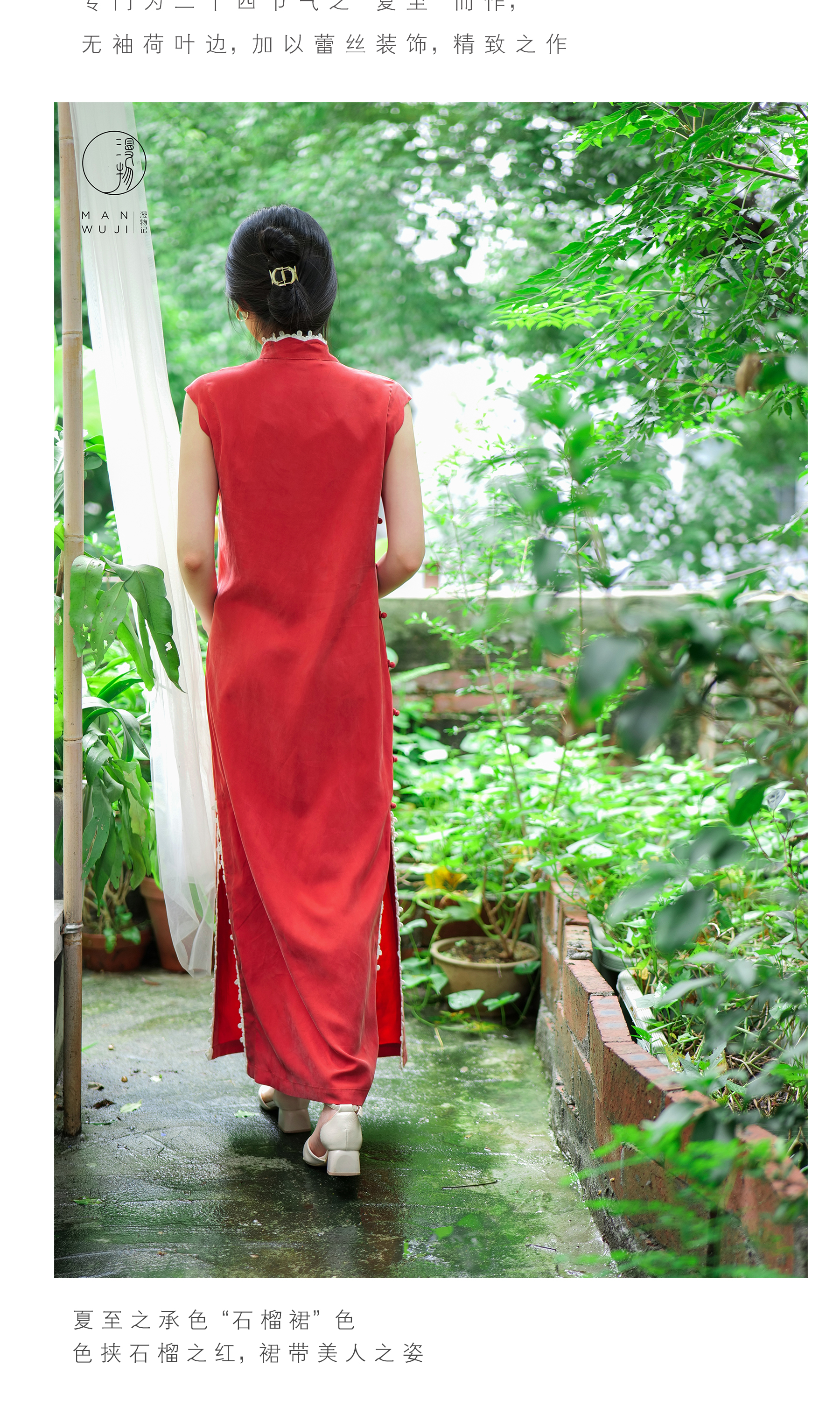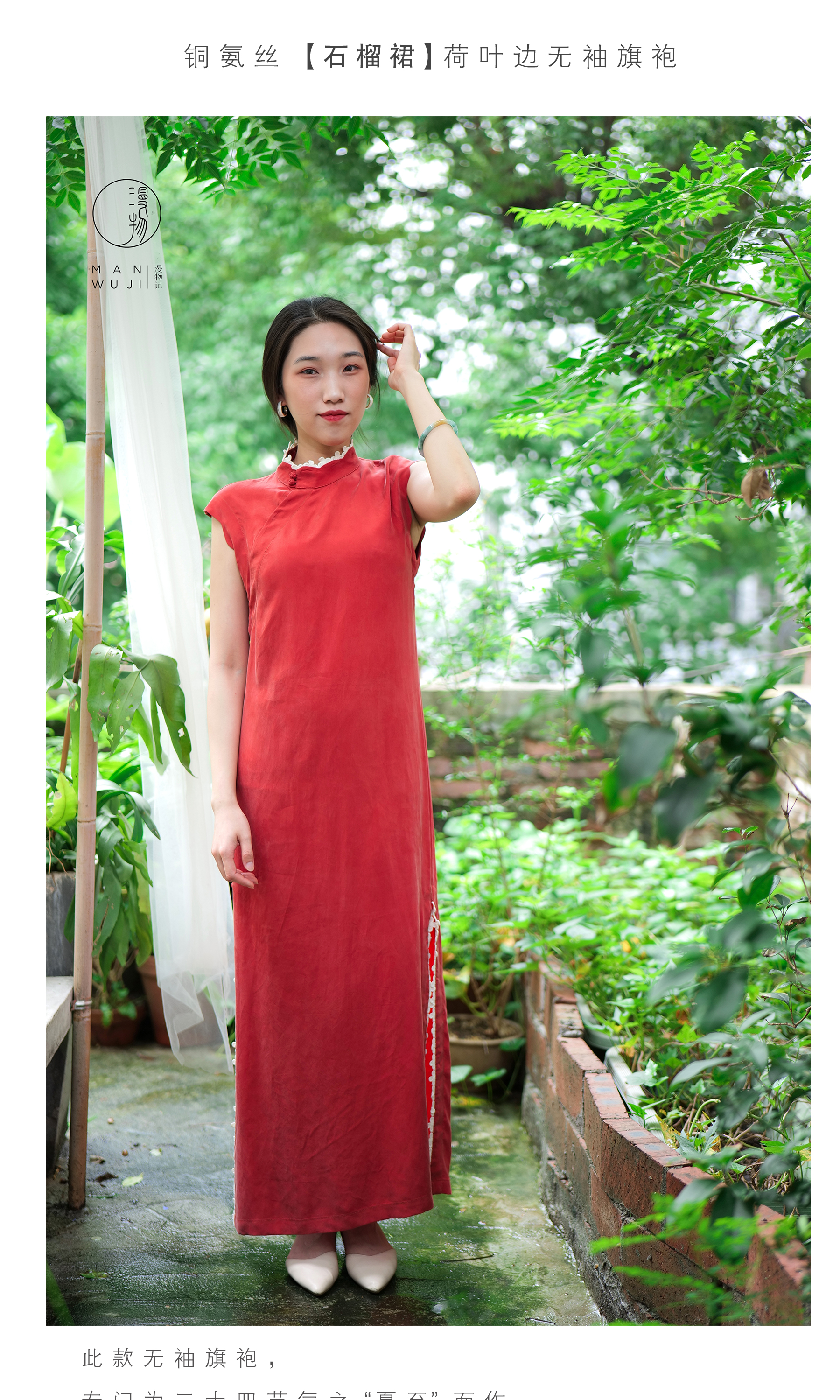 铜氨丝【石榴裙】荷叶边无袖旗袍