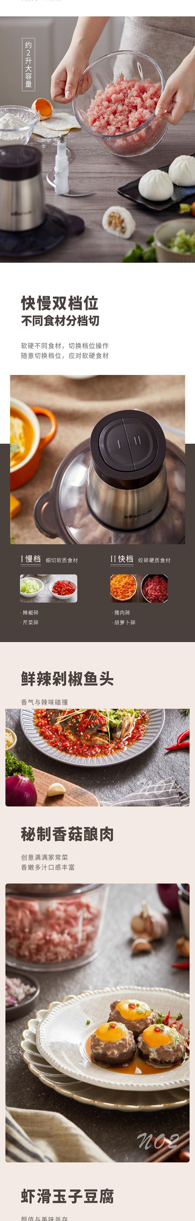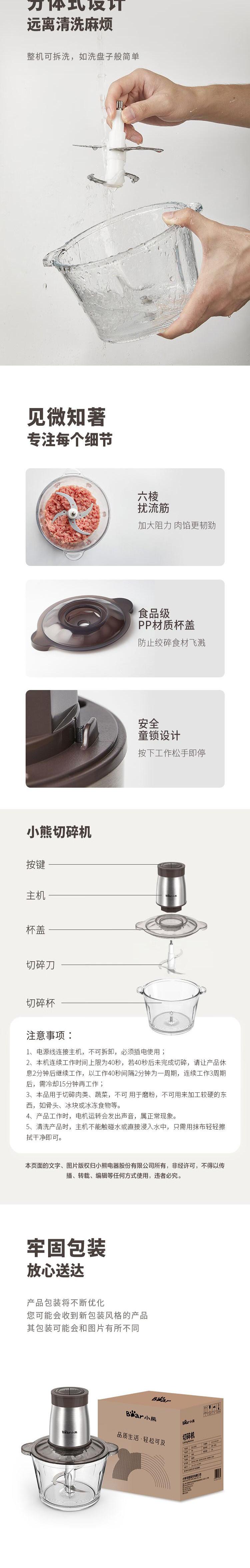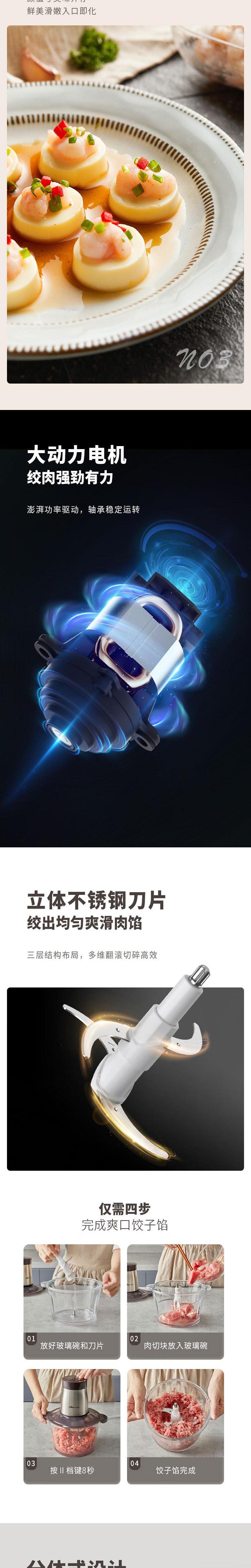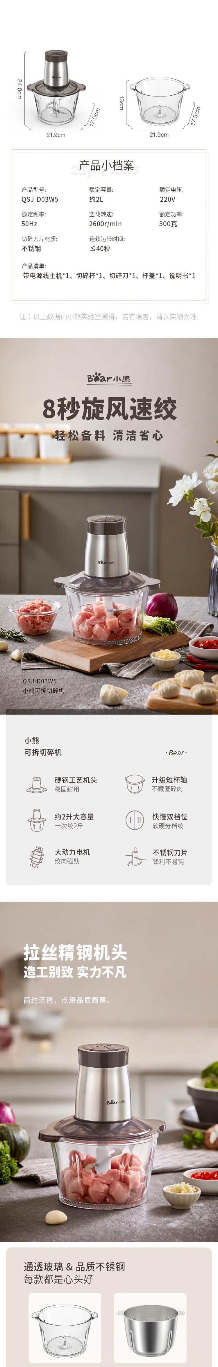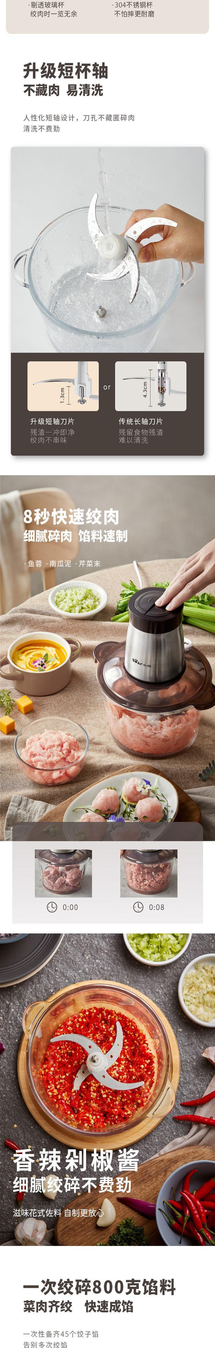 【自营】小熊(Bear)绞肉机家用电动多功能肉馅机婴儿辅食打肉机搅拌切菜 玻璃碗不锈钢刀头 QSJ-D03W5两档调速玻璃碗易清洗双层刀快切