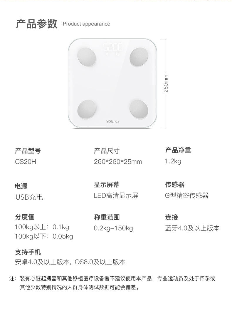 云康宝丨智能体脂称HUAWEI HiLink生态产品 CS20H-白色充电款