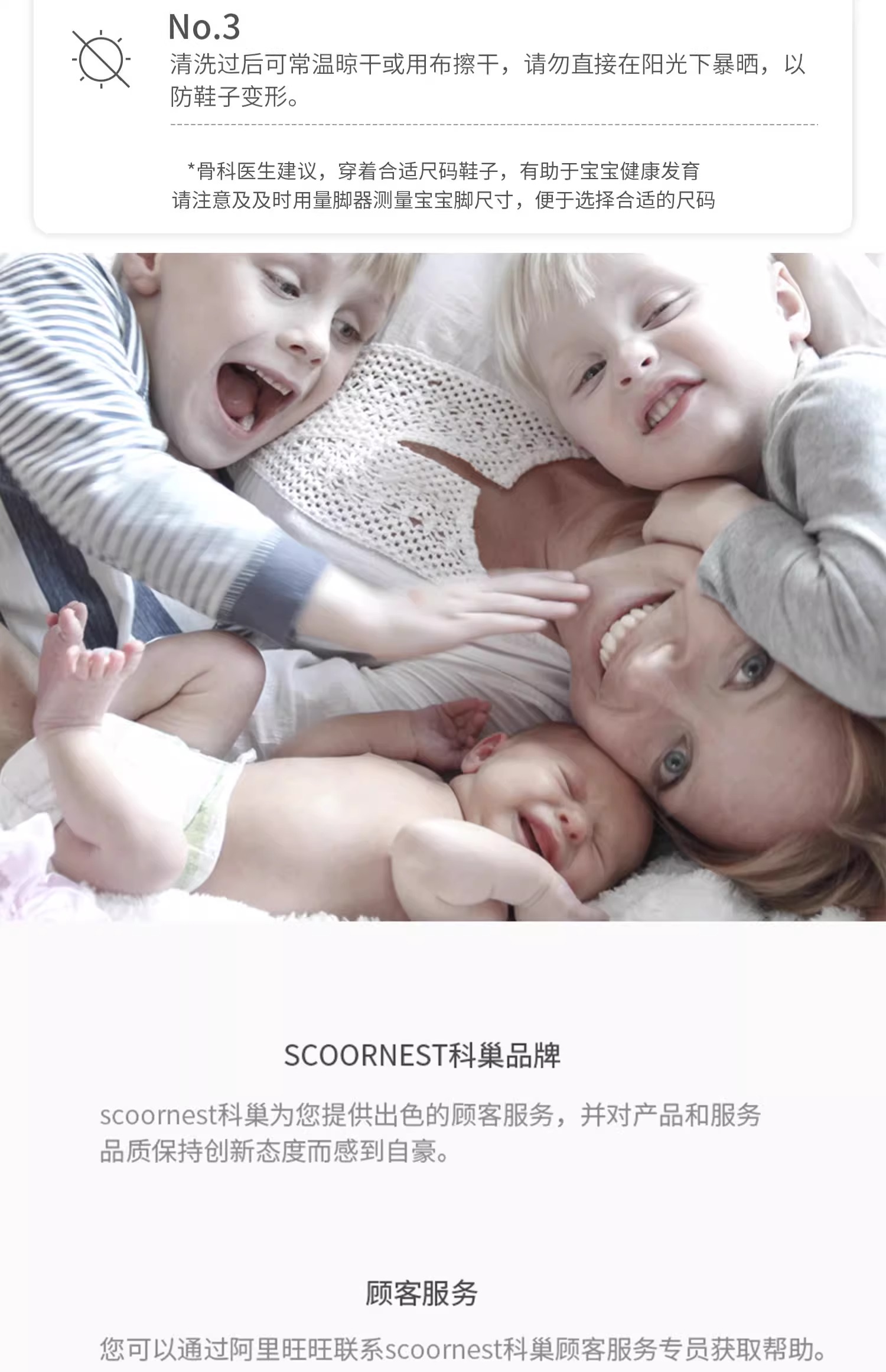 - Scoornest始终秉承给每一位宝宝送去科学的、关心的、创新的成长体验,通过提供商品和服务,使顾客形成守护、发展、巩固这种弥足珍贵的亲情的爱。