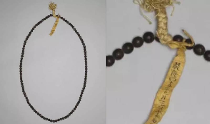 ▲“和珅呈”奇楠香念珠还带着黄签