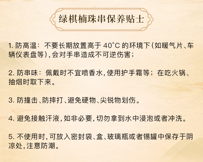 而且绿棋楠手串的香味,会随着不同人的佩戴,香味也会随之改变,戴的时间越长,越油润,品相也变得更好。