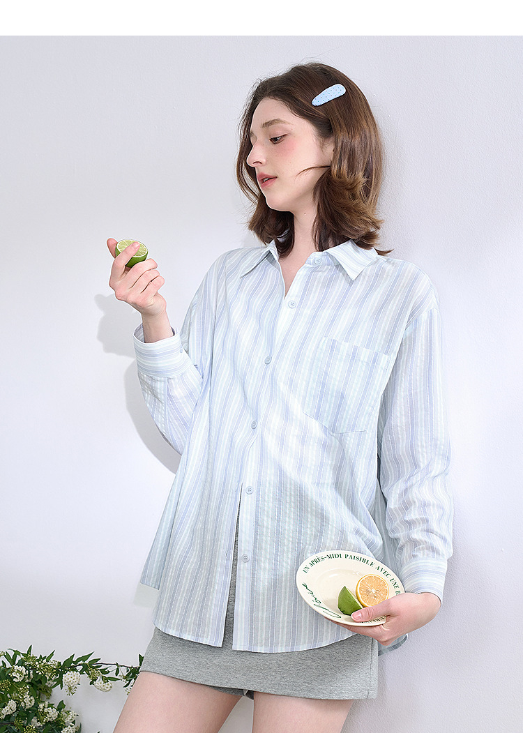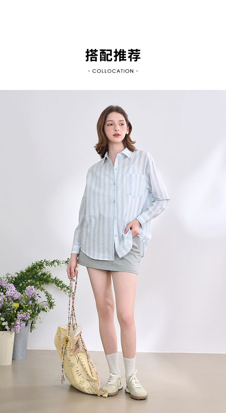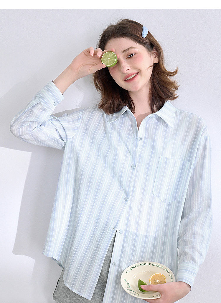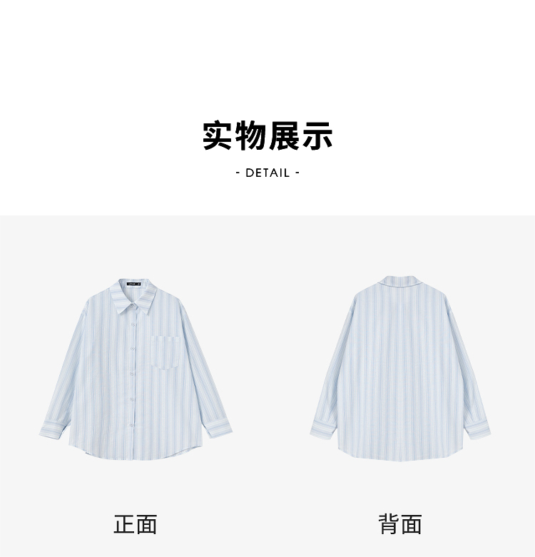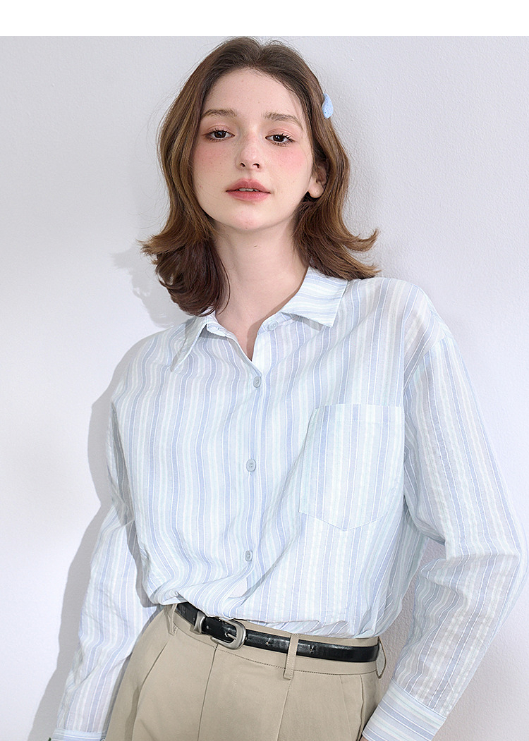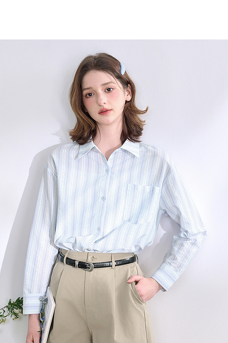 文艺感清爽撞色条纹长袖衬衫女2025春夏慵懒随性宽松衬衣V0850600