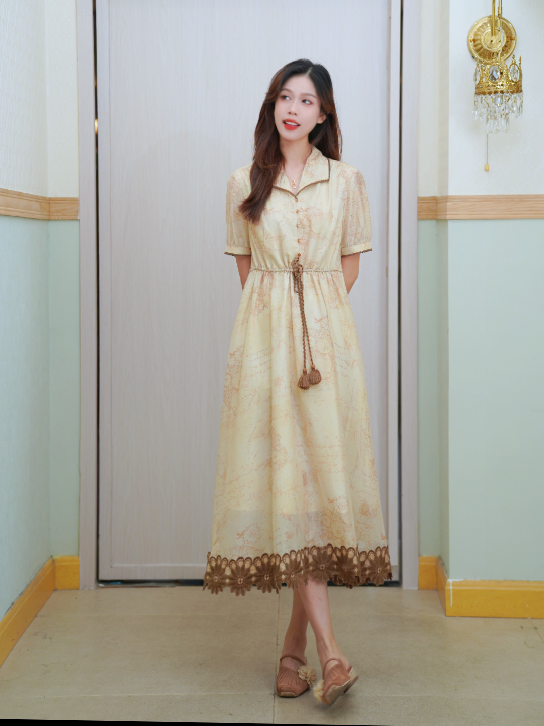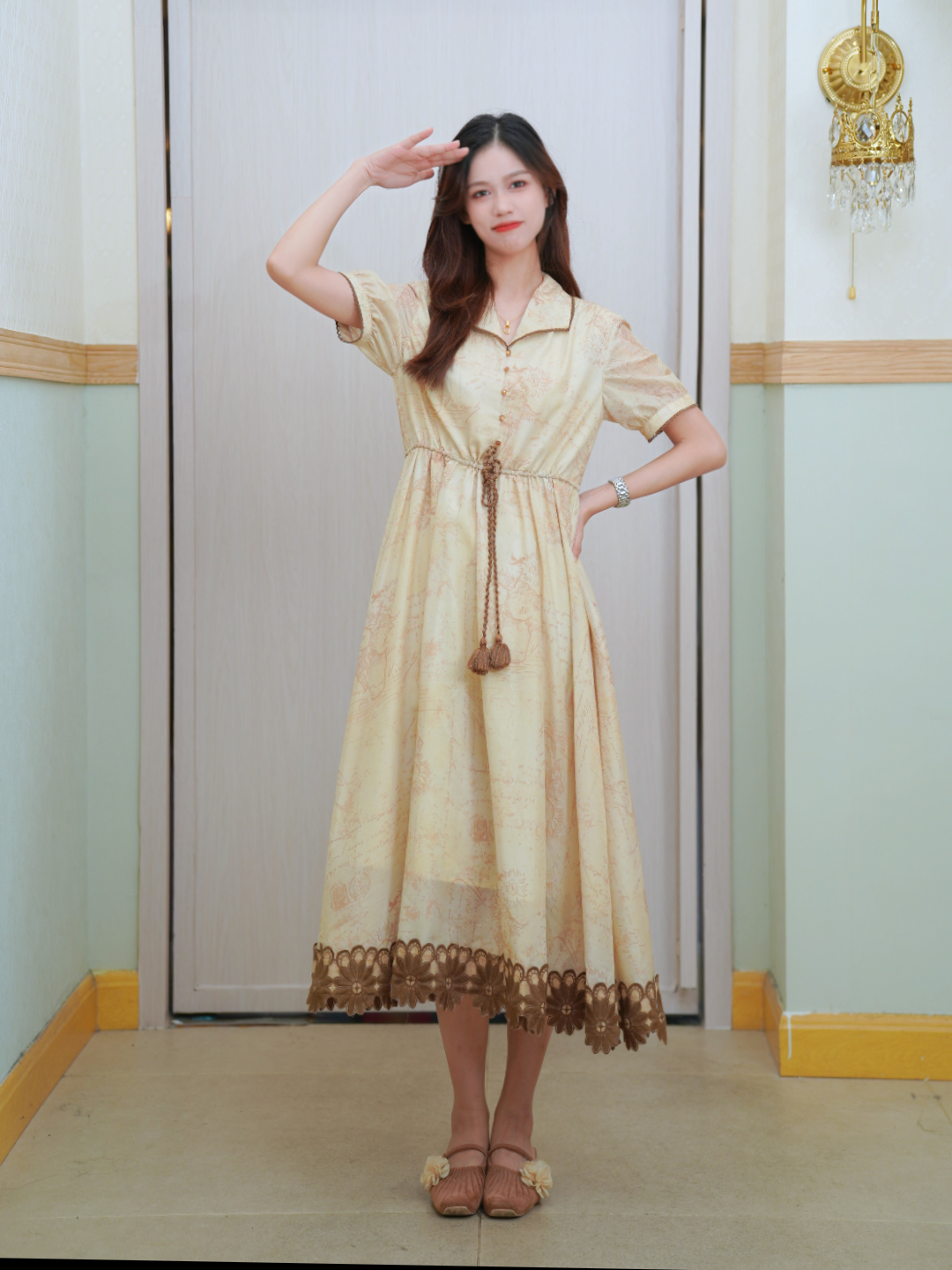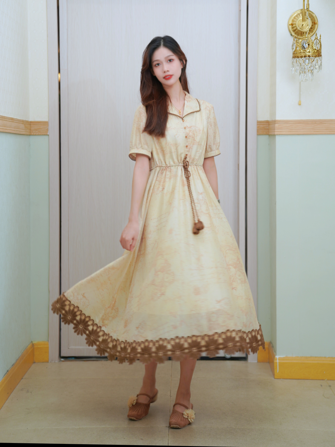 两三事梵高文艺 琉璃年华 2024夏季新款绣花边裙摆印花绑带连衣裙