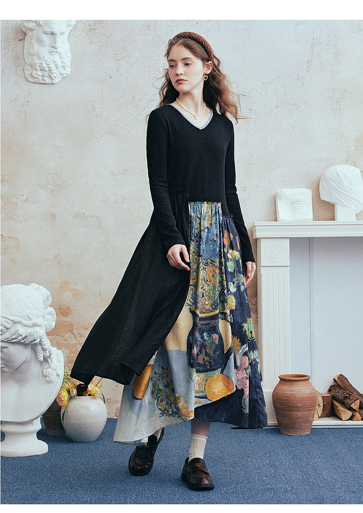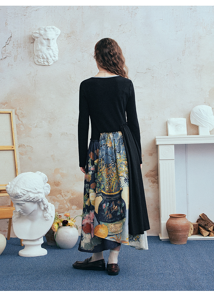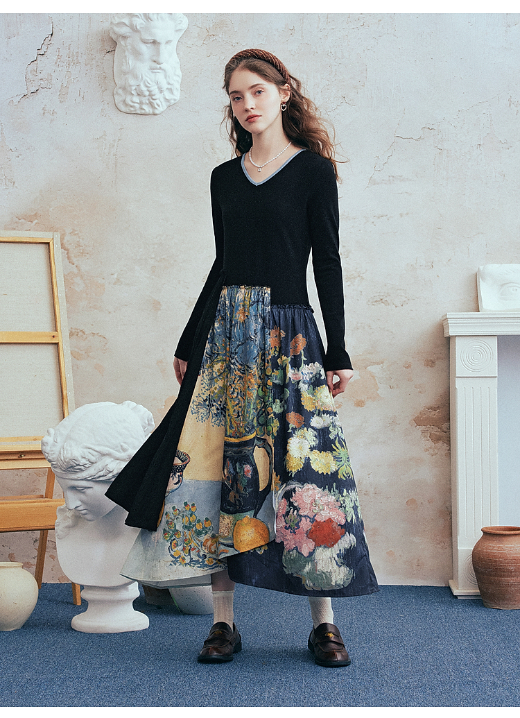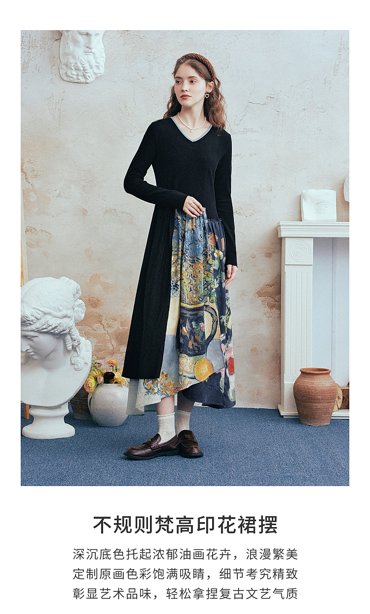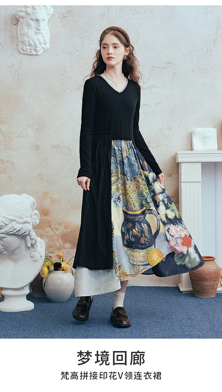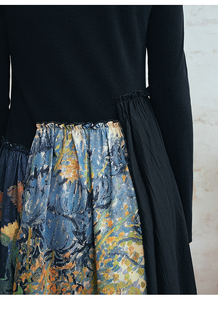两三事梵高文艺 梦境回廊 2026春季新款印花拼接不规则裙摆连衣裙