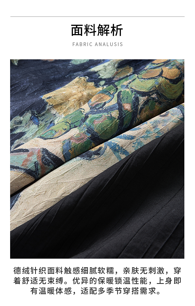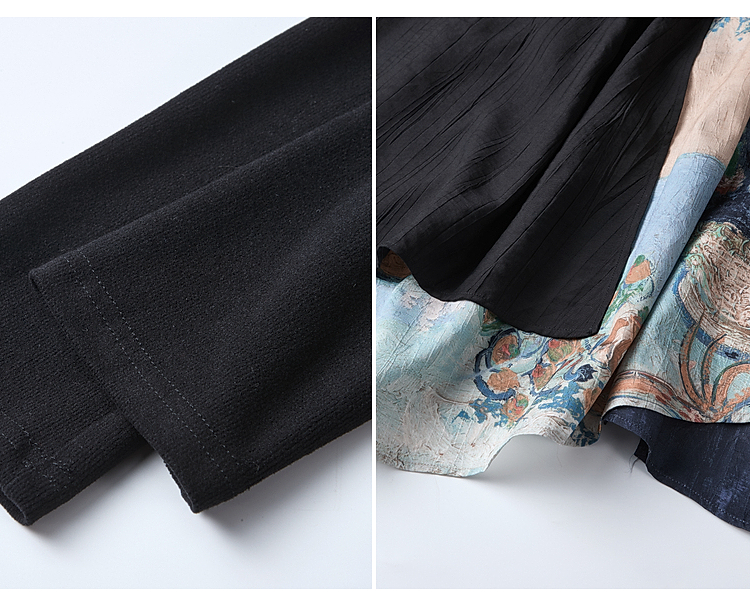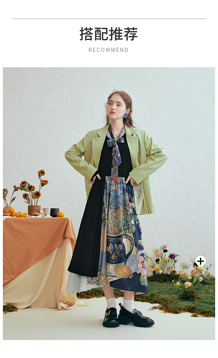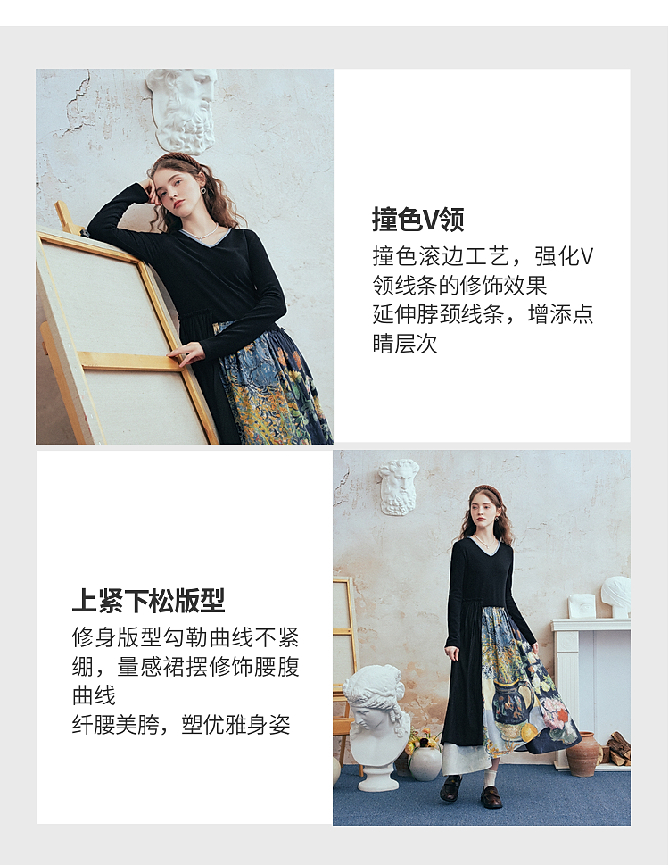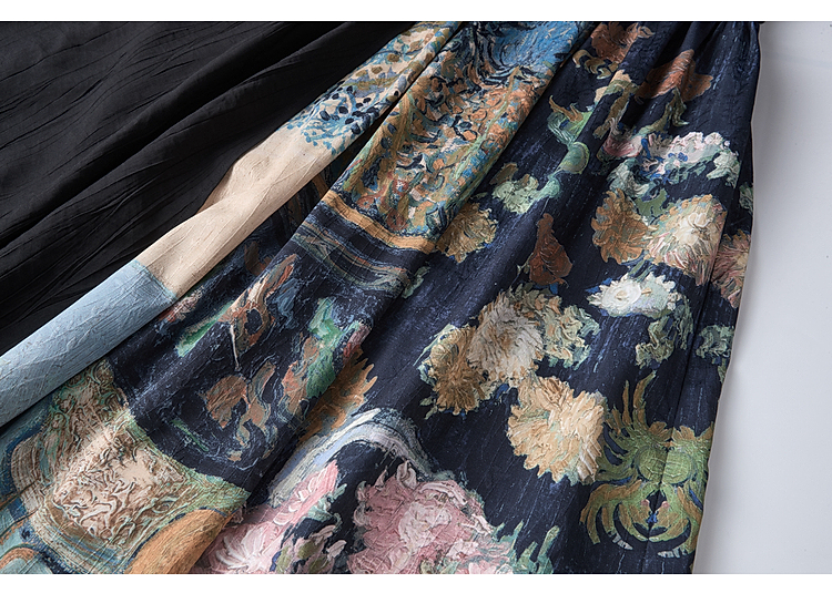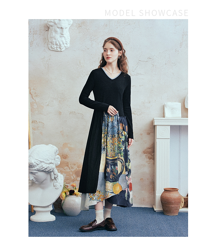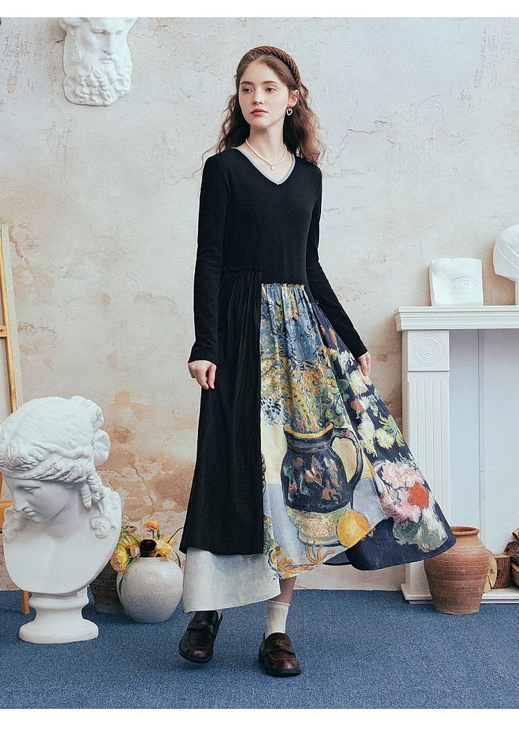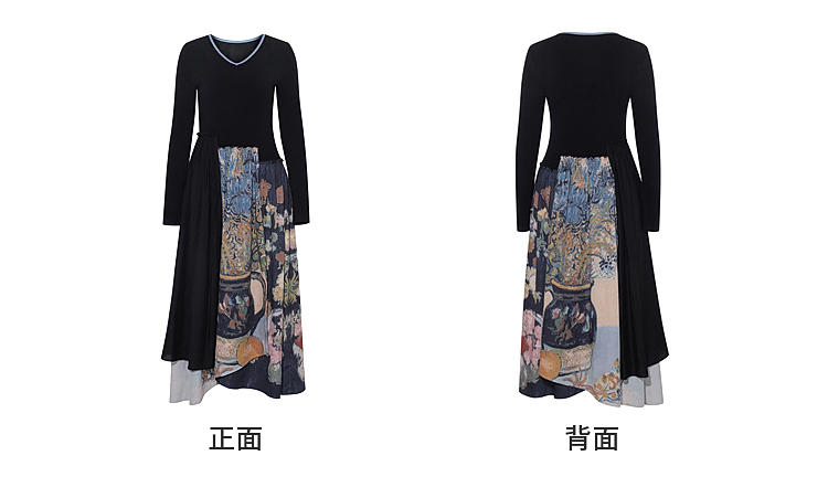 两三事梵高文艺 梦境回廊 2026春季新款印花拼接不规则裙摆连衣裙