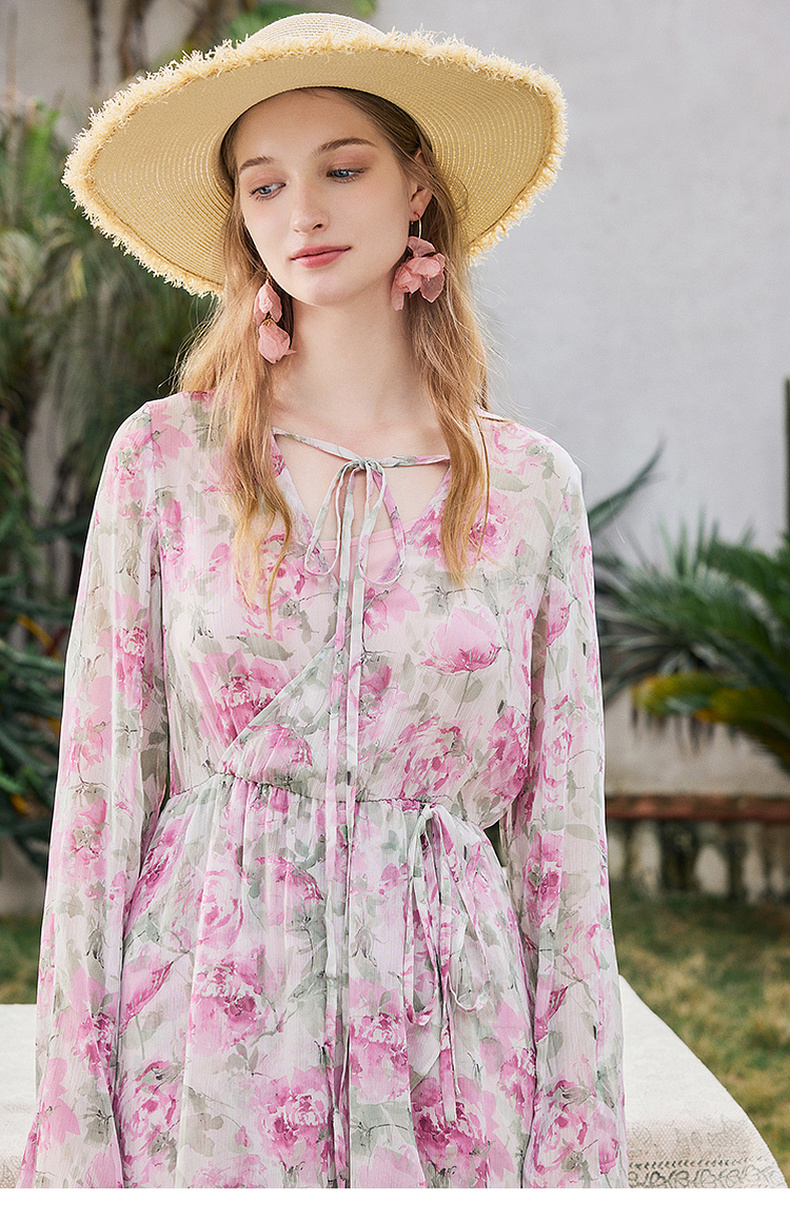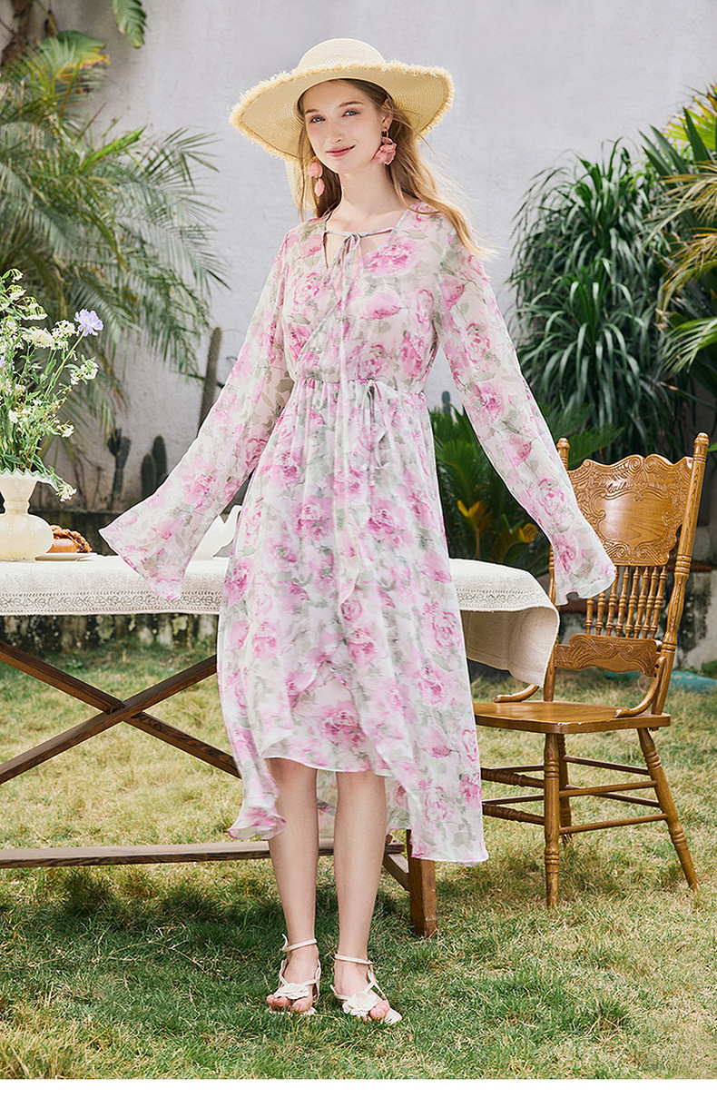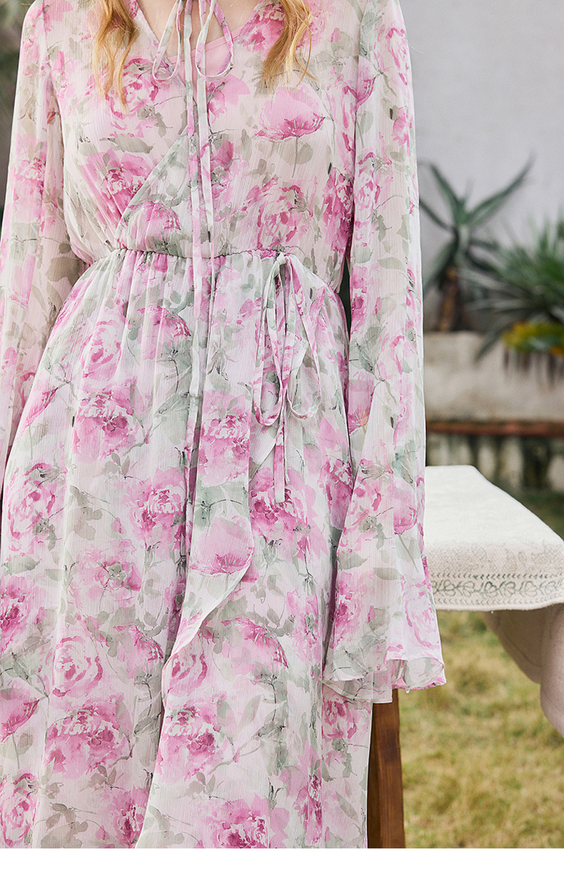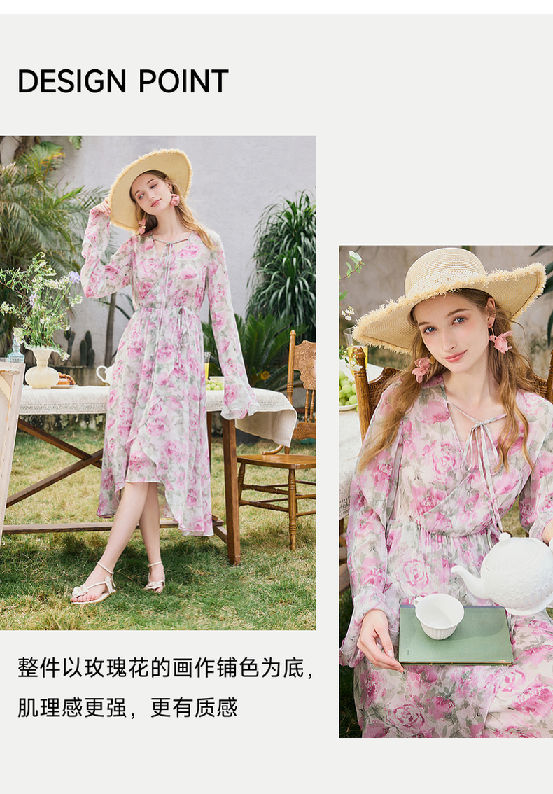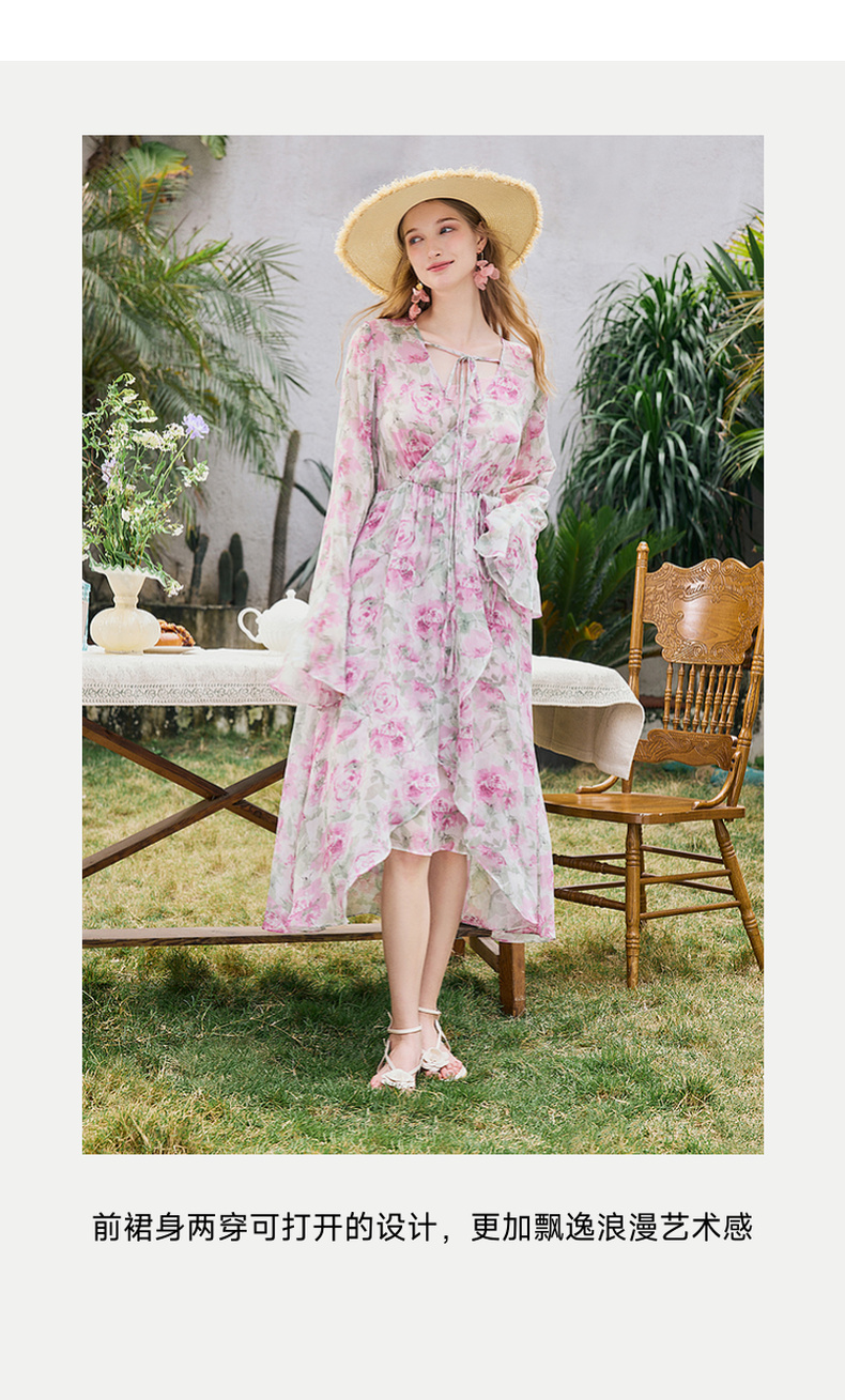 两三事花酿馨香2024夏季新款法式玫瑰印花绑带雪纺连衣裙
