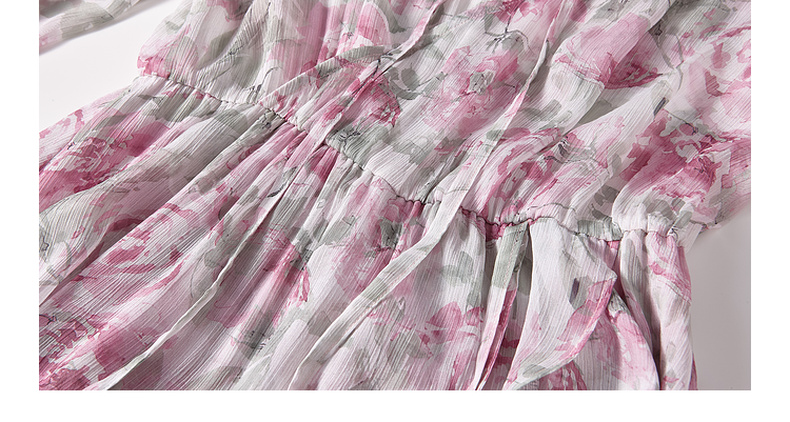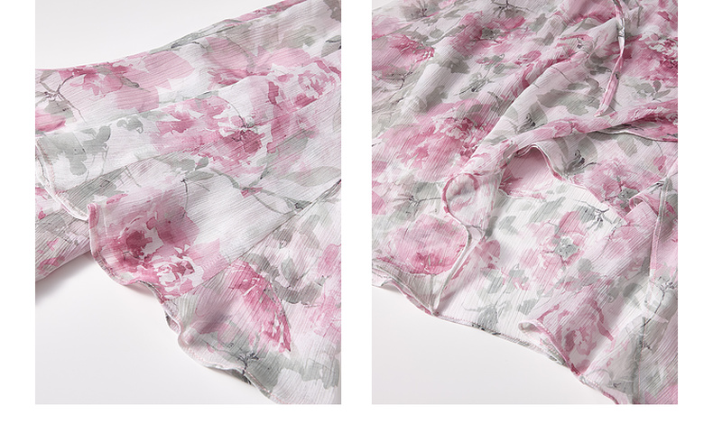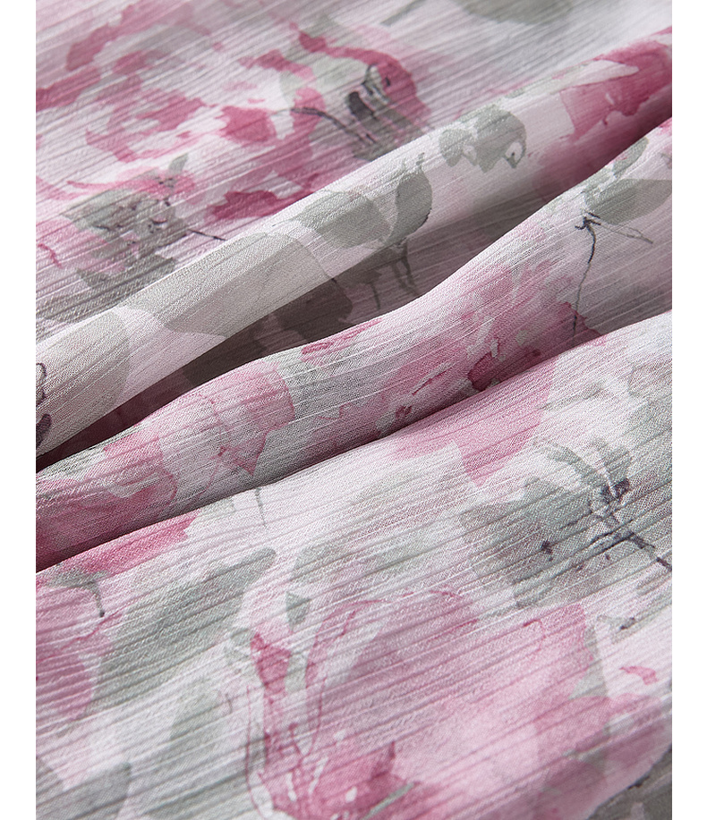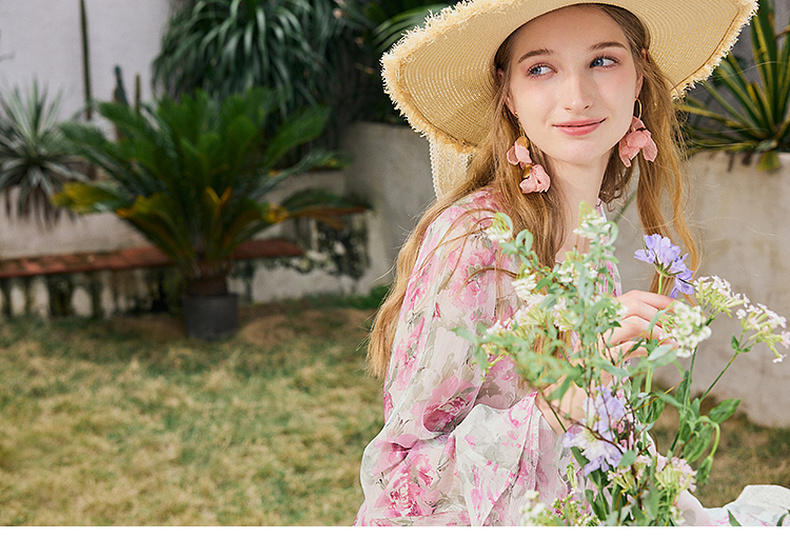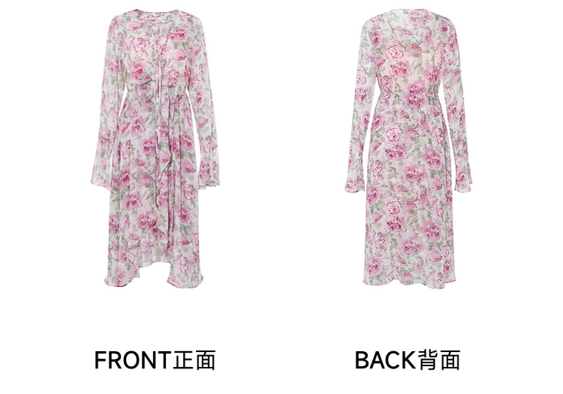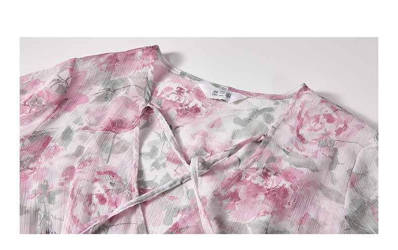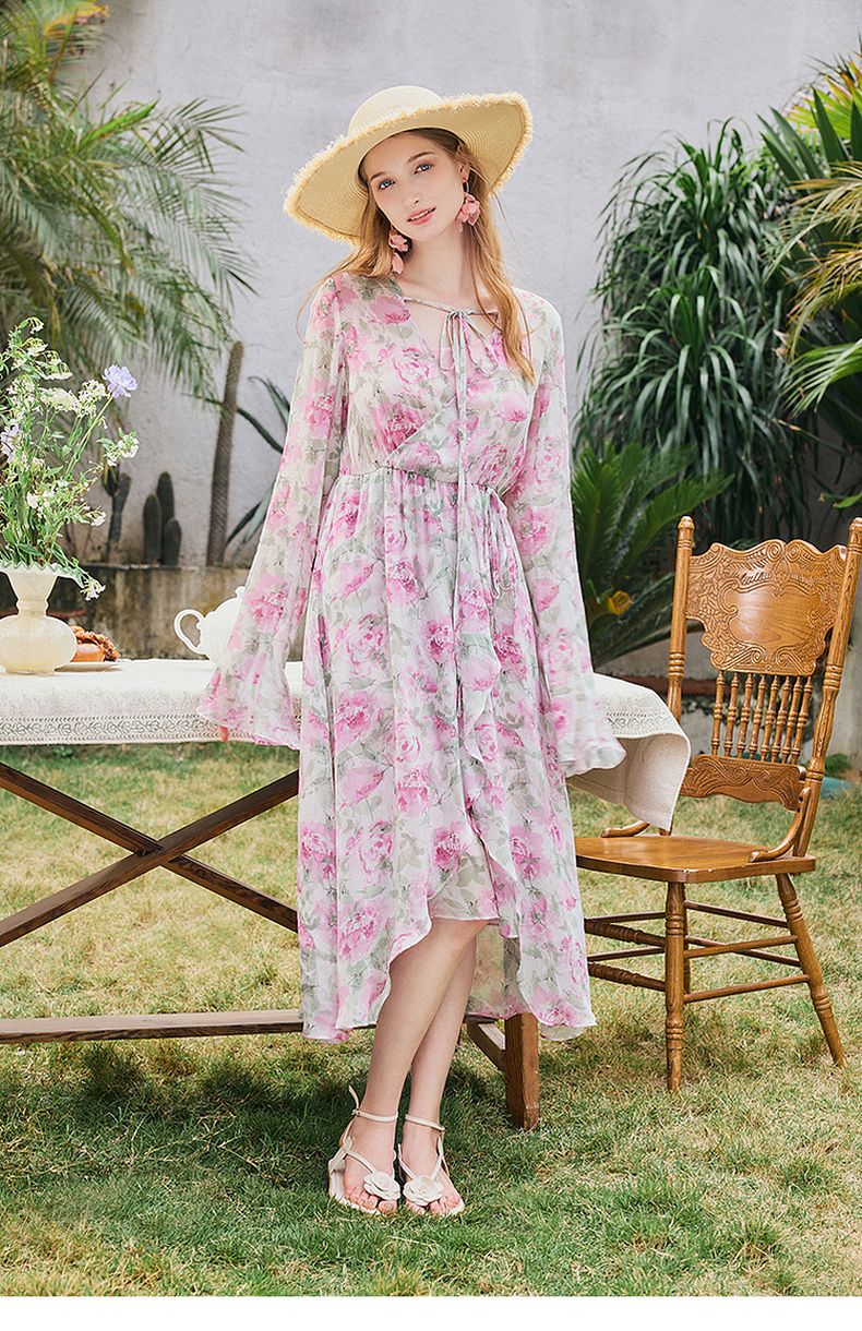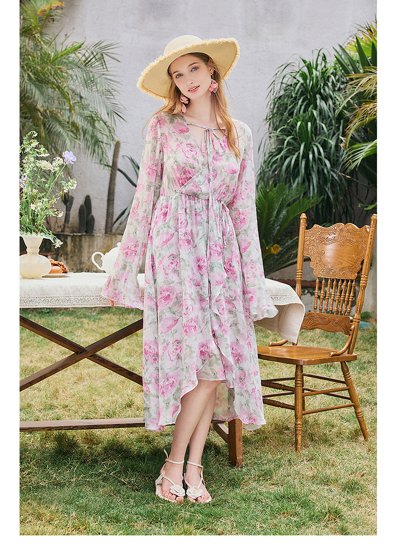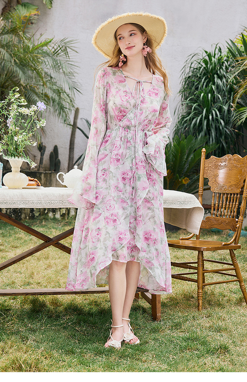 两三事花酿馨香2024夏季新款法式玫瑰印花绑带雪纺连衣裙