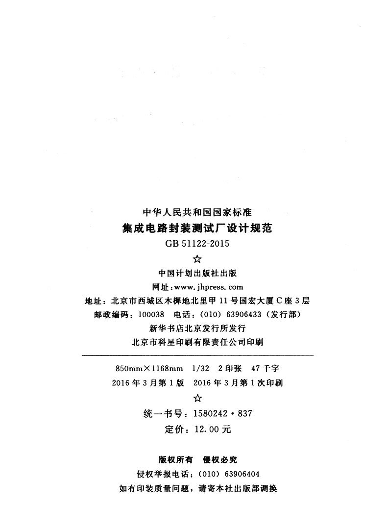 书名:GB 51122-2015 集成电路封装测试厂设计规范