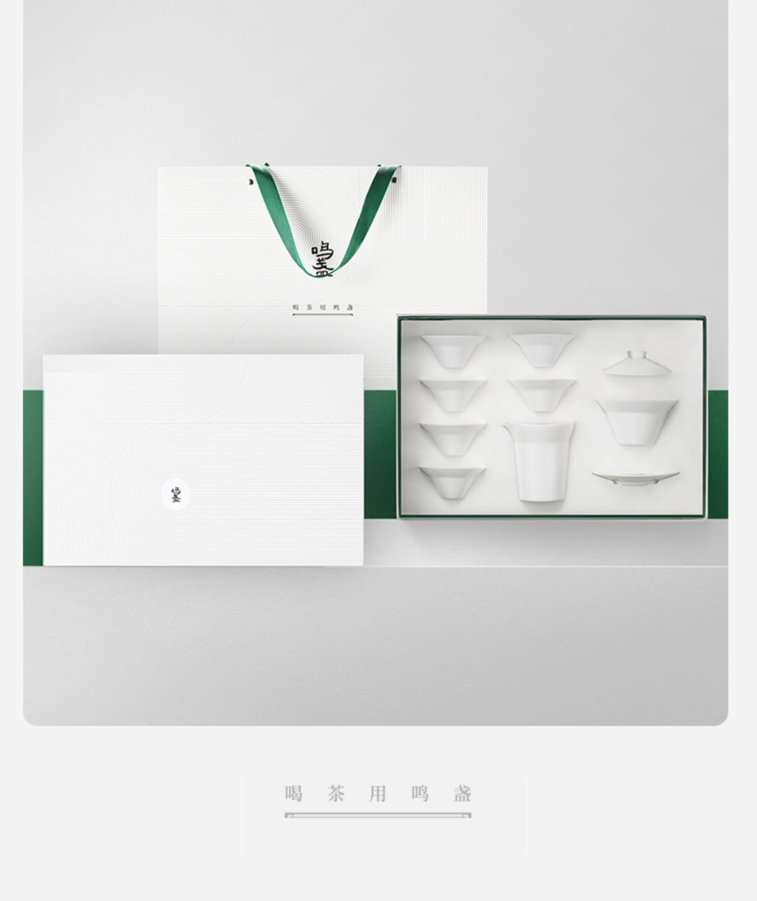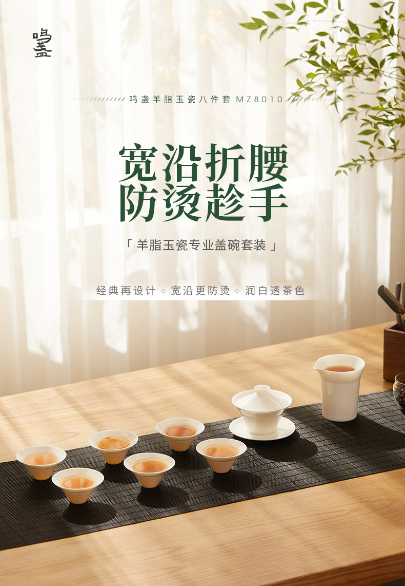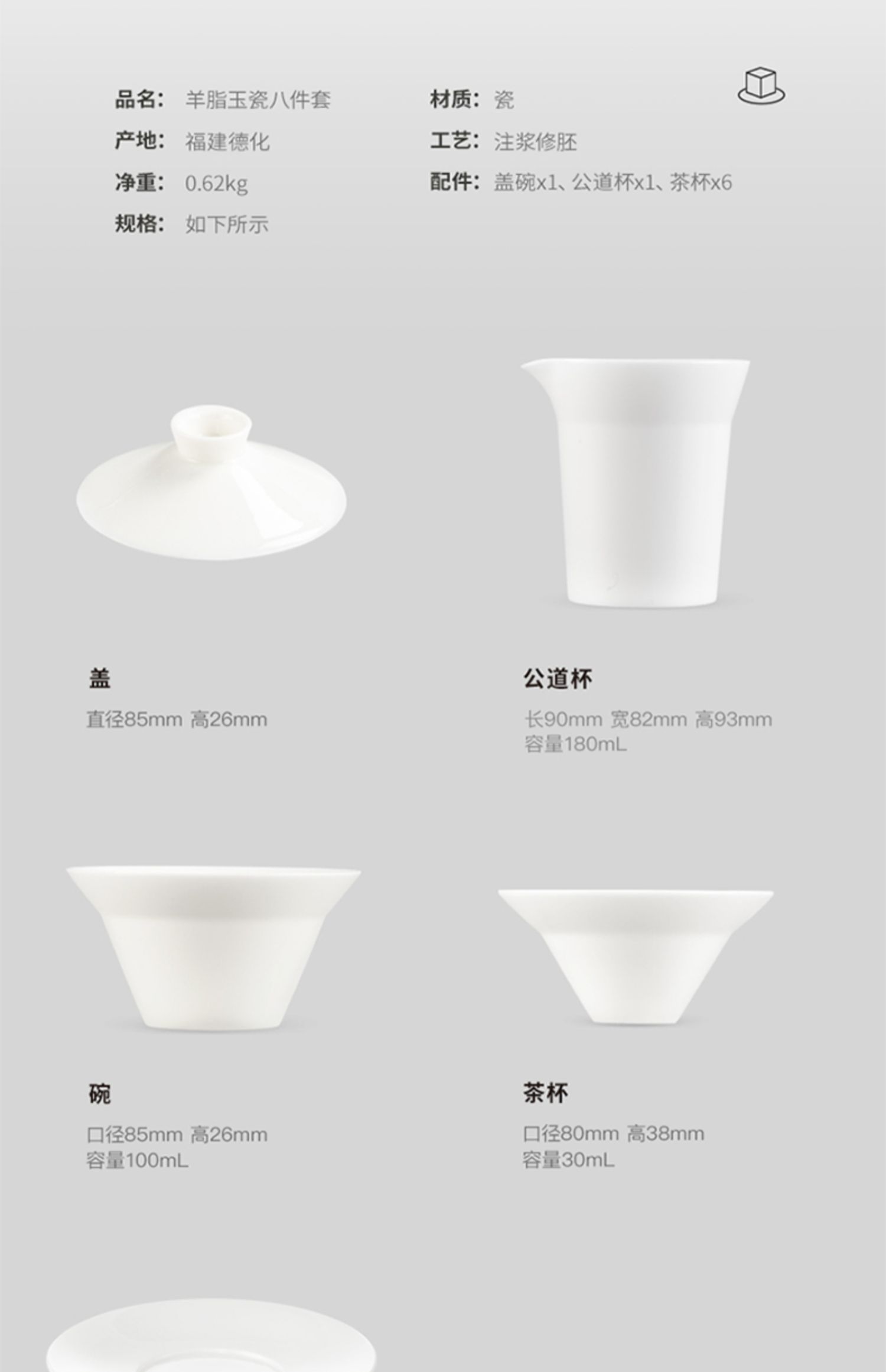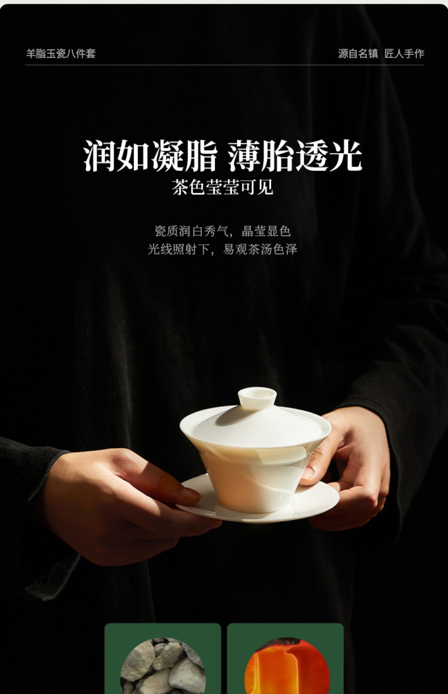 【鸣盏羊脂玉瓷茶具八件套】家用功夫茶具盖碗品茗杯公道杯泡茶套装