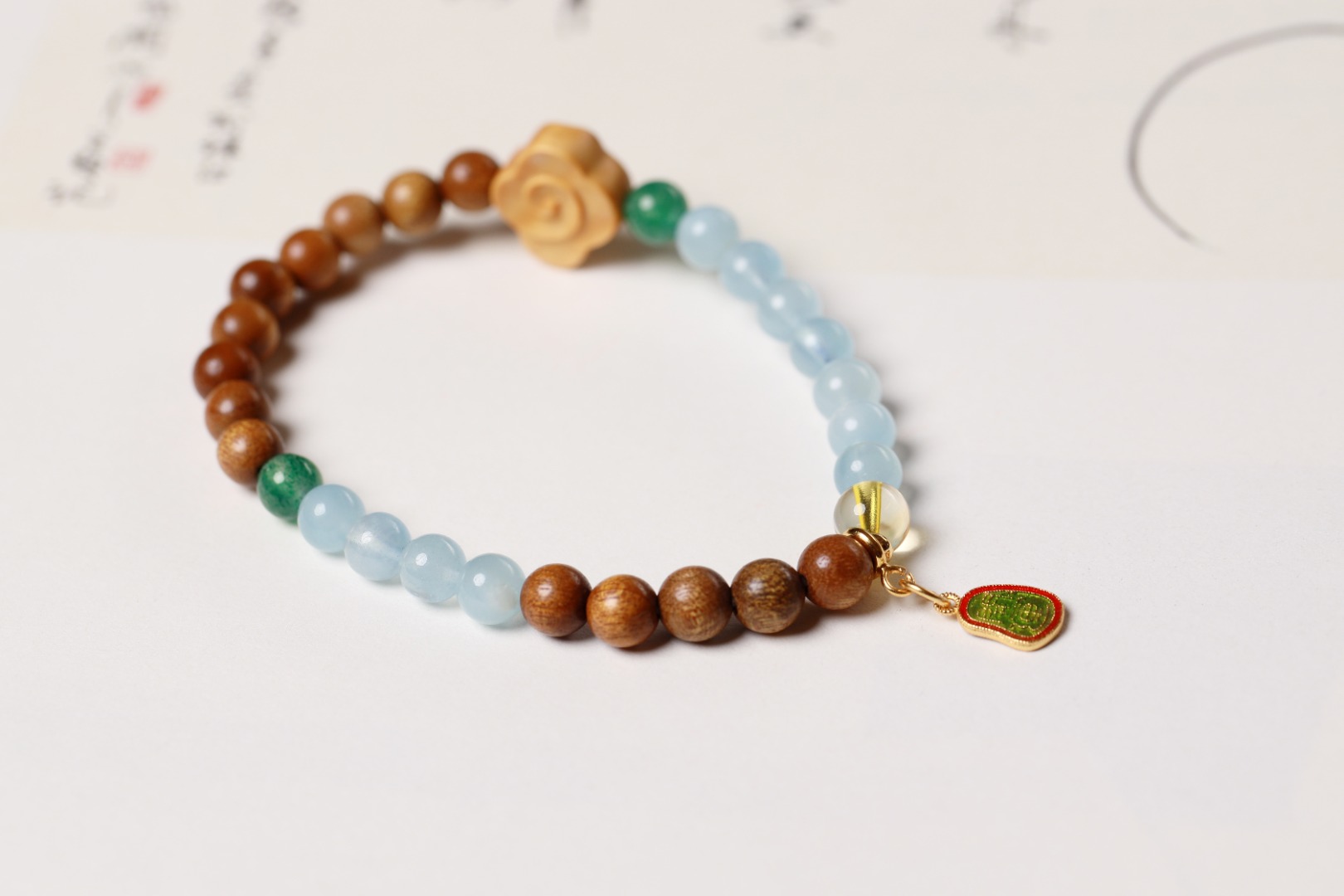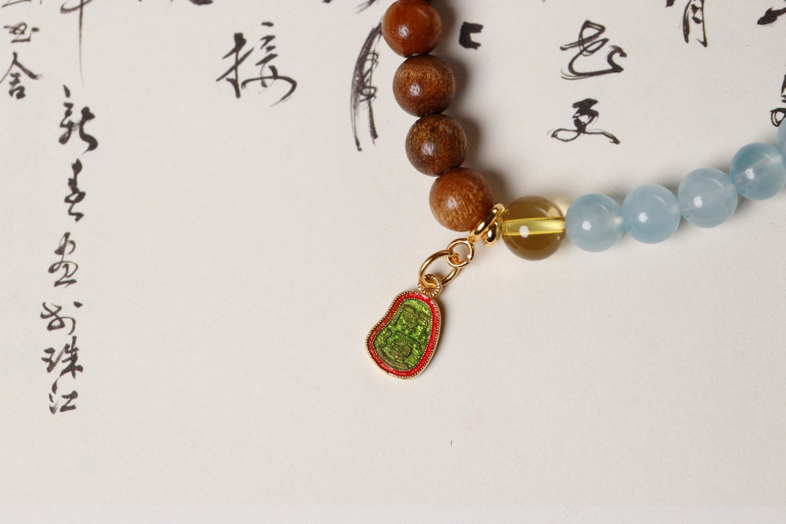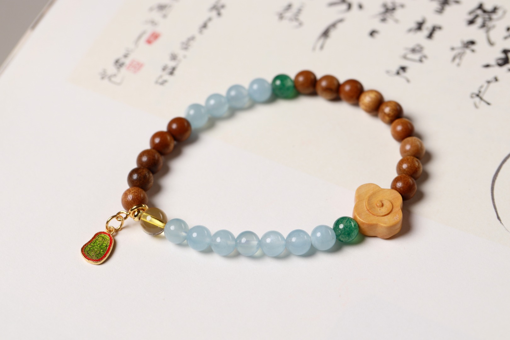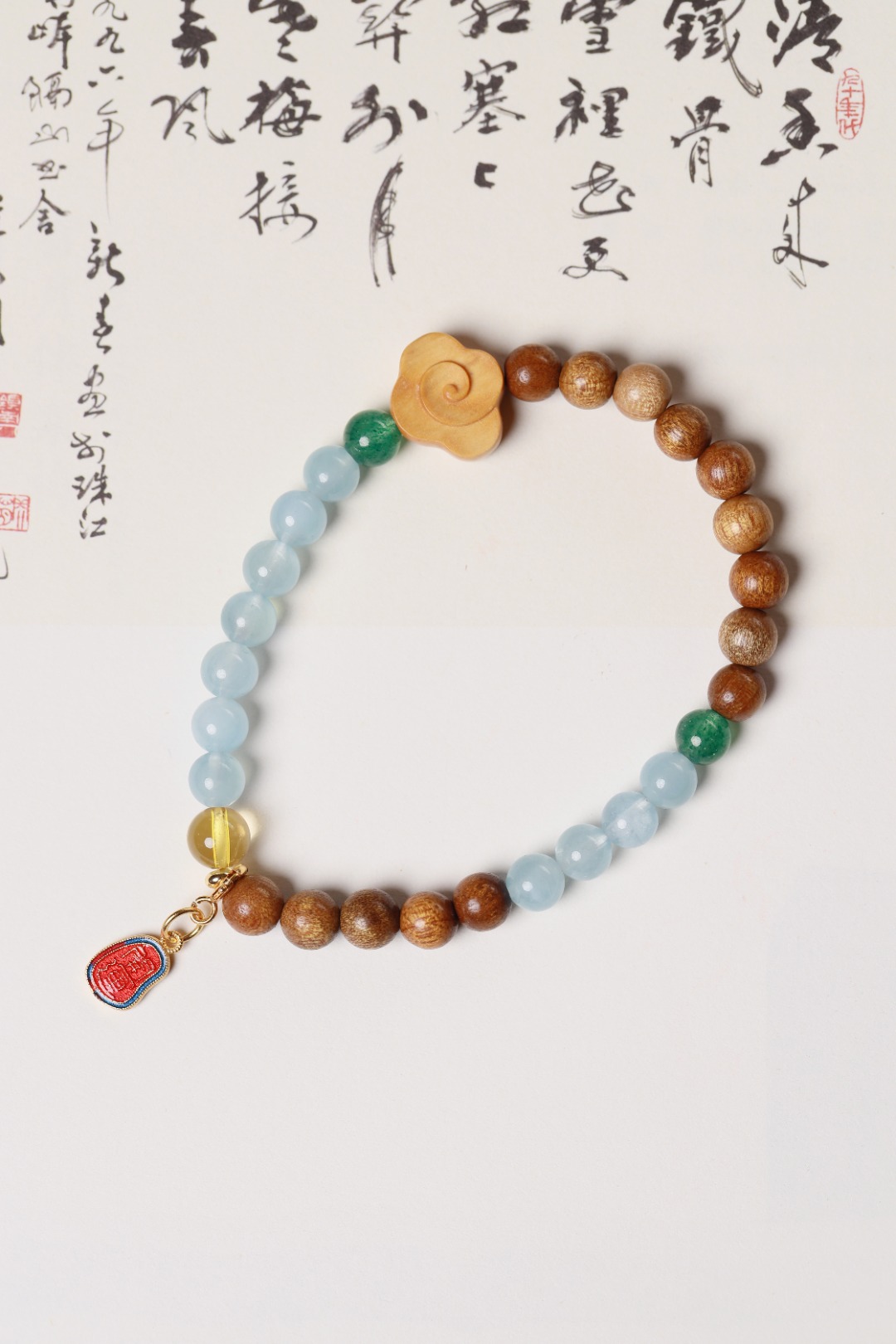 山与海的恋歌,沉稳的金丝楠木珠搭配海蓝宝和绿草莓,尽显温柔,是一束白月光照在心头,温婉甜美。再配上银镀24K开运,仿佛是来自大海人鱼公主的召唤,唯美又诗意!