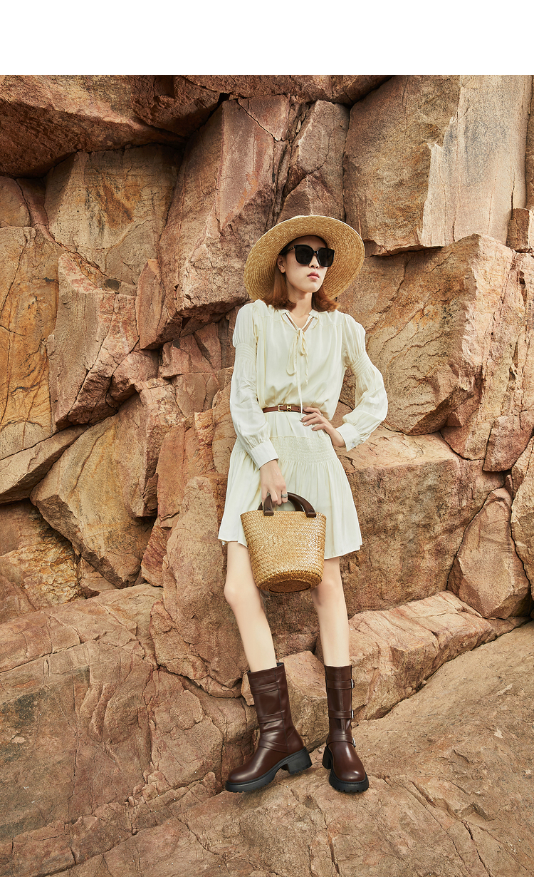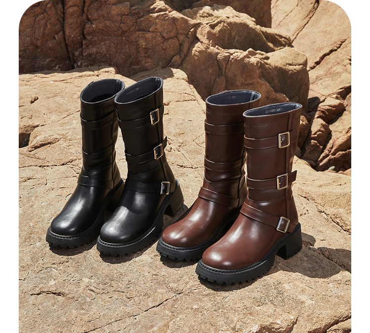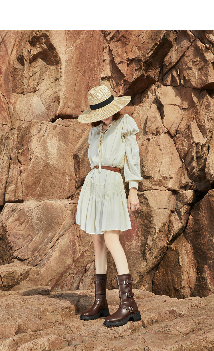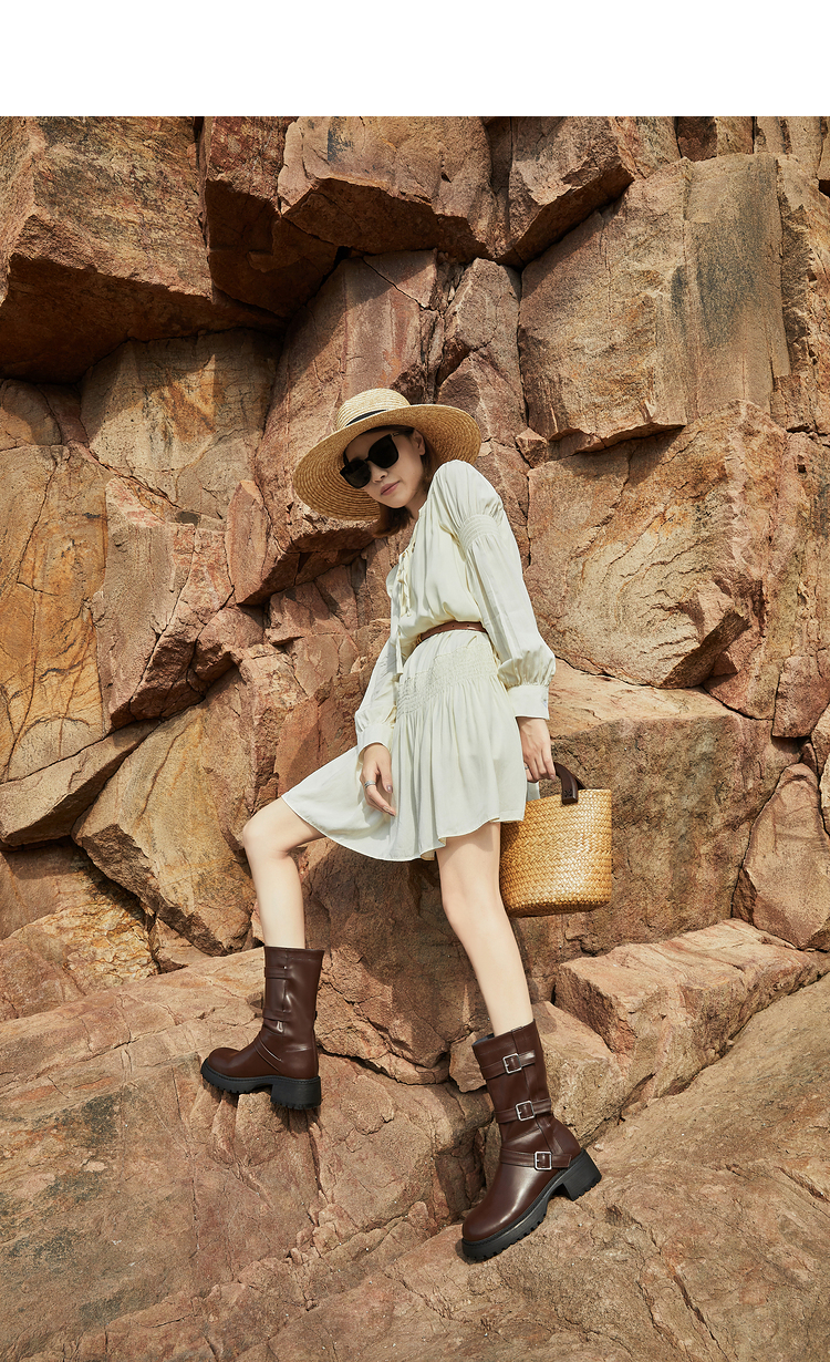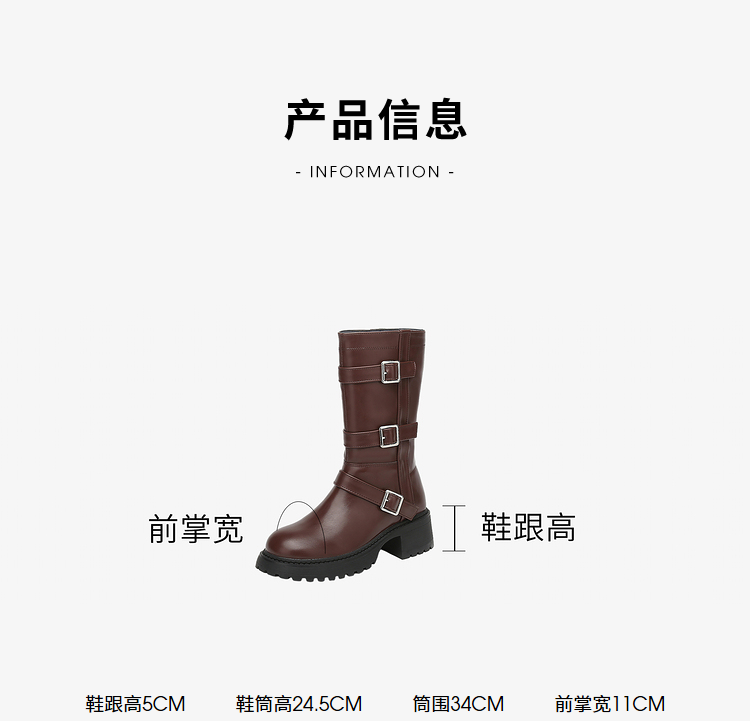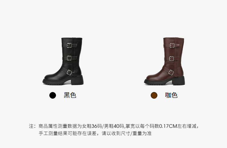 西遇中筒骑士靴女新款秋冬复古搭扣西部牛仔靴增高厚底马丁靴D2134220