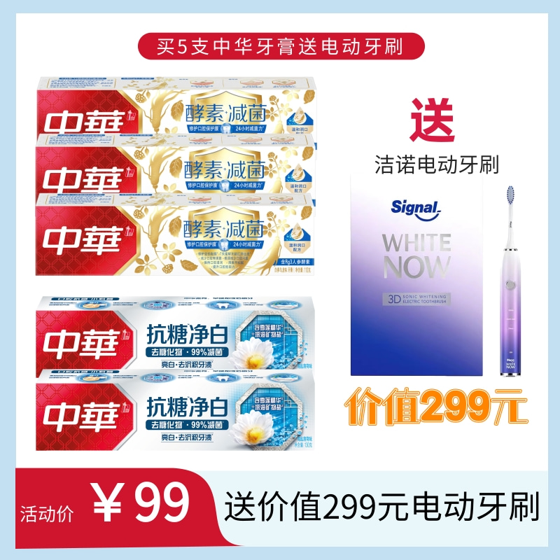 中华酵素牙膏110g3支+中华抗糖牙膏140g2支 送洁诺电动牙刷一套