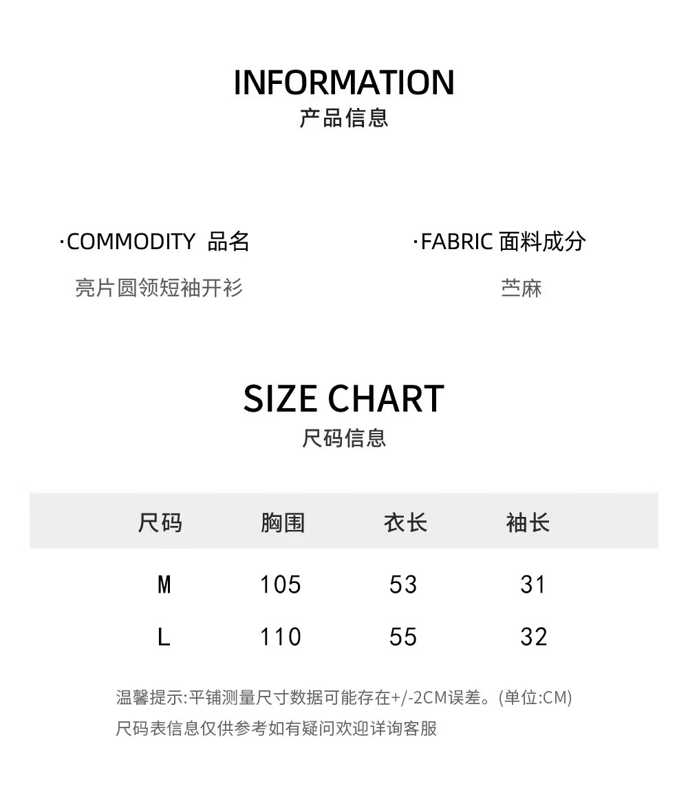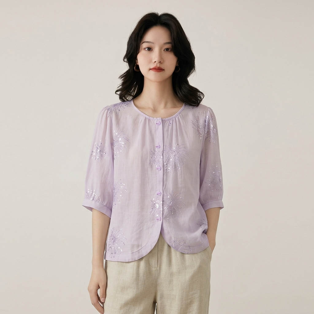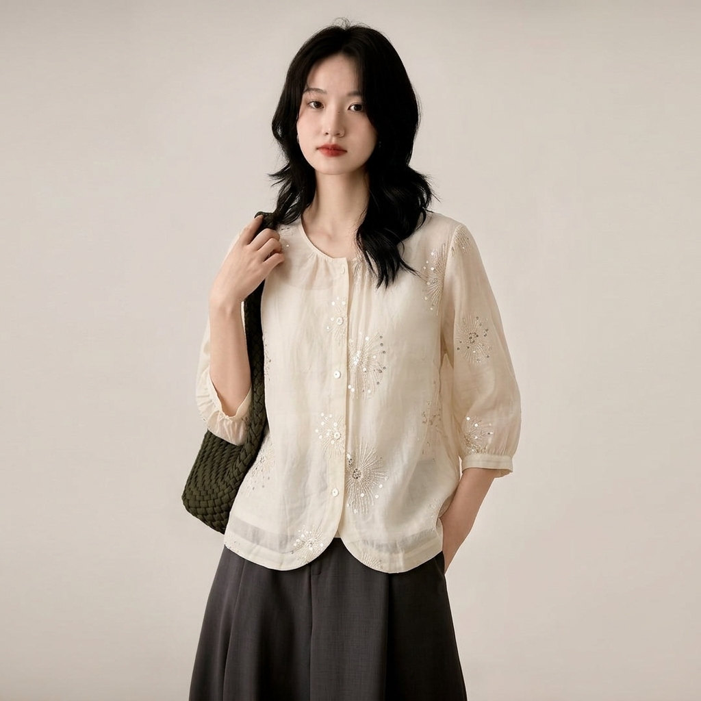 文艺珠绣~苎麻刺绣亮片圆领短袖衬衫女 凉感透气薄款衬衣ZMCR684