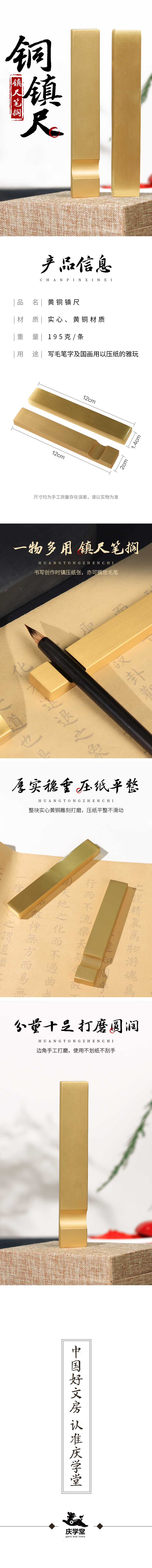 【庆学堂】黄铜镇纸 镇尺 实心黄铜镇纸有槽 镇纸笔搁 多用镇尺 书房雅玩 黄铜摆件
