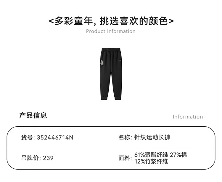安踏儿童长裤男大童天竹纤维户外系列针织运动长裤352446714N