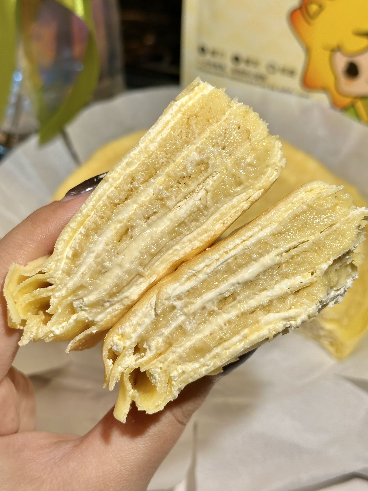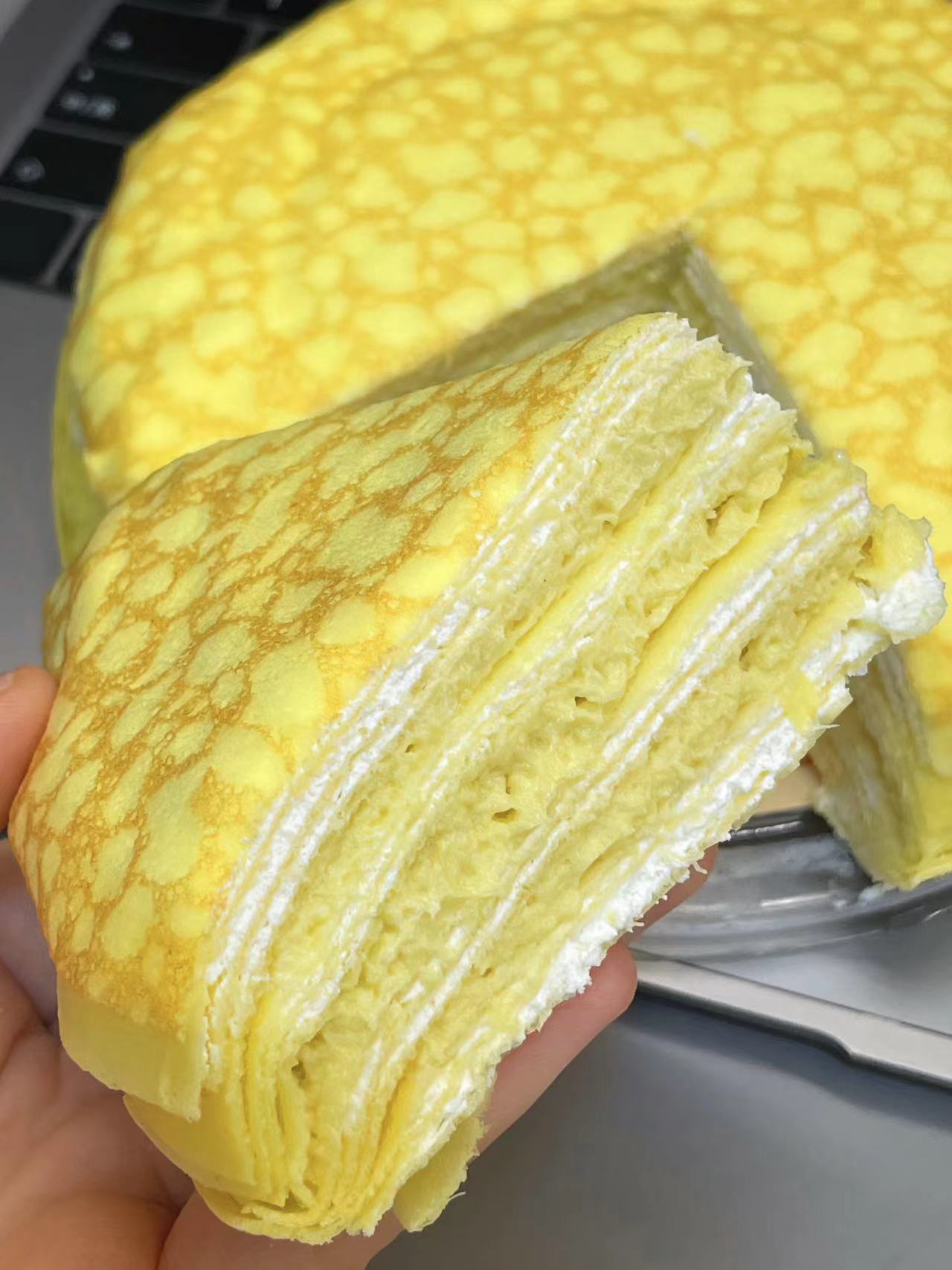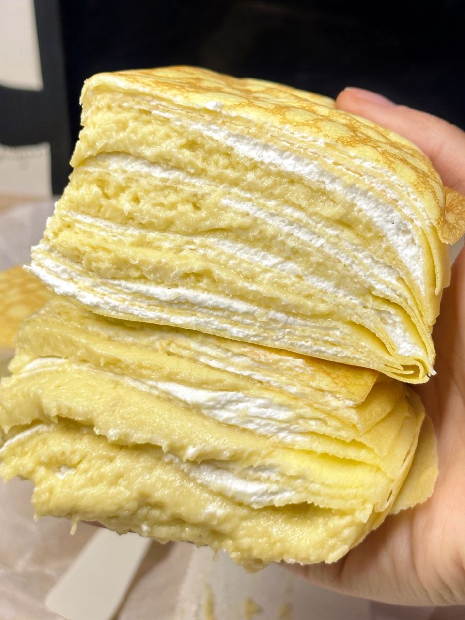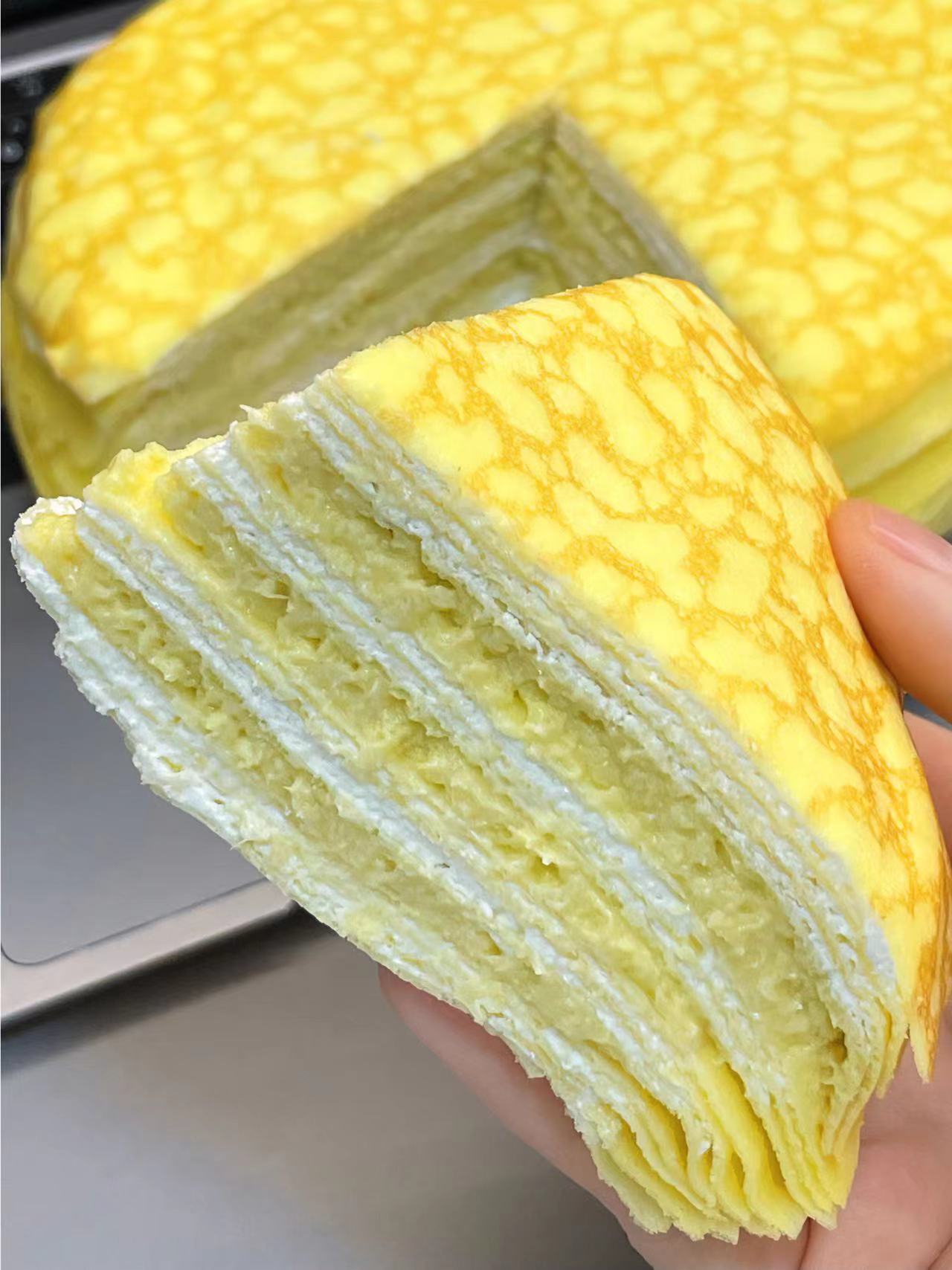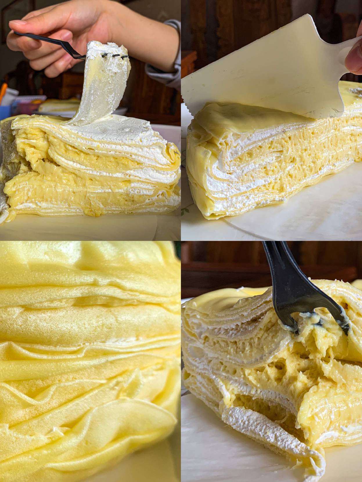 制作千层皮的蛋🥚奶浆中放入了黄油,在蛋香之中夹杂着一股淡淡的奶香味,还强化了千层皮的柔韧度,吃起来更得劲