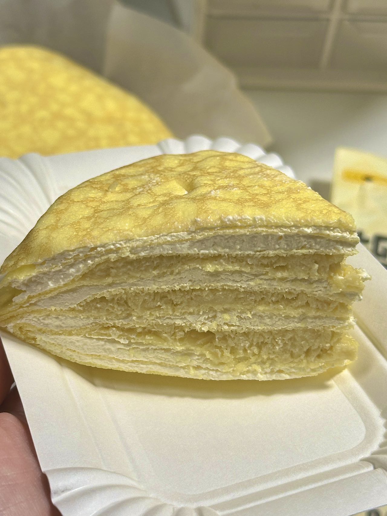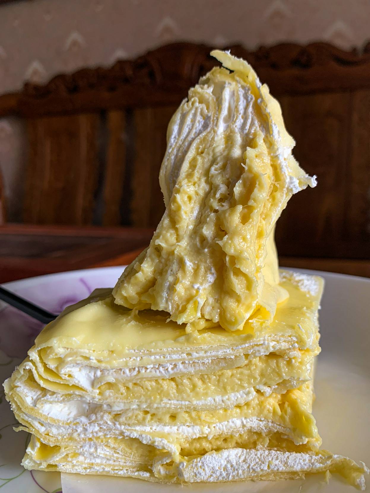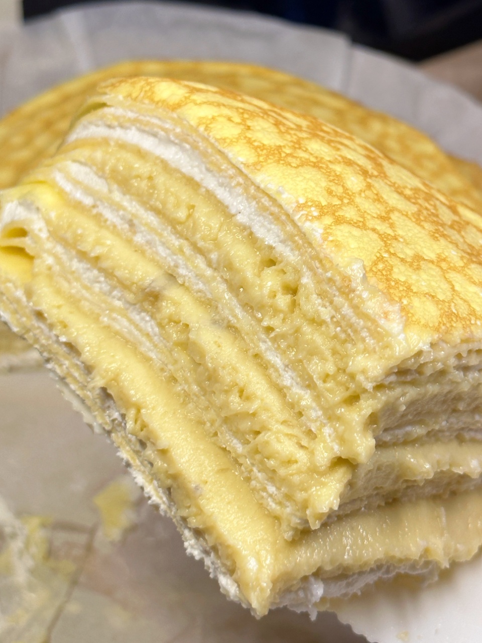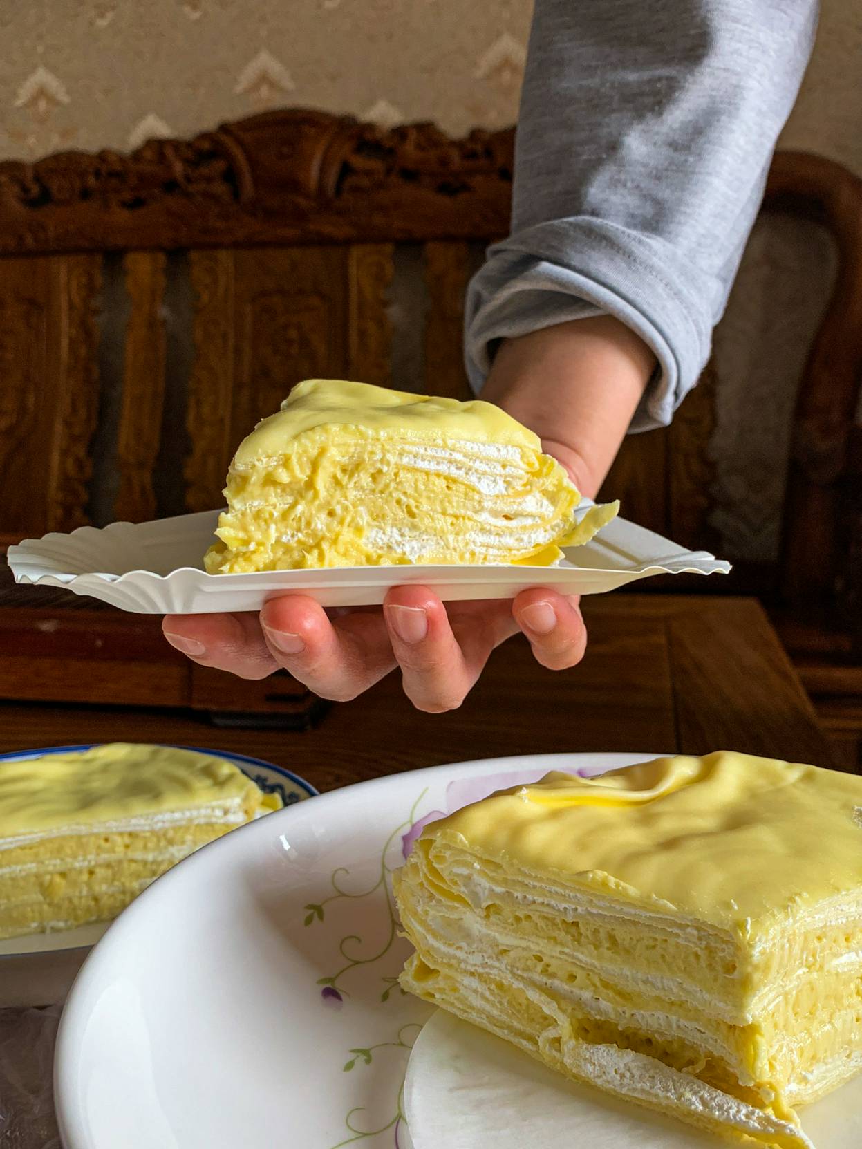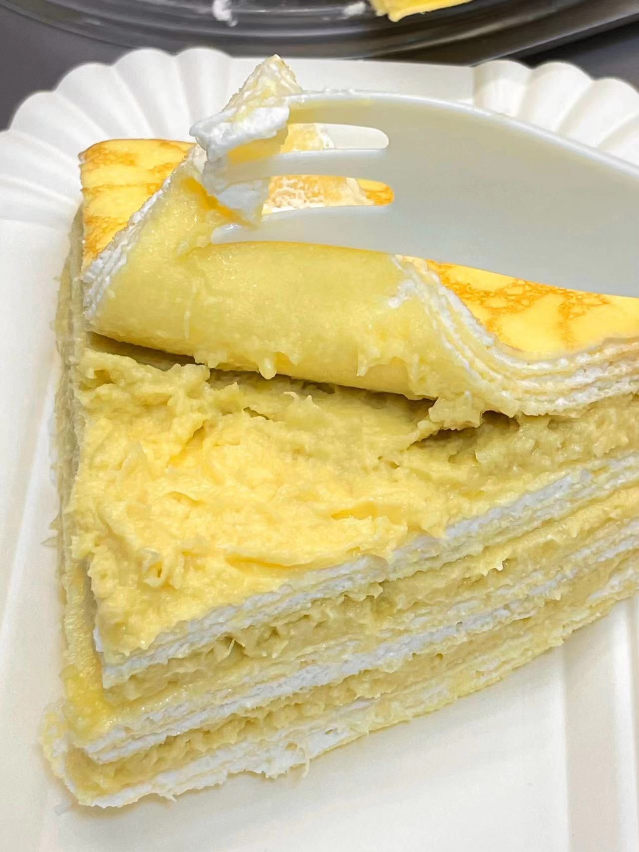 制作千层皮的蛋🥚奶浆中放入了黄油,在蛋香之中夹杂着一股淡淡的奶香味,还强化了千层皮的柔韧度,吃起来更得劲