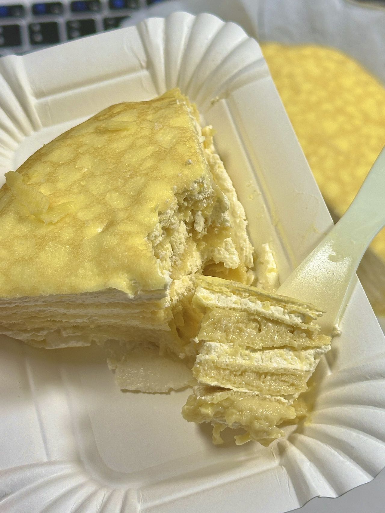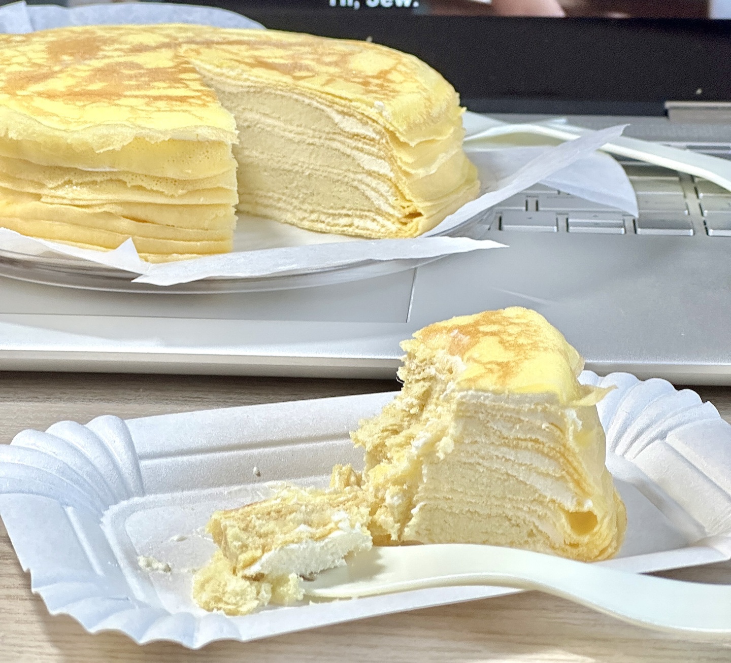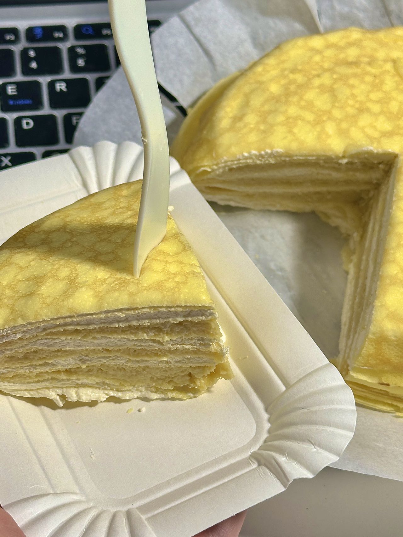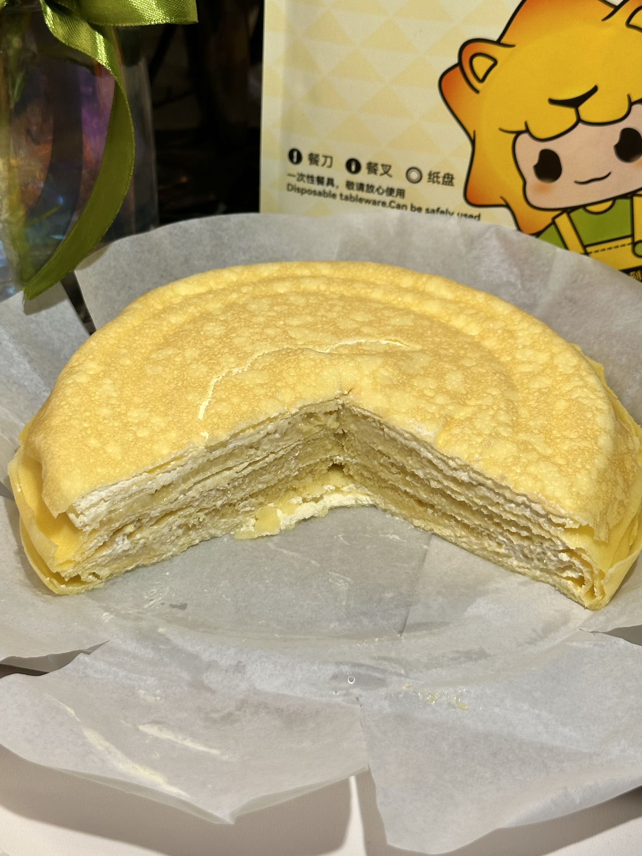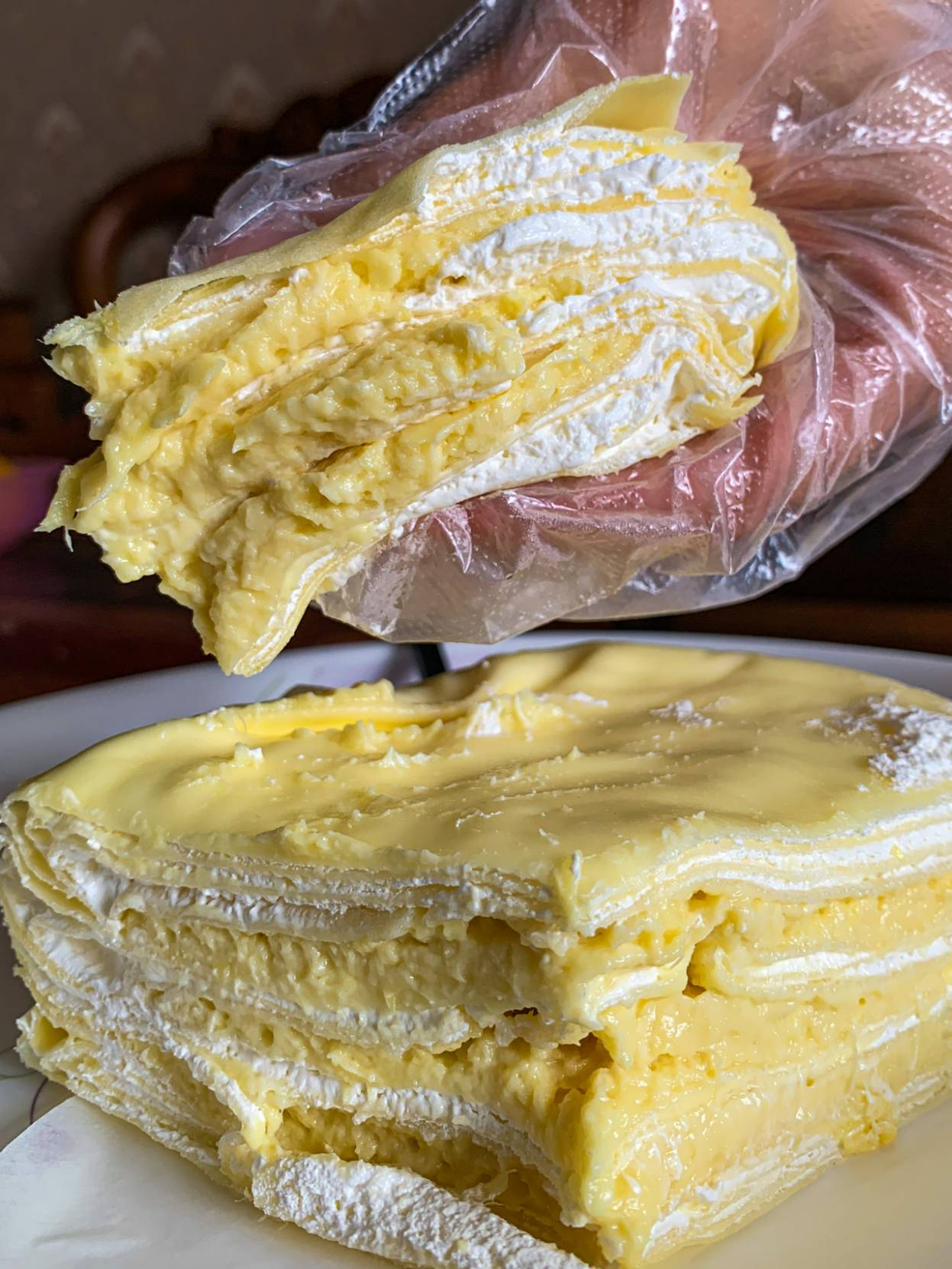 制作千层皮的蛋🥚奶浆中放入了黄油,在蛋香之中夹杂着一股淡淡的奶香味,还强化了千层皮的柔韧度,吃起来更得劲