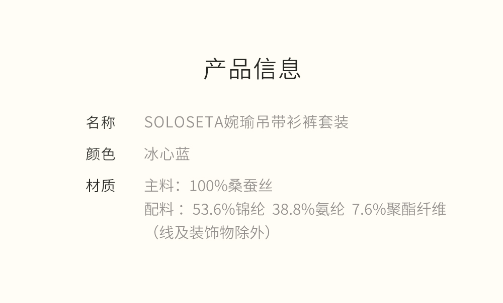 - soloseta专注于真丝织物,灵感源自意大利语,中文含义为“只做真丝”的意思。让睡衣变时尚,居家和外出瞬间切换,使其更具有出街,度假,参加宴会等功能。