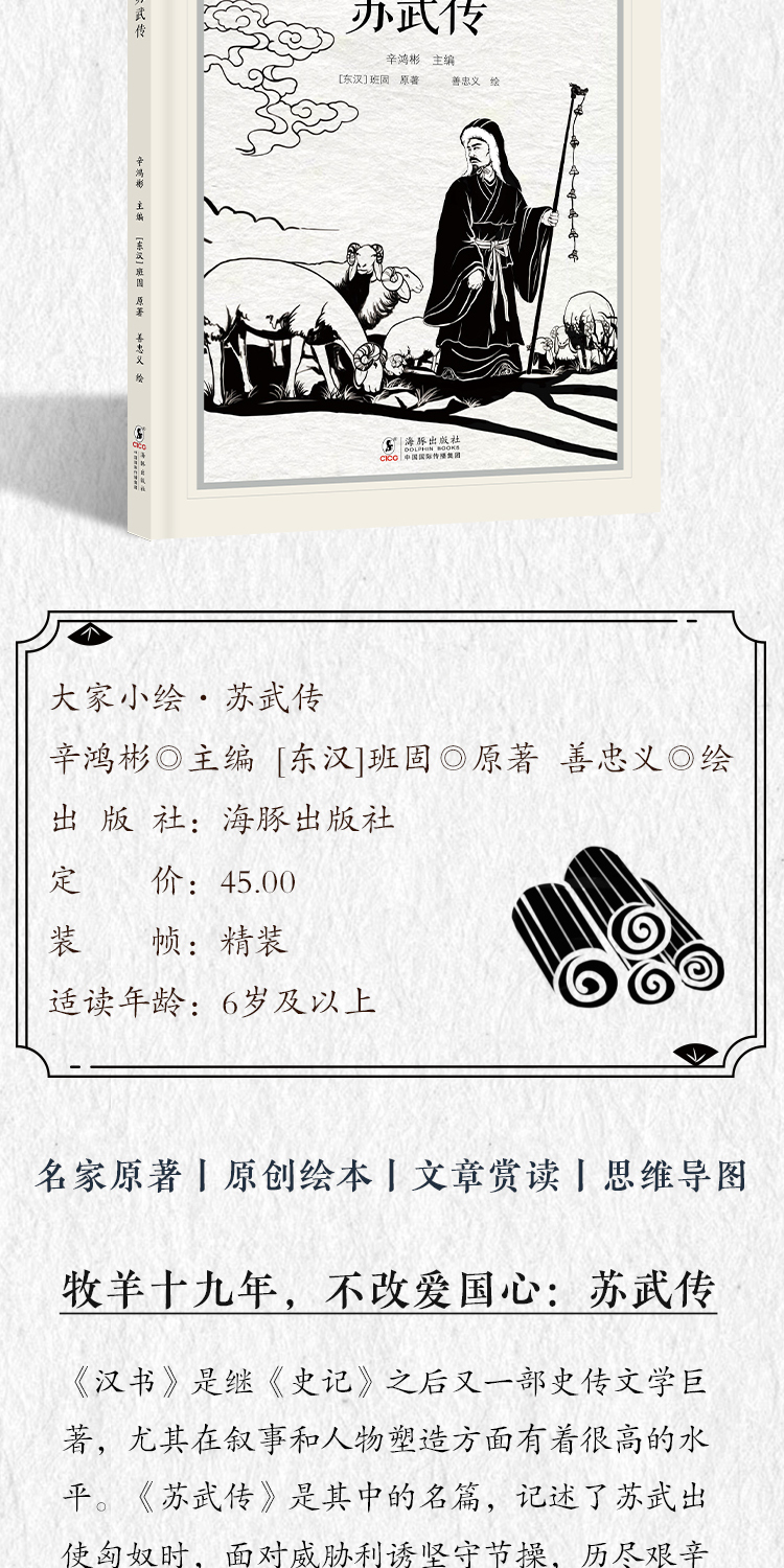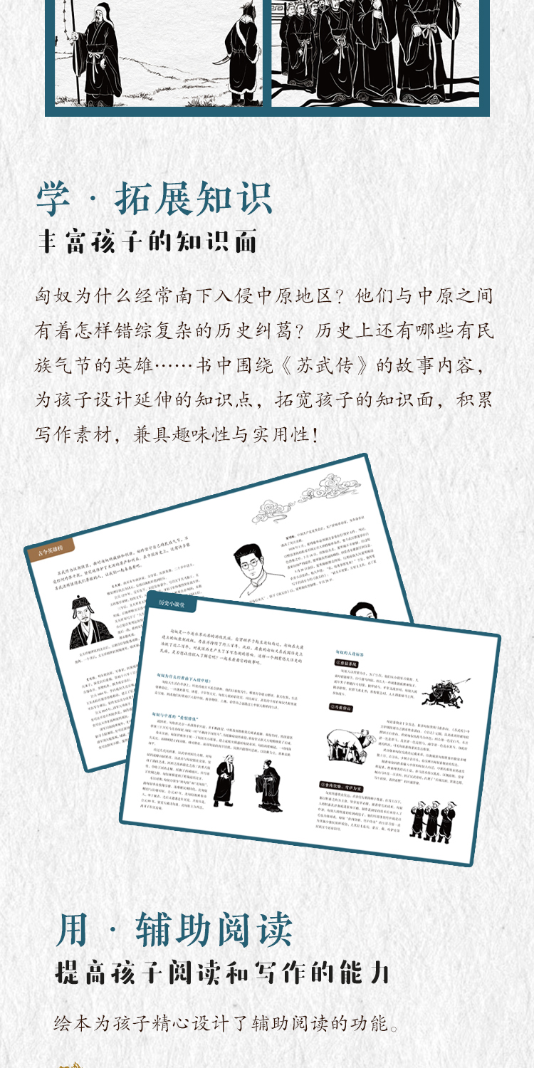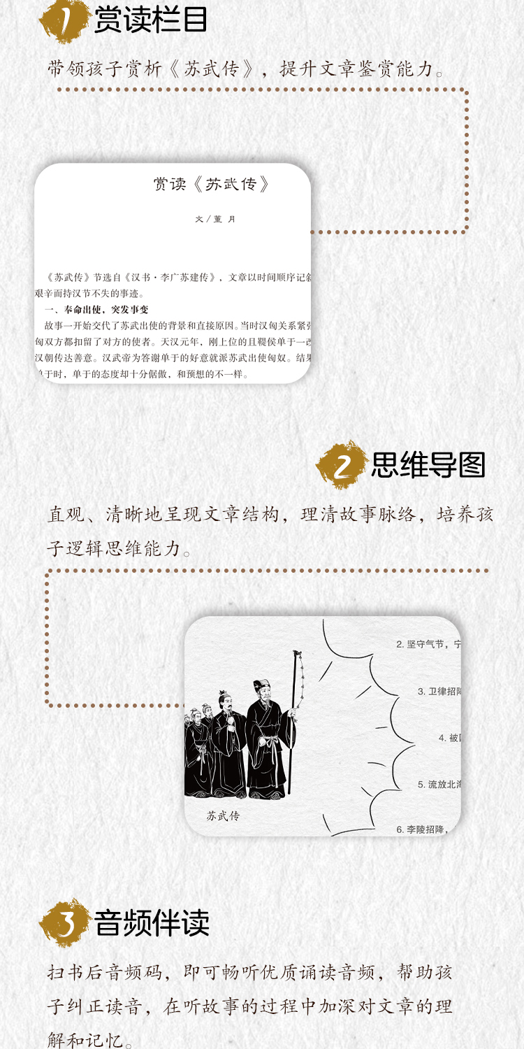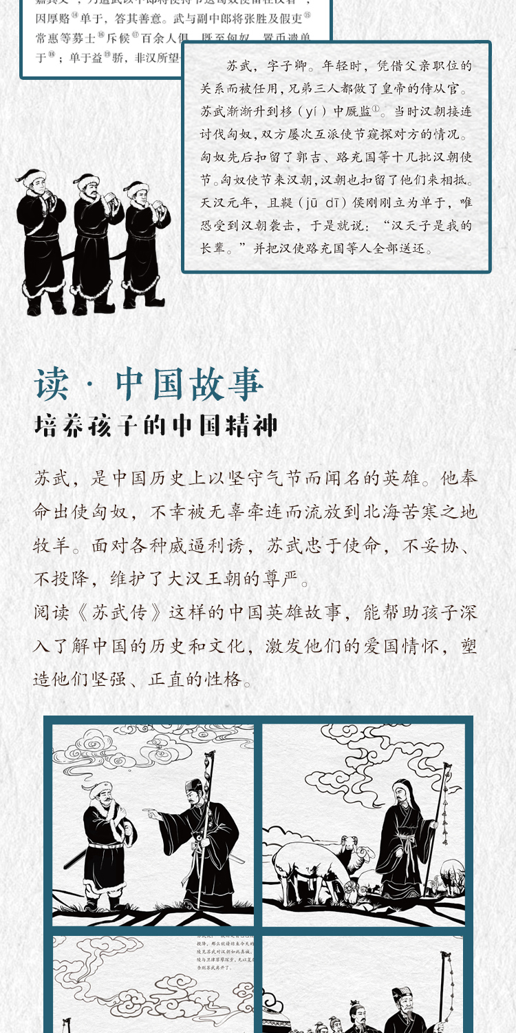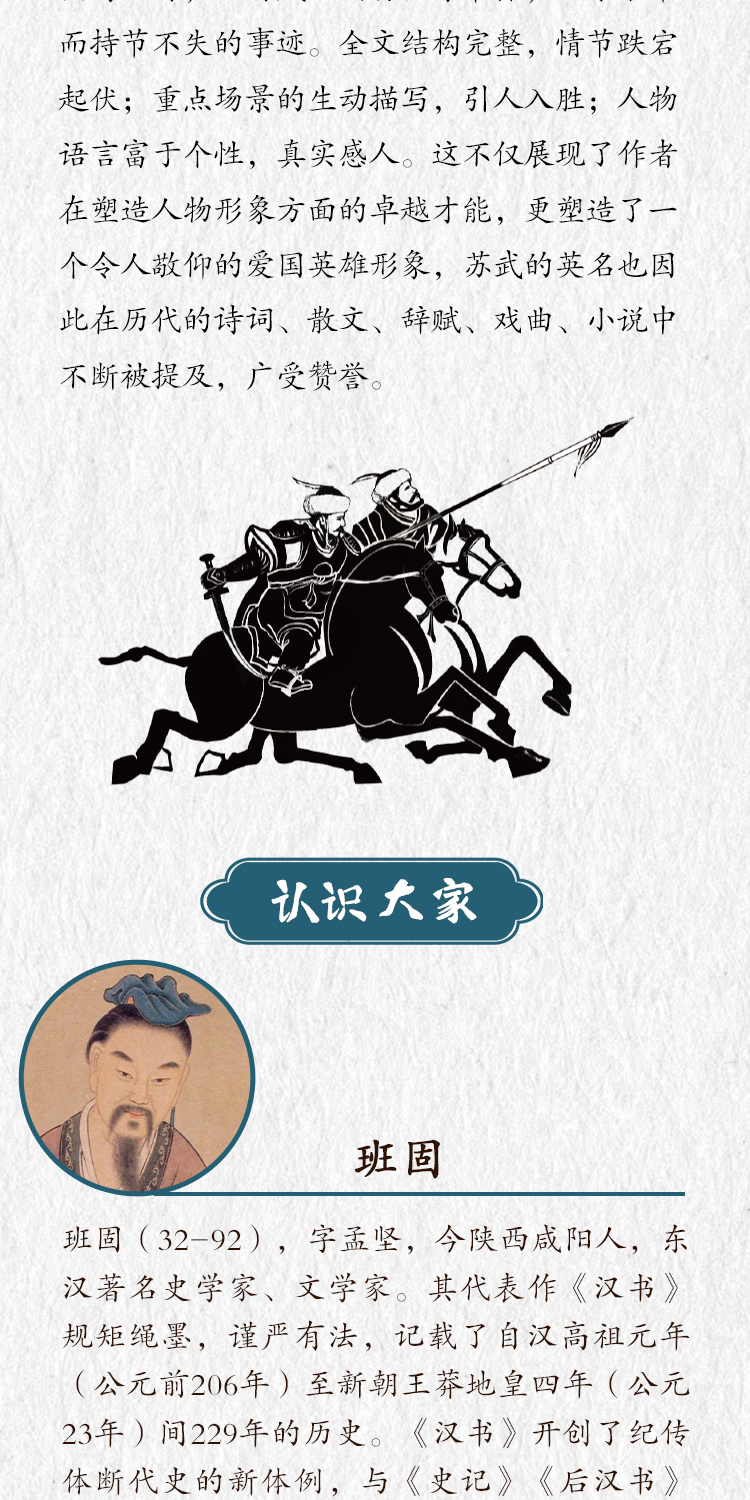 《苏武传》节选自《汉书·李广苏建传》,以时间顺序记叙了苏武出使匈奴,历经艰辛而持汉节不失的事迹。故事大致可分为四个部分,“奉命出使,突发事变”“坚守气节,心怀汉室”“面对招降,忠贞不渝”“得见曙光,获释归汉”。文章脉络清晰,结构完整,颇具可读性,生动刻画了一个富贵不淫、威武不屈、坚守节操、忠贞不渝的爱国志士形象。