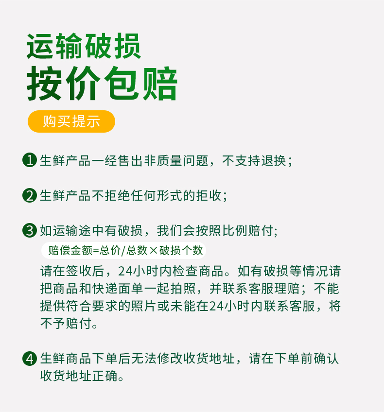 生鲜产品收到货后请务必第一时间打开查验,如有质量问题,请于快件签收后24小时内及时反馈,超时未反馈则默认产品质量无问题!