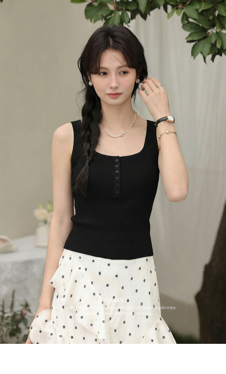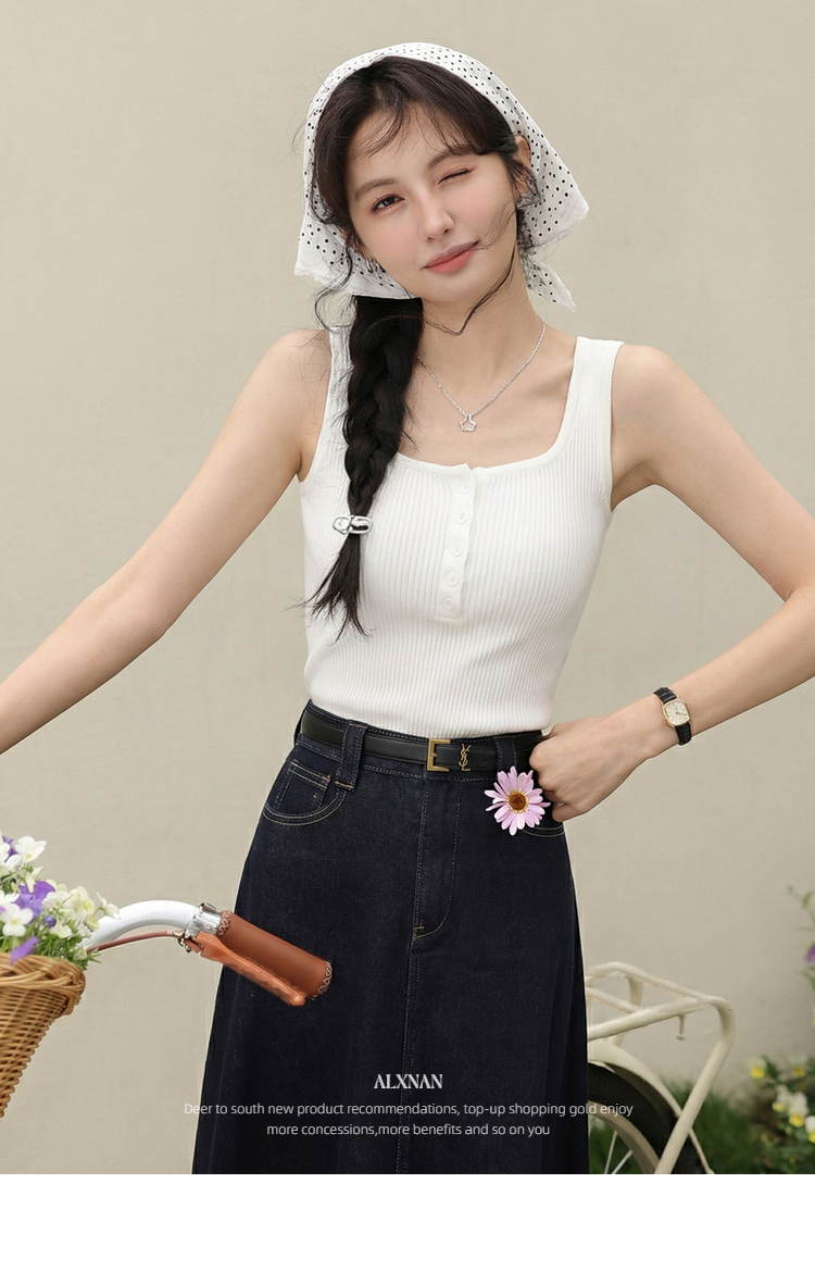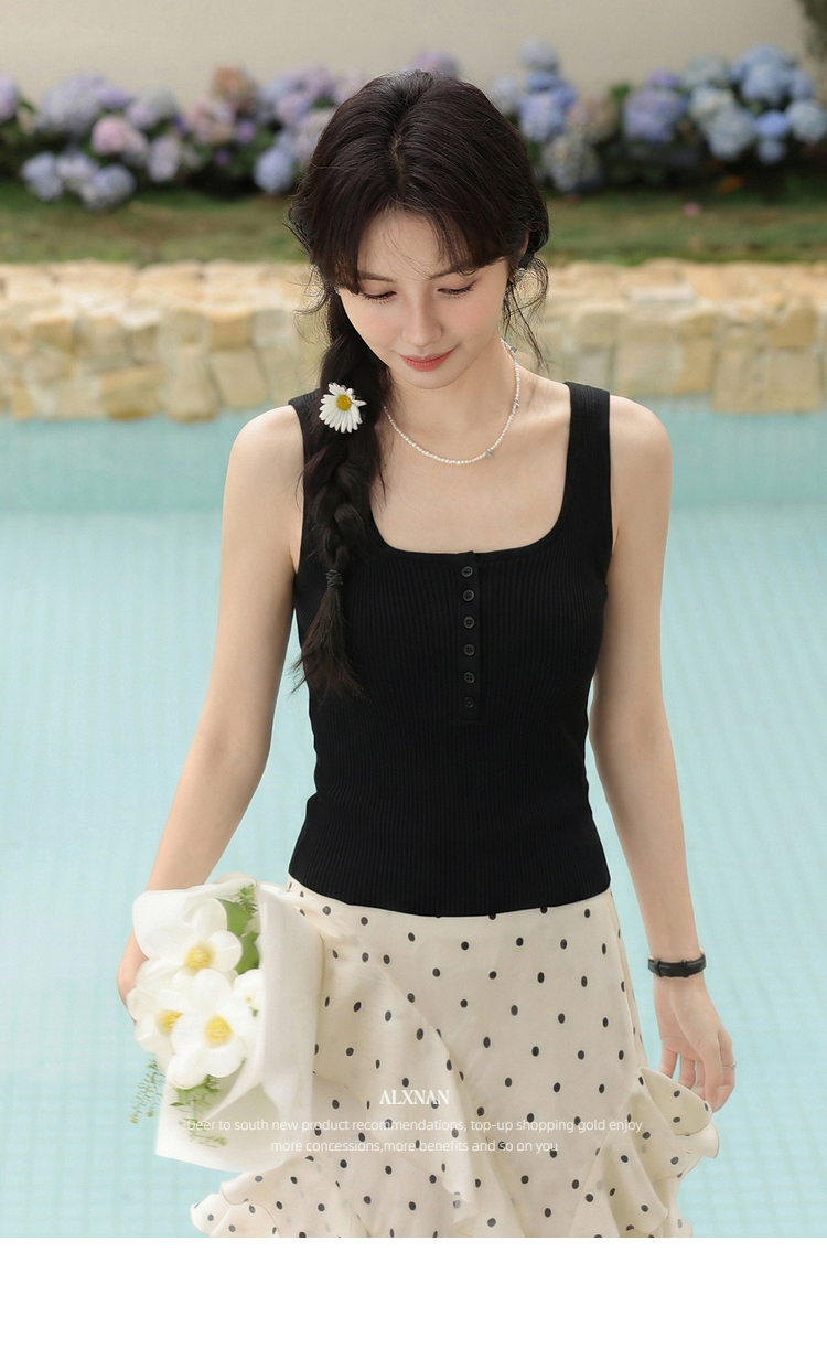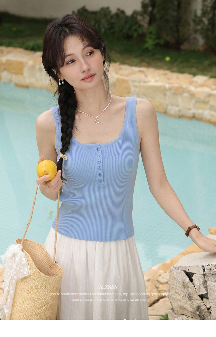 鹿向南「潮汐海岸」蓝色无袖针织背心女春季新款修身短款吊带上衣