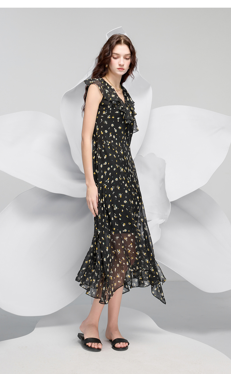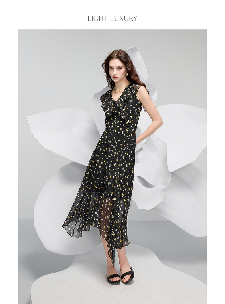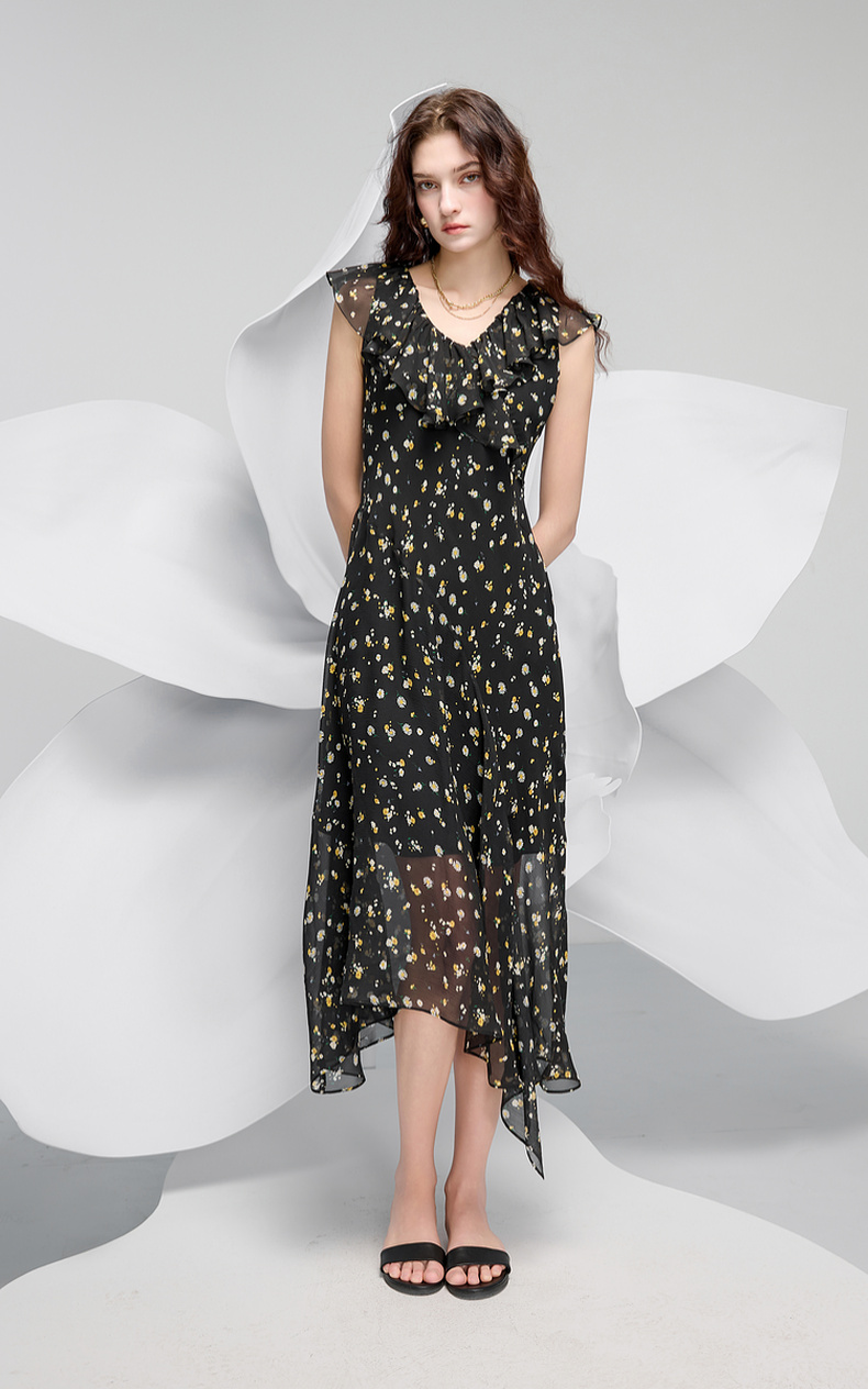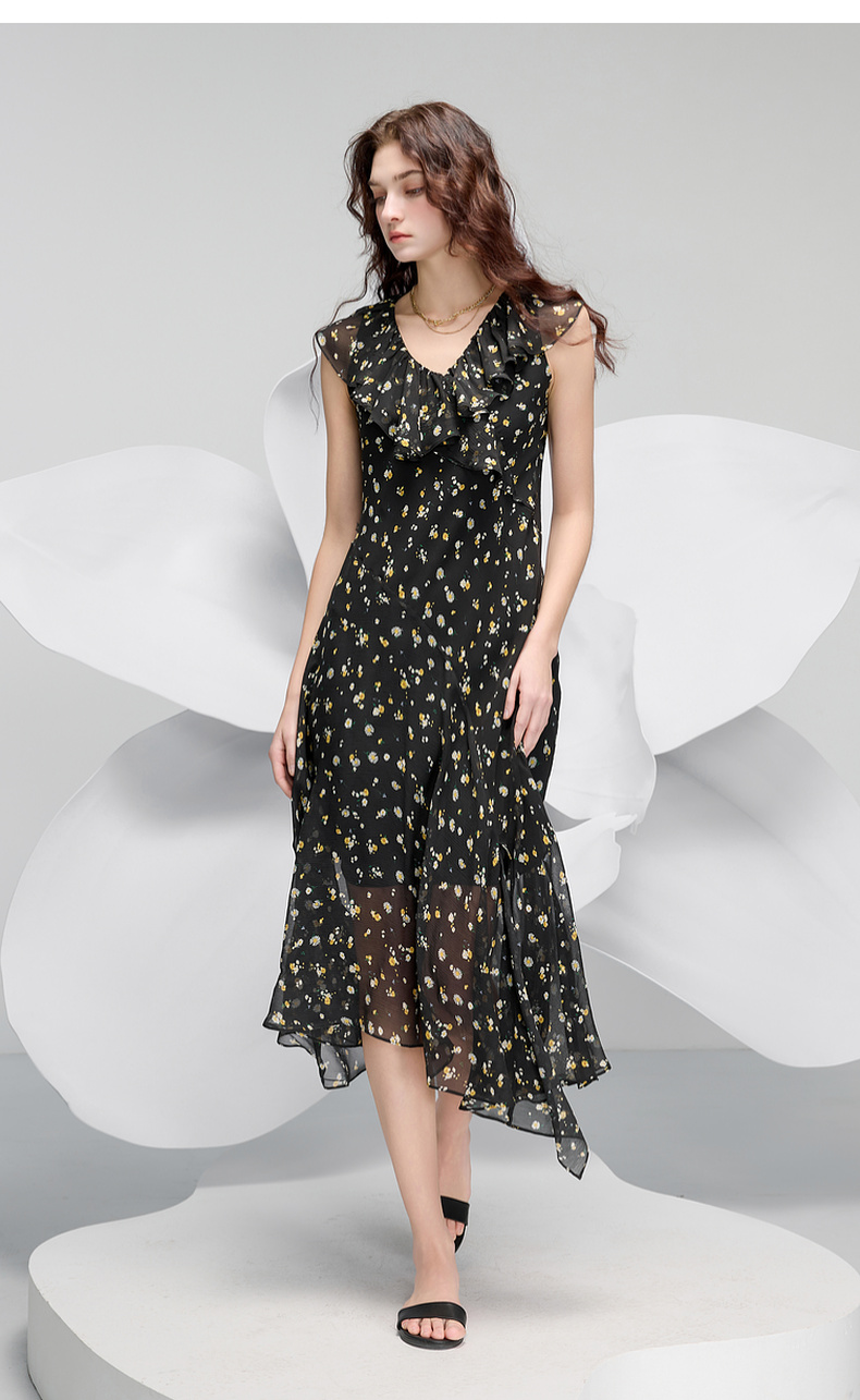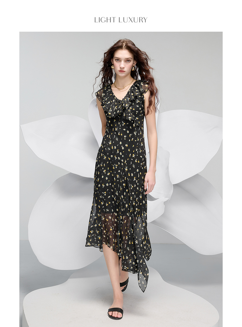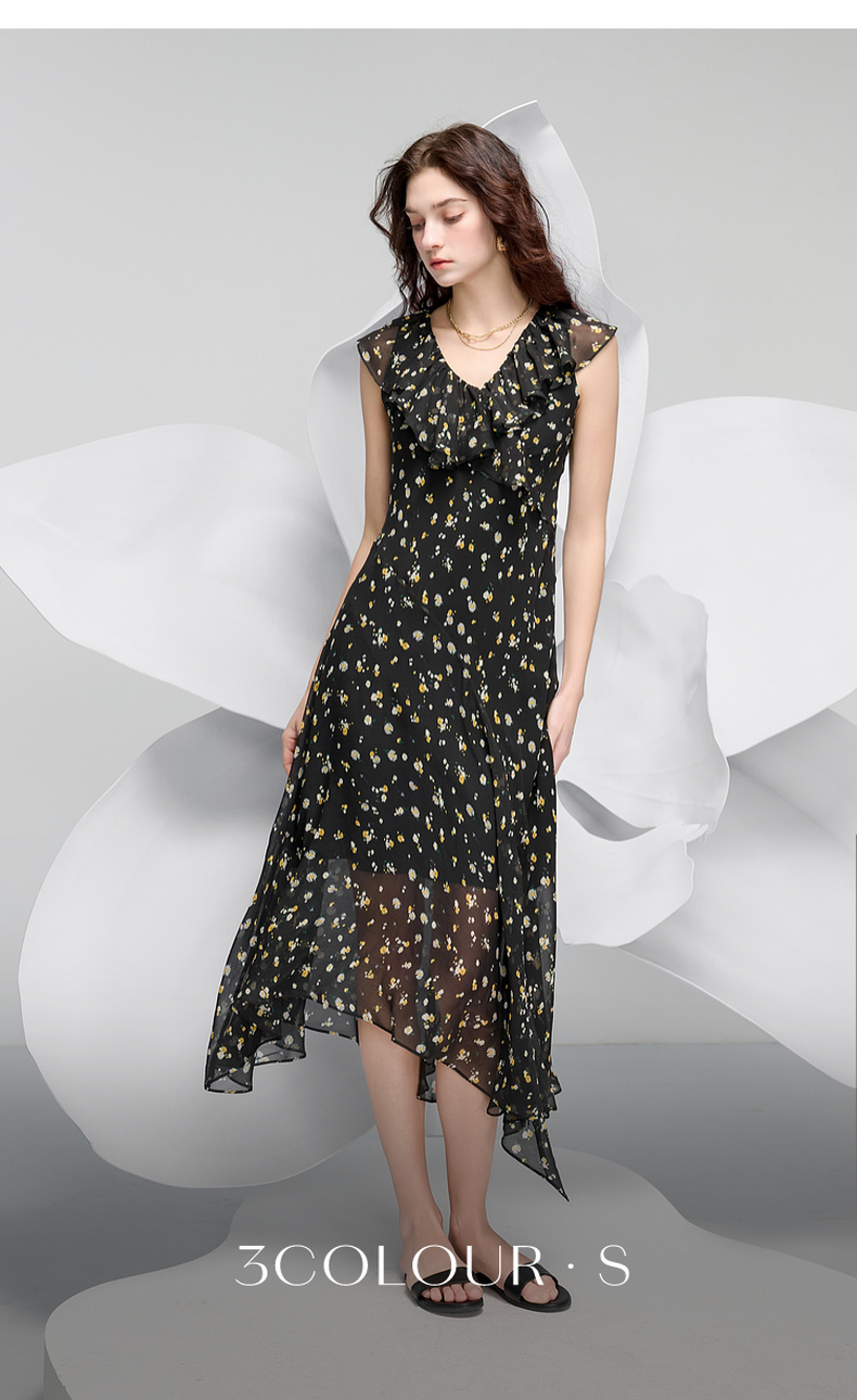三彩2025春季新款真丝连衣裙桑蚕丝荷叶边V领长裙不规则S