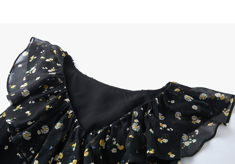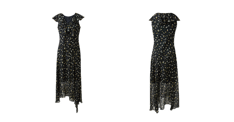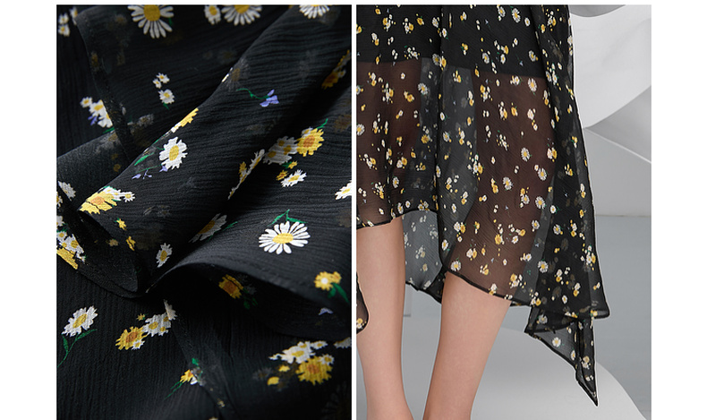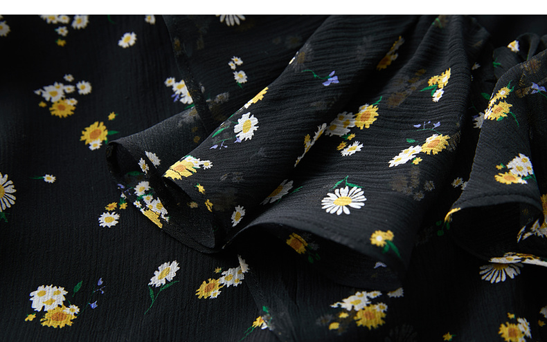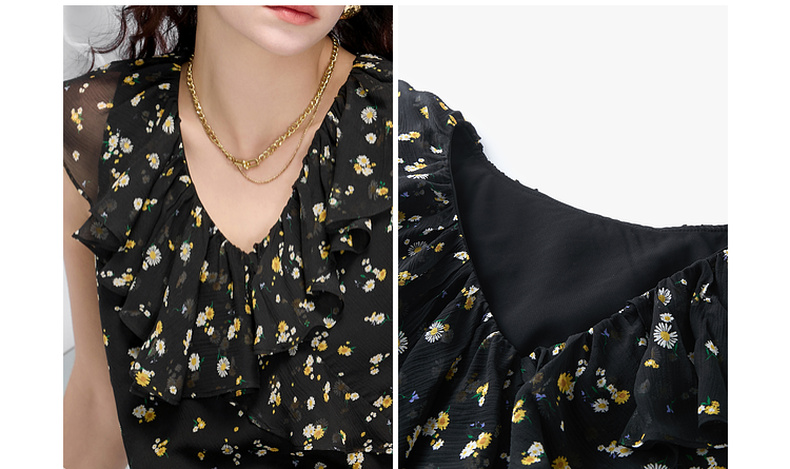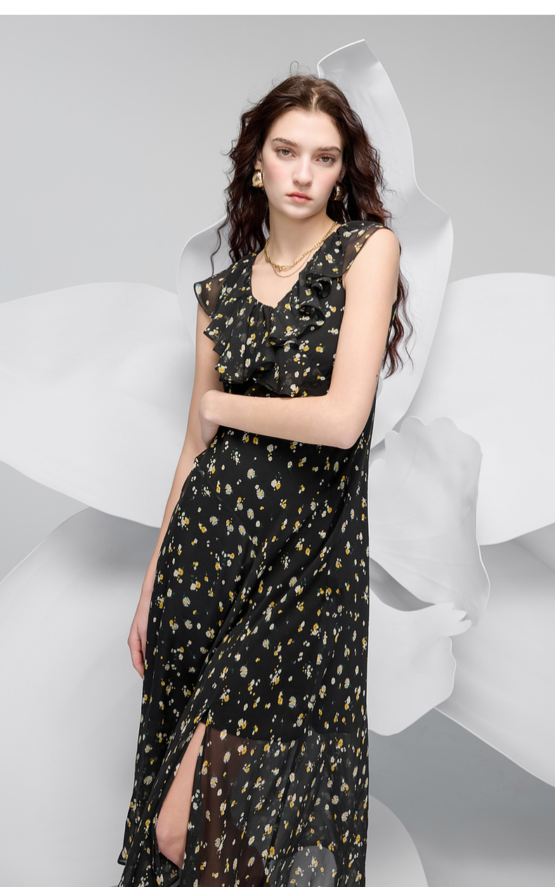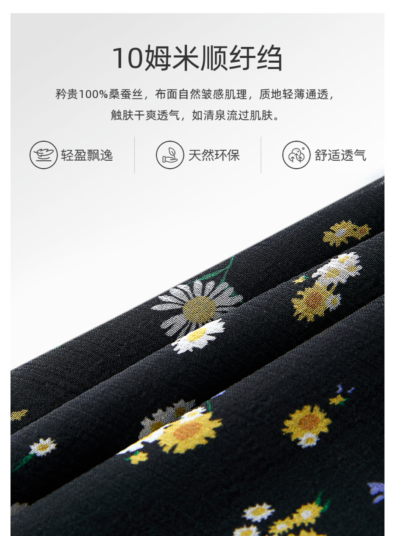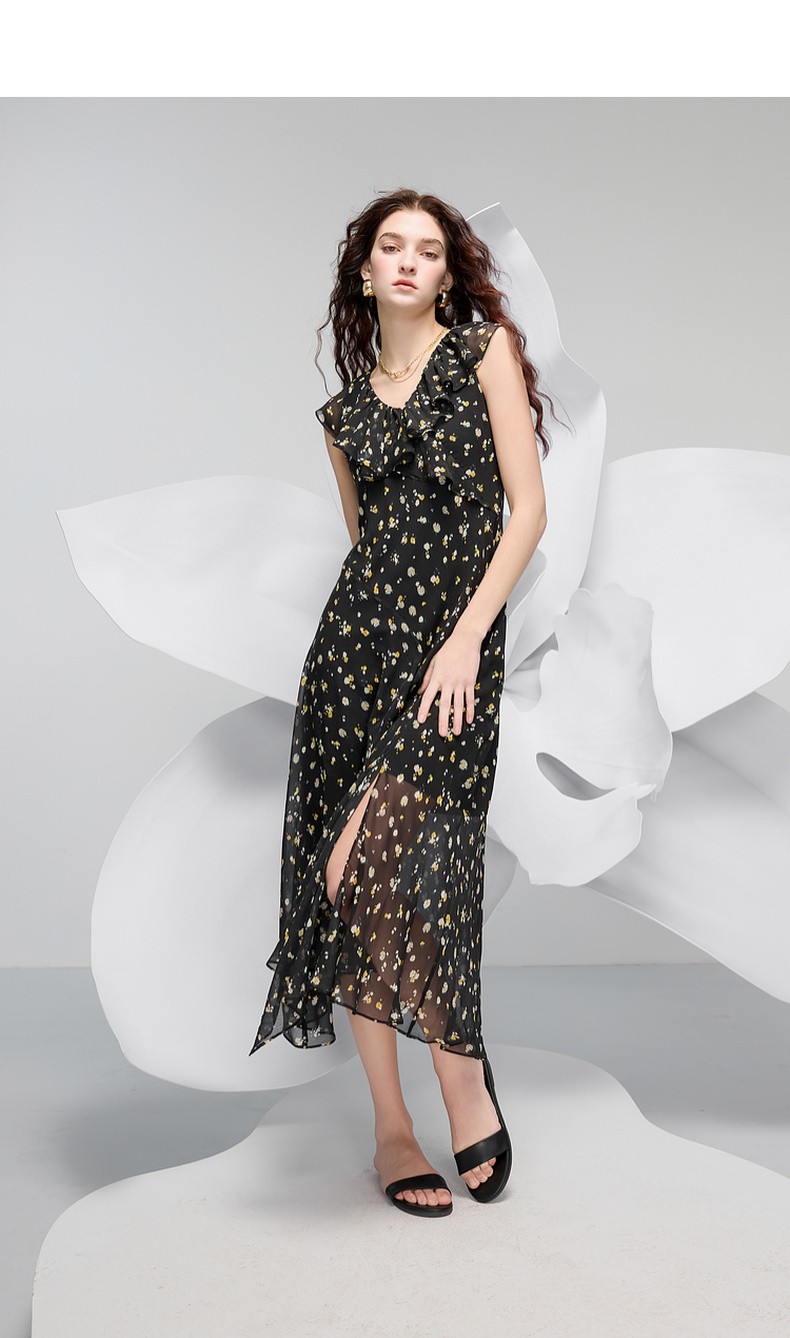 三彩2025春季新款真丝连衣裙桑蚕丝荷叶边V领长裙不规则S