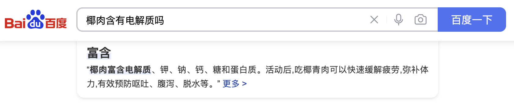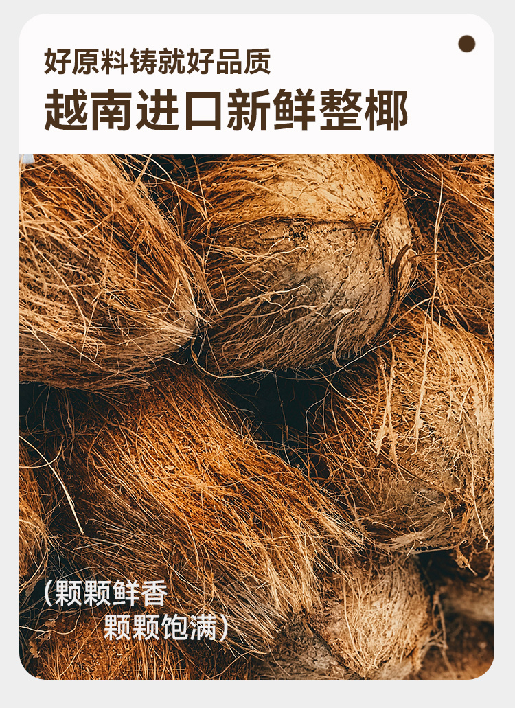 💯椰肉是椰子的胚乳,椰子浑身都是宝 💯富含蛋白质、维生素B族、维生素C 钾、镁等人体所需的微量元素 💯椰肉鲜榨NFC非浓缩还原工艺 💯补充月桂酸、植物蛋白等人体所需营养 💯清爽解渴、美容养颜 💯椰肉中富含电解质能及时补充丢失的水分