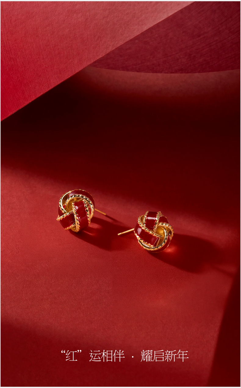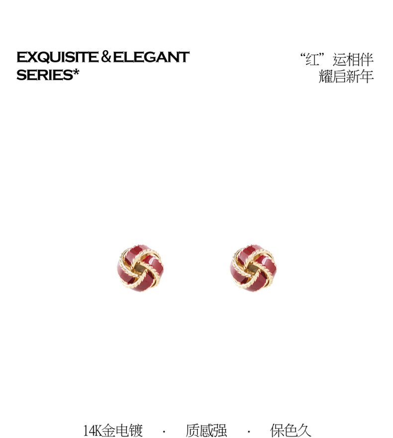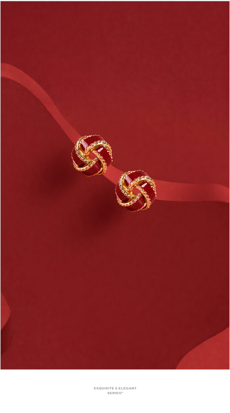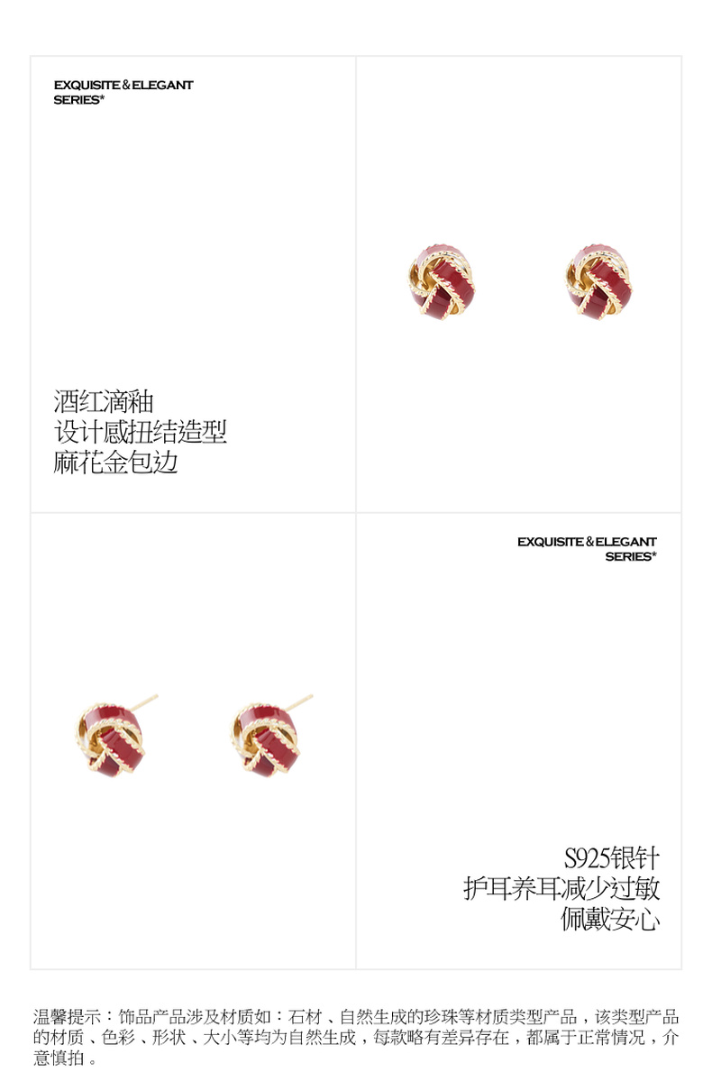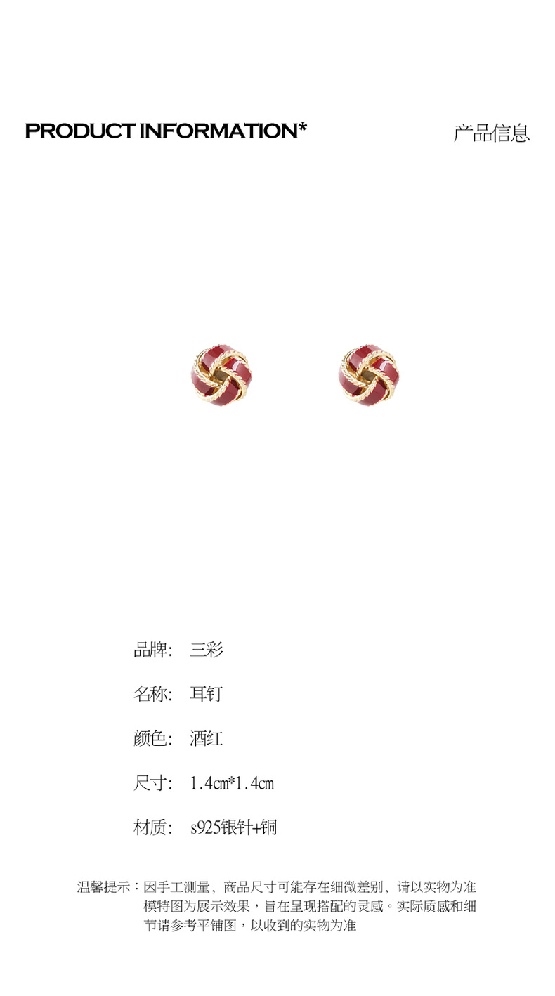 三彩2026新款扭结酒红滴釉耳钉S925银针国风立体麻花金边氛围感女