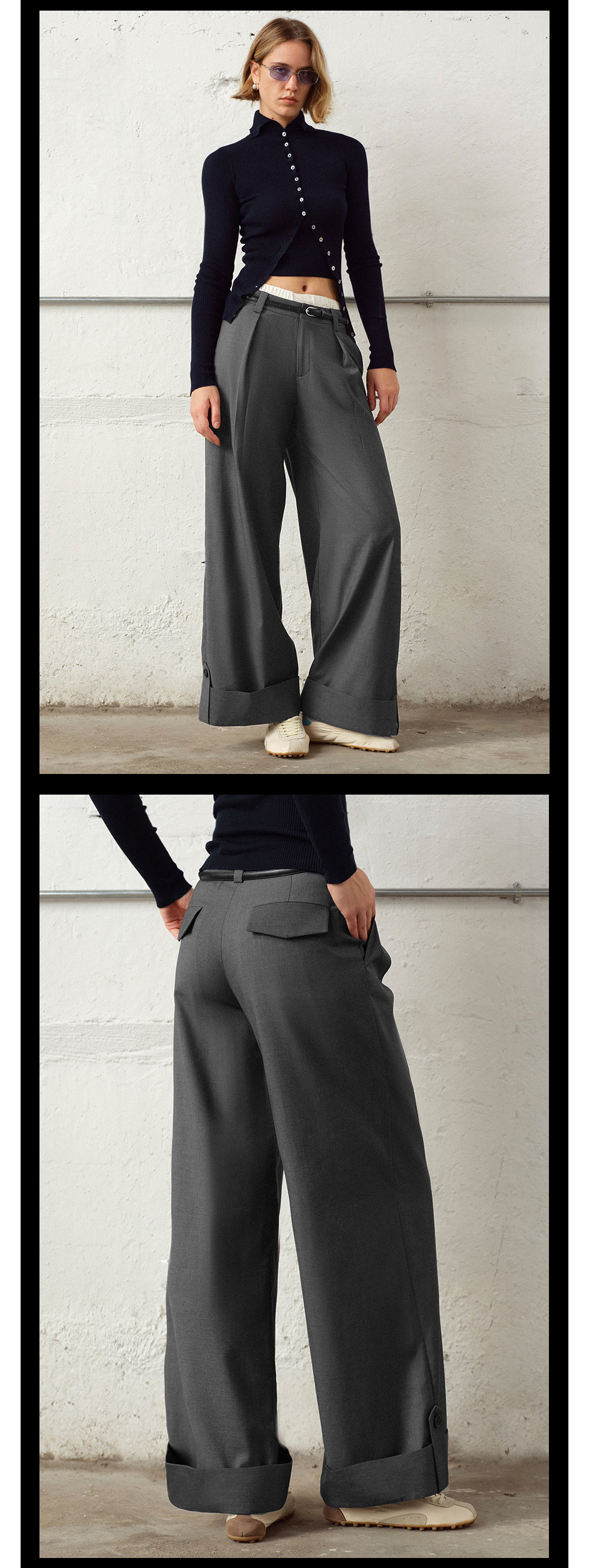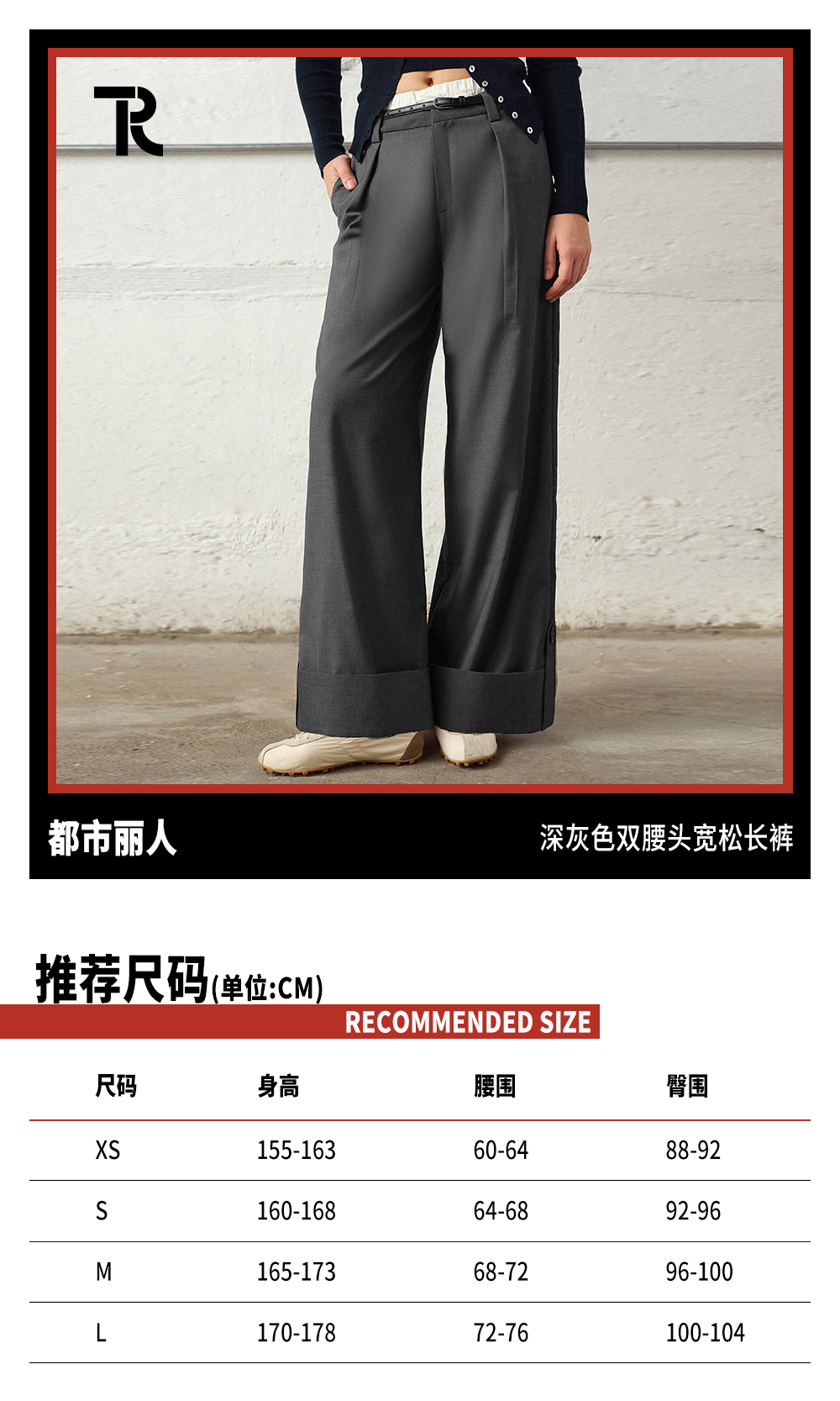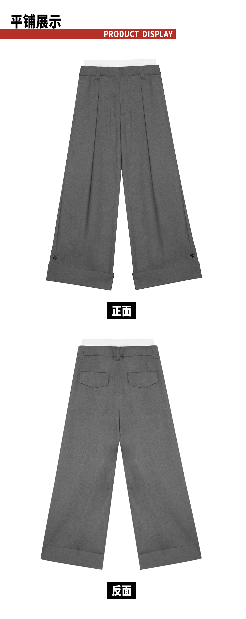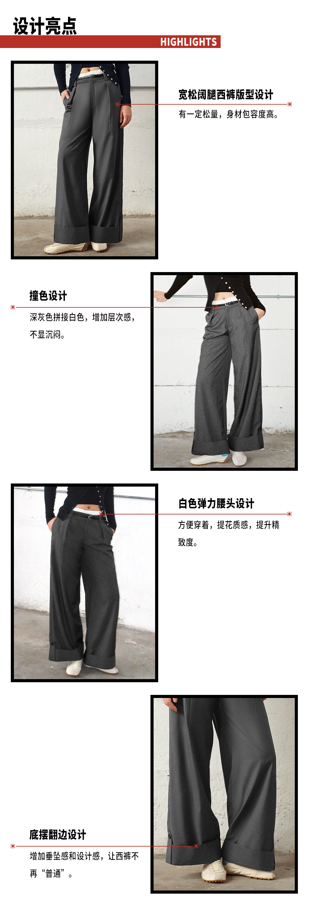 TR她热 都市丽人 灰白撞色拼接翻边通勤百搭西装阔腿裤