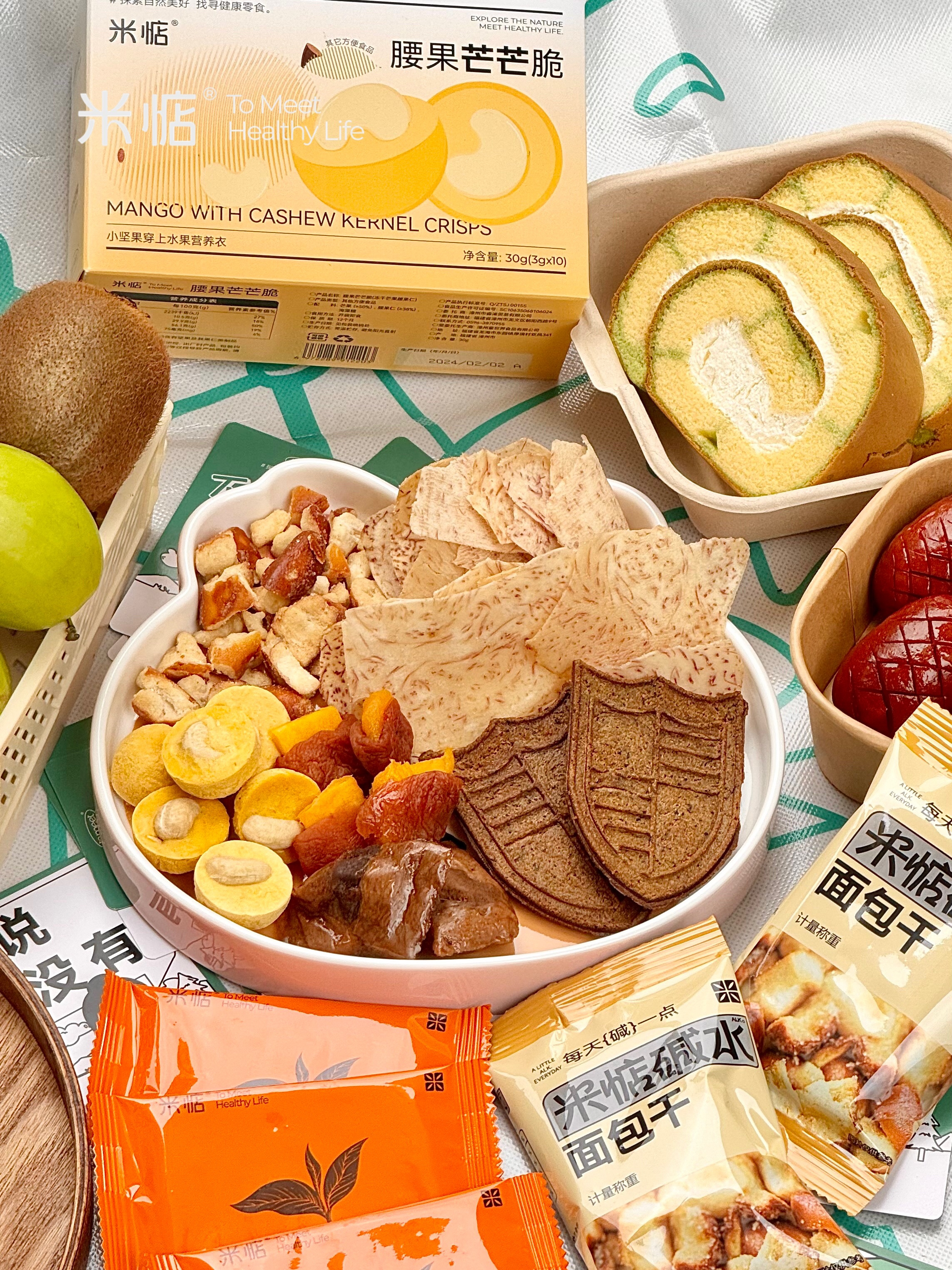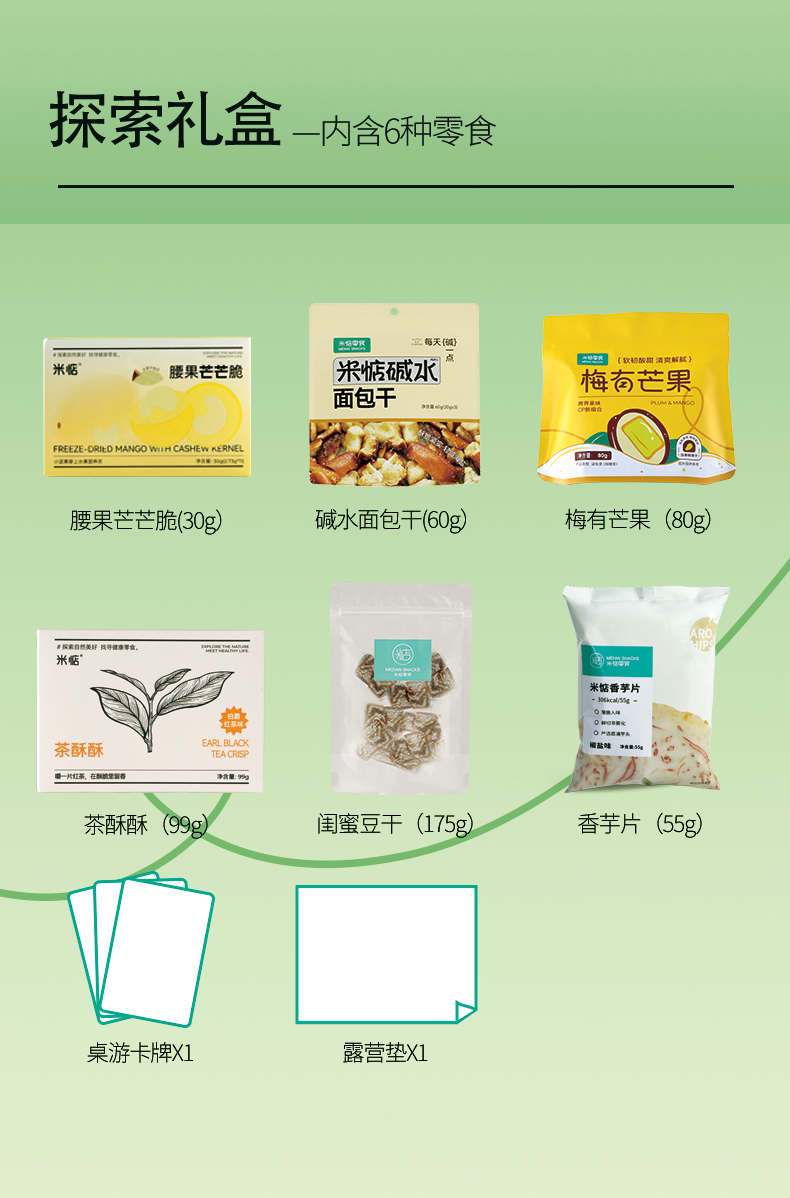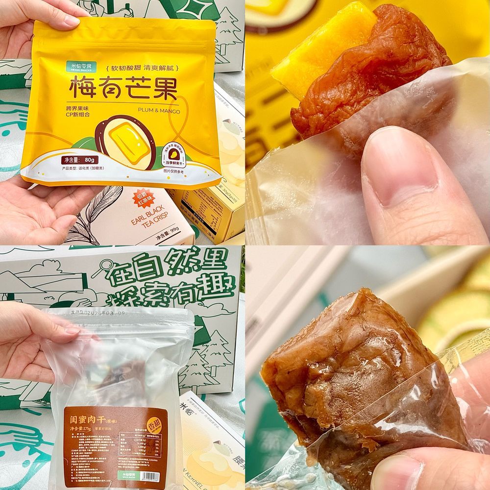 🎁探索礼盒内物如下: ☘碱水面包干☘腰果芒芒脆☘梅有芒果 ☘闺蜜肉干☘香芋片☘茶酥酥