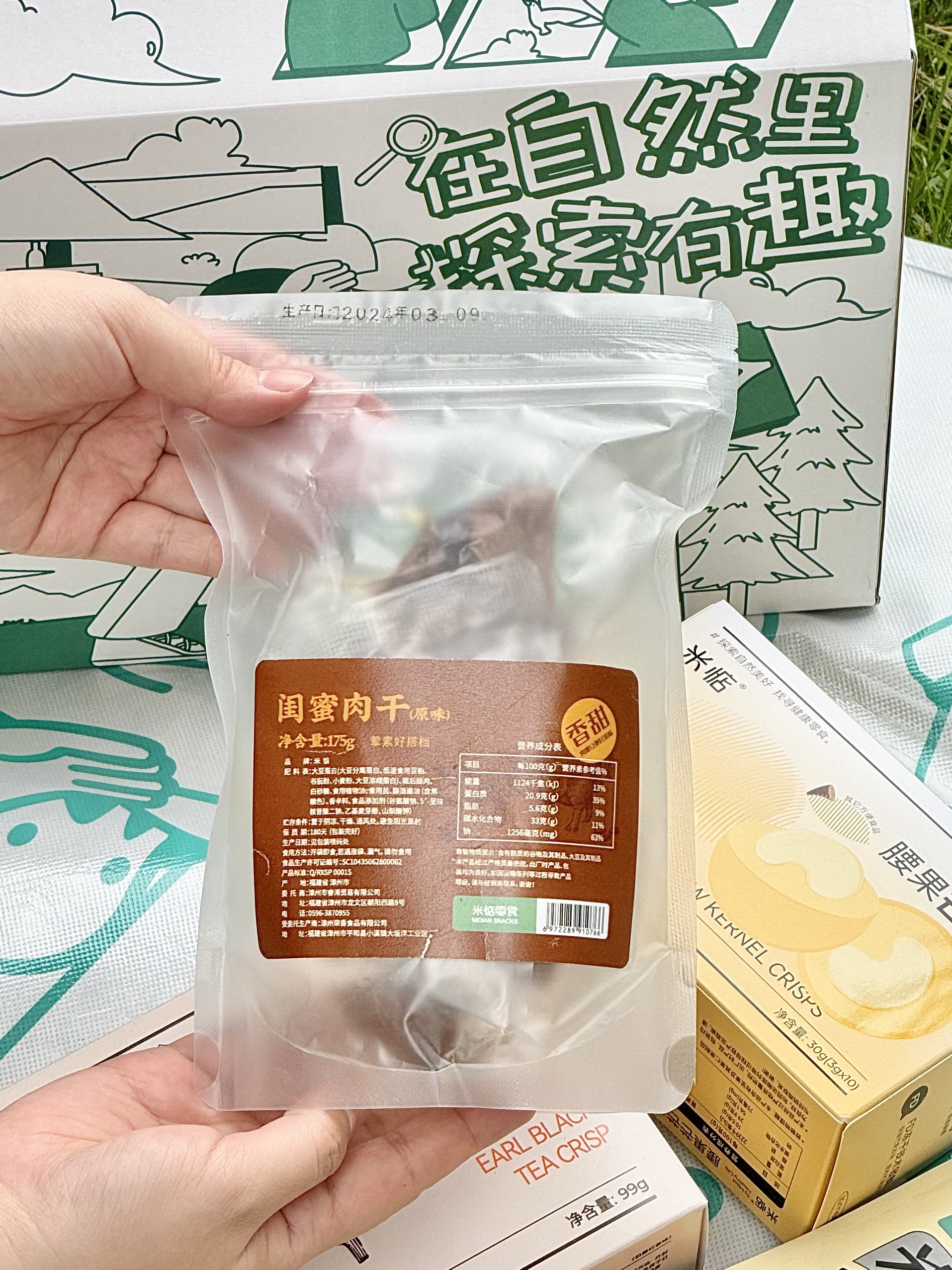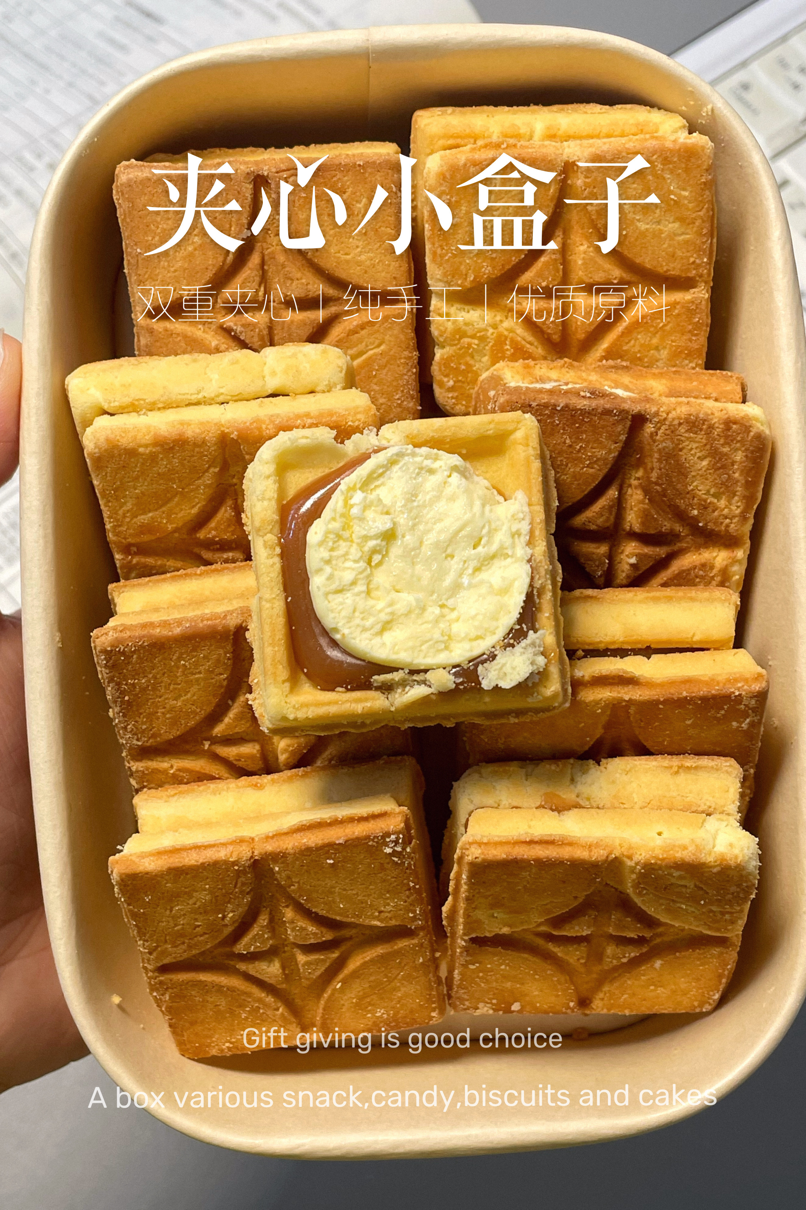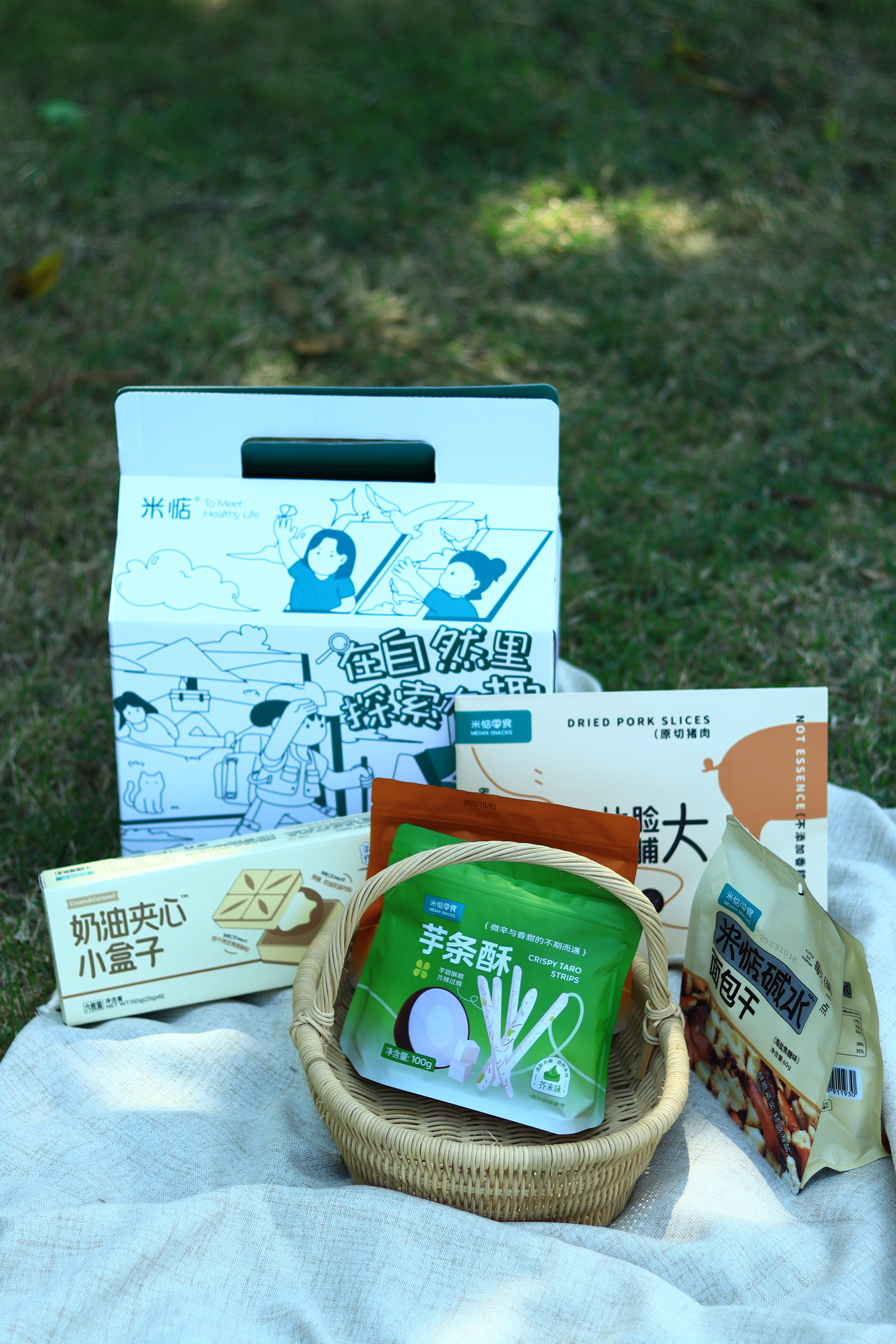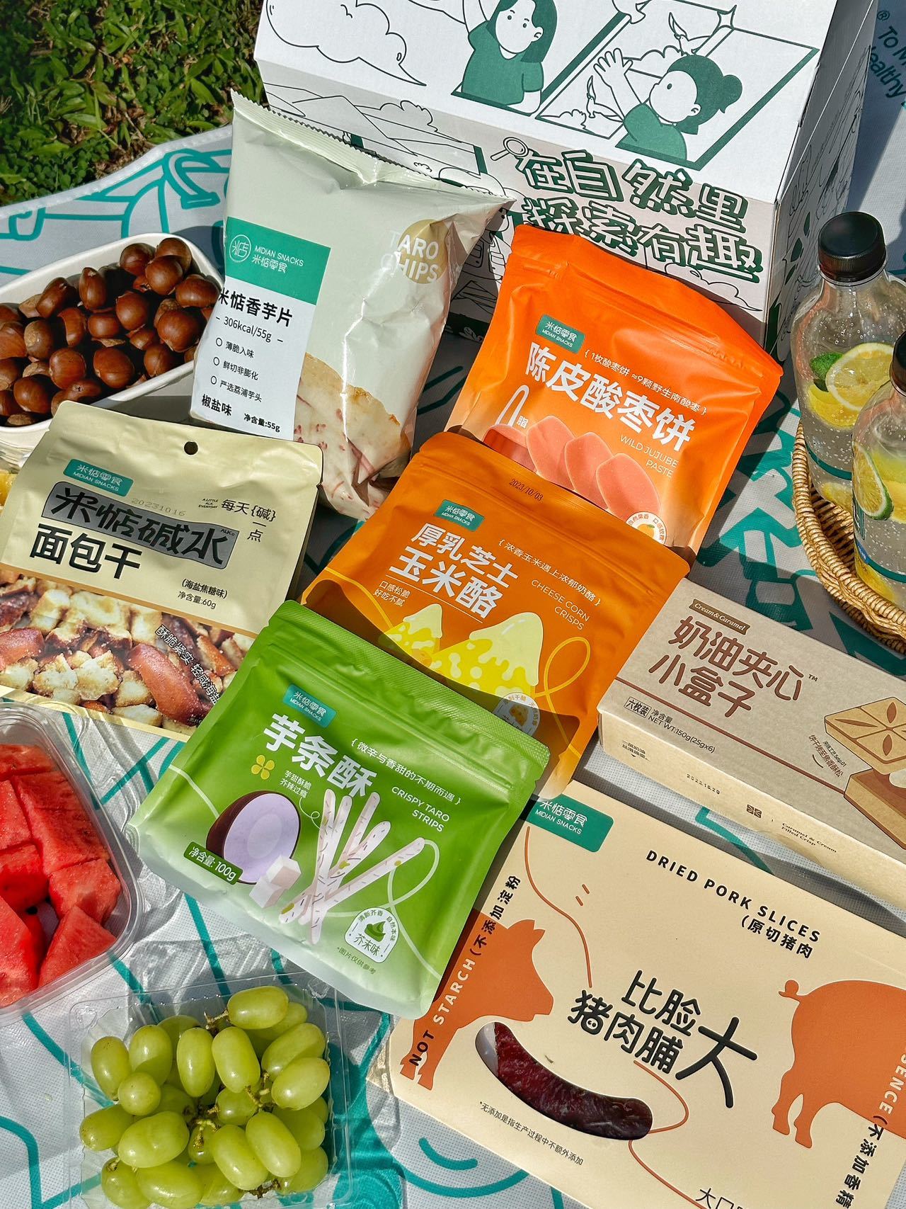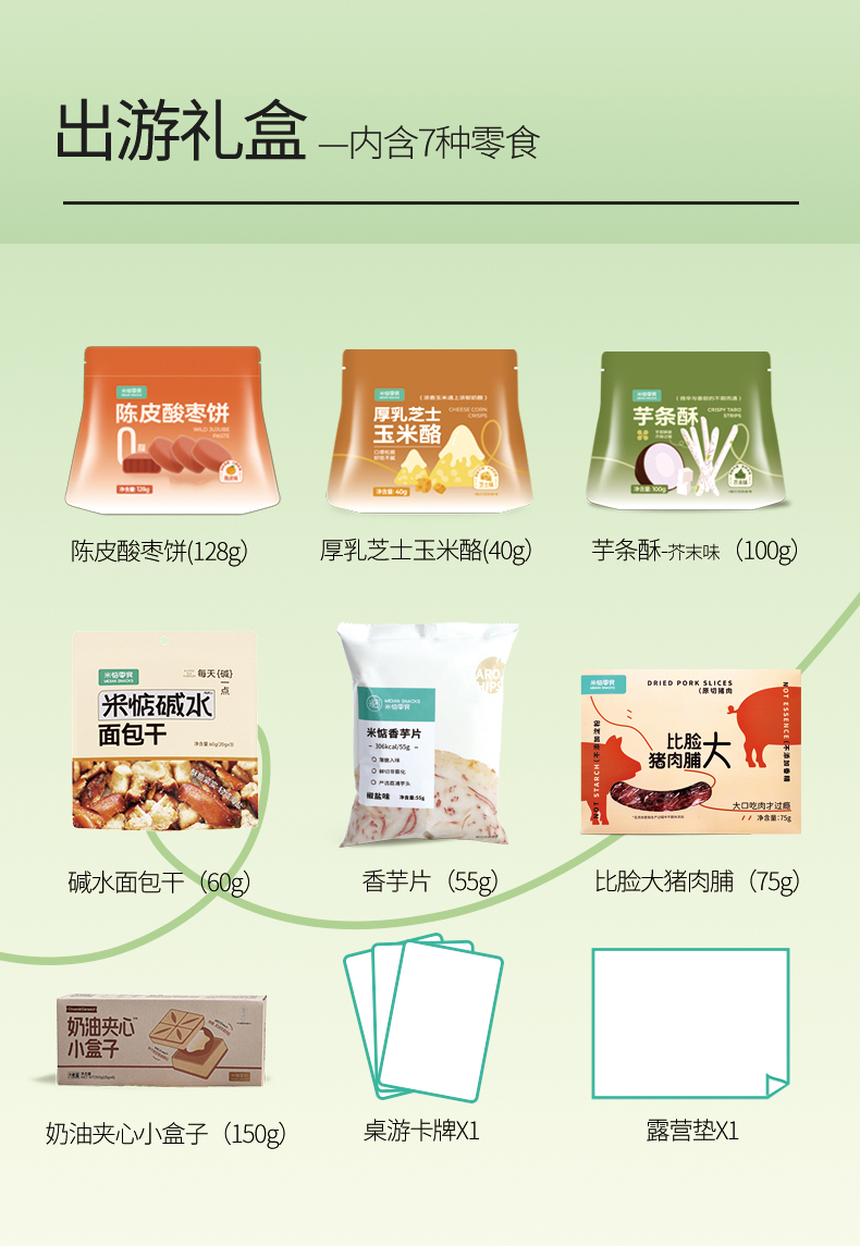 🎁出游礼盒内物如下: ☘陈皮酸枣饼☘厚乳芝士玉米酥 ☘芋条酥—芥末味☘奶油夹心小盒子 ☘香芋片☘比脸大猪肉脯☘碱水面包干