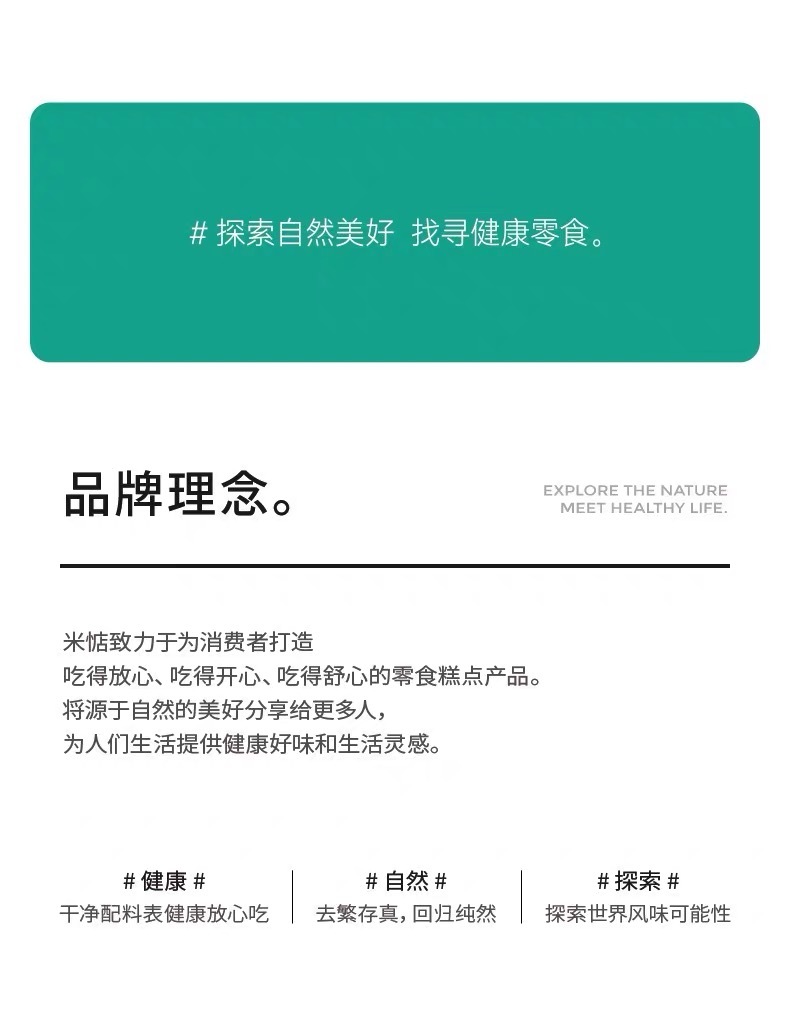 🏷品牌故事 ✔米惦,以找寻和分享健康零食而来,秉持着低添加甚至无添加的产品理念,致力于为每个人提供更安心的美味。 ✔我们为打破“零食是不健康的”固有认知而来,成立至今,已销售8000万袋,深受年轻一代的喜欢和认可。 ✔在坚持健康零食上,我们不止步于好吃,而是研发更有趣好玩,更高品质高颜值的产品,为每个人带来好吃好玩的零食生活体验。