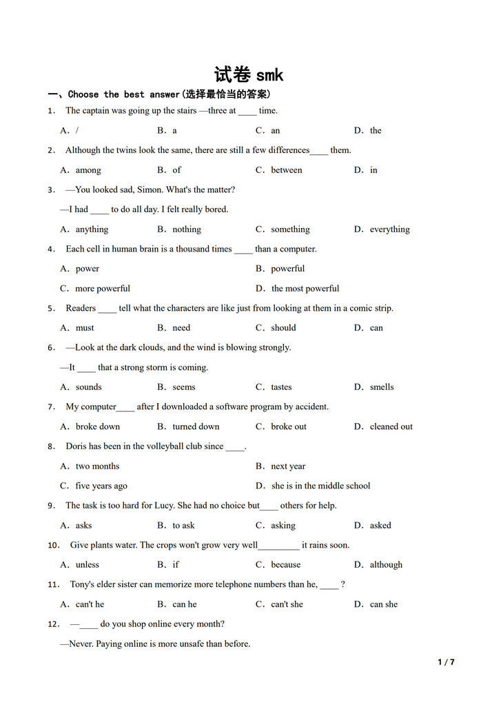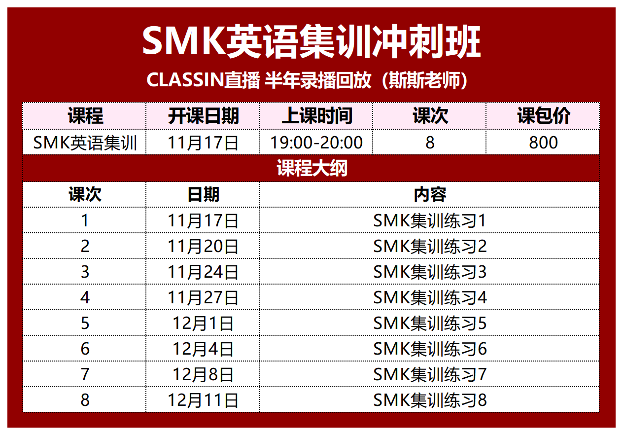 选取往年SMK真题及模拟题中的典型题、常考题、易错题,帮助学生全面梳理初中语法点,把时态、主谓一致、非谓语、从句、词性转换等核心考点全部打包讲透。同时将考试陷阱,出题套路等一一展开分析,帮助学生提升阅读速度,让学生短时间内切实提高应试做题能力,助力成功上岸。