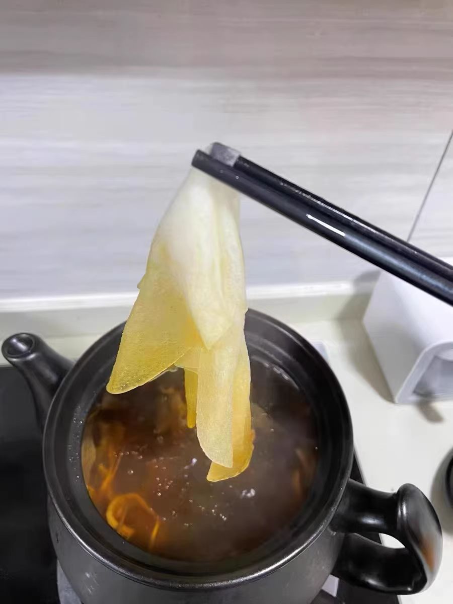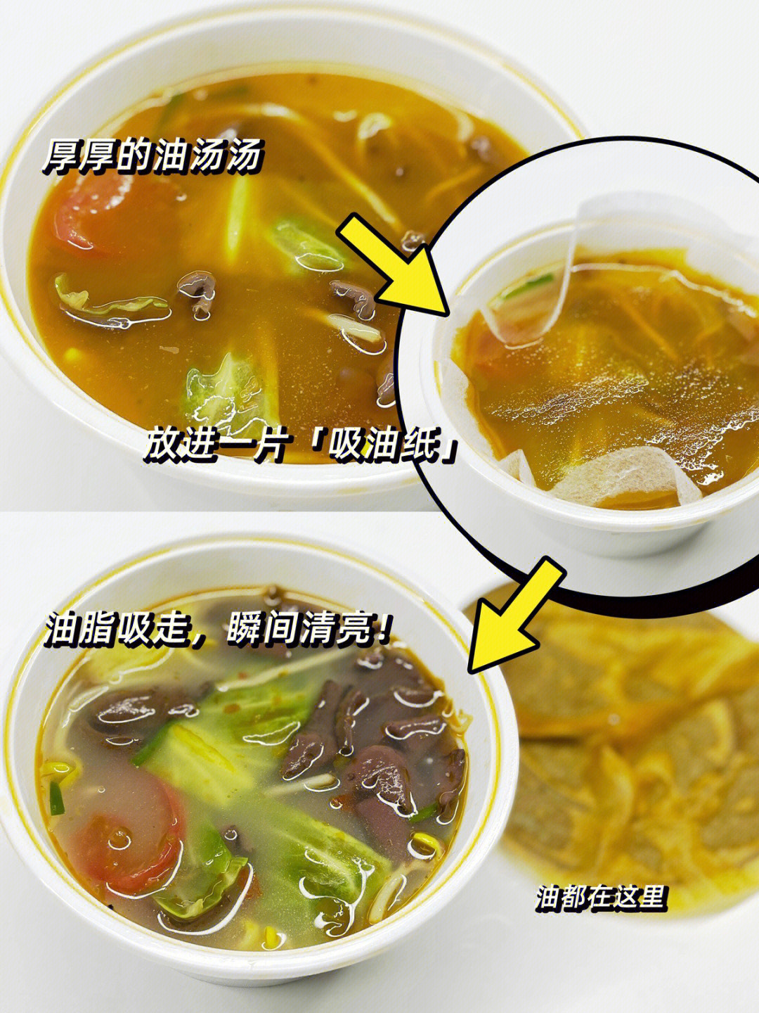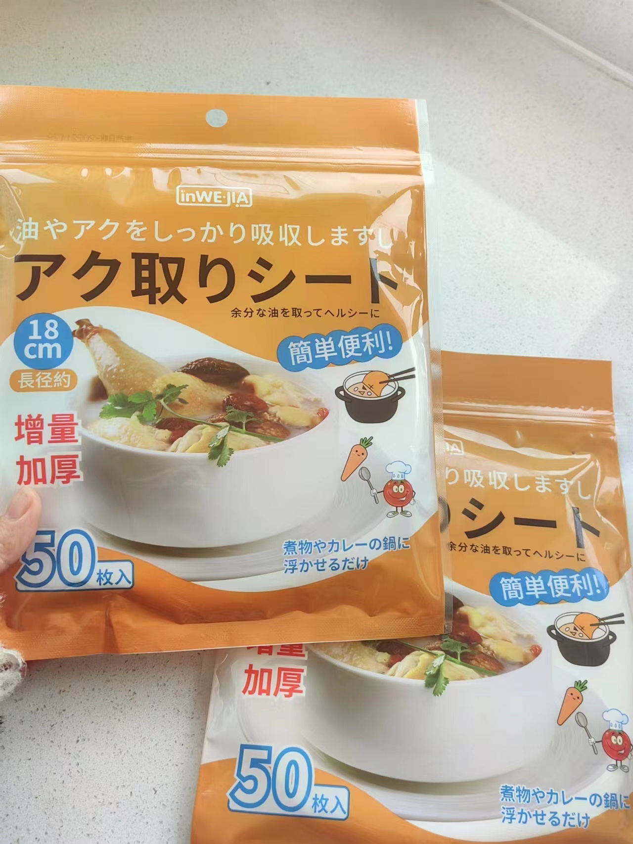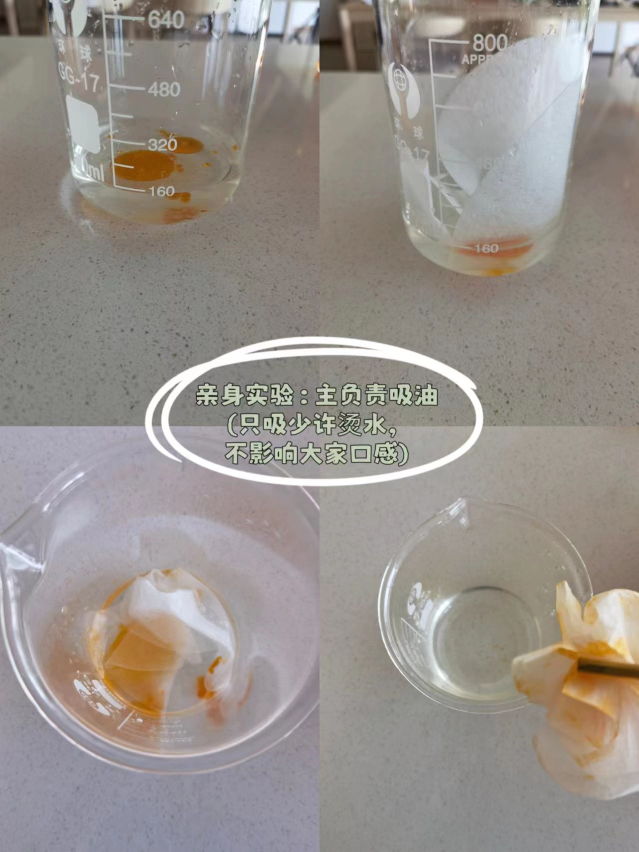 普通吸油纸不耐高温 一旦加热煮沸,就会溶解到汤里 这款inwejia吸油纸 加厚纸张,可耐高温约120℃ 清透无异味,安全无毒 一次性使用,卫生方便 ✨亲身试验:inwejia吸油纸 【只吸油不吸汤】 效果如下