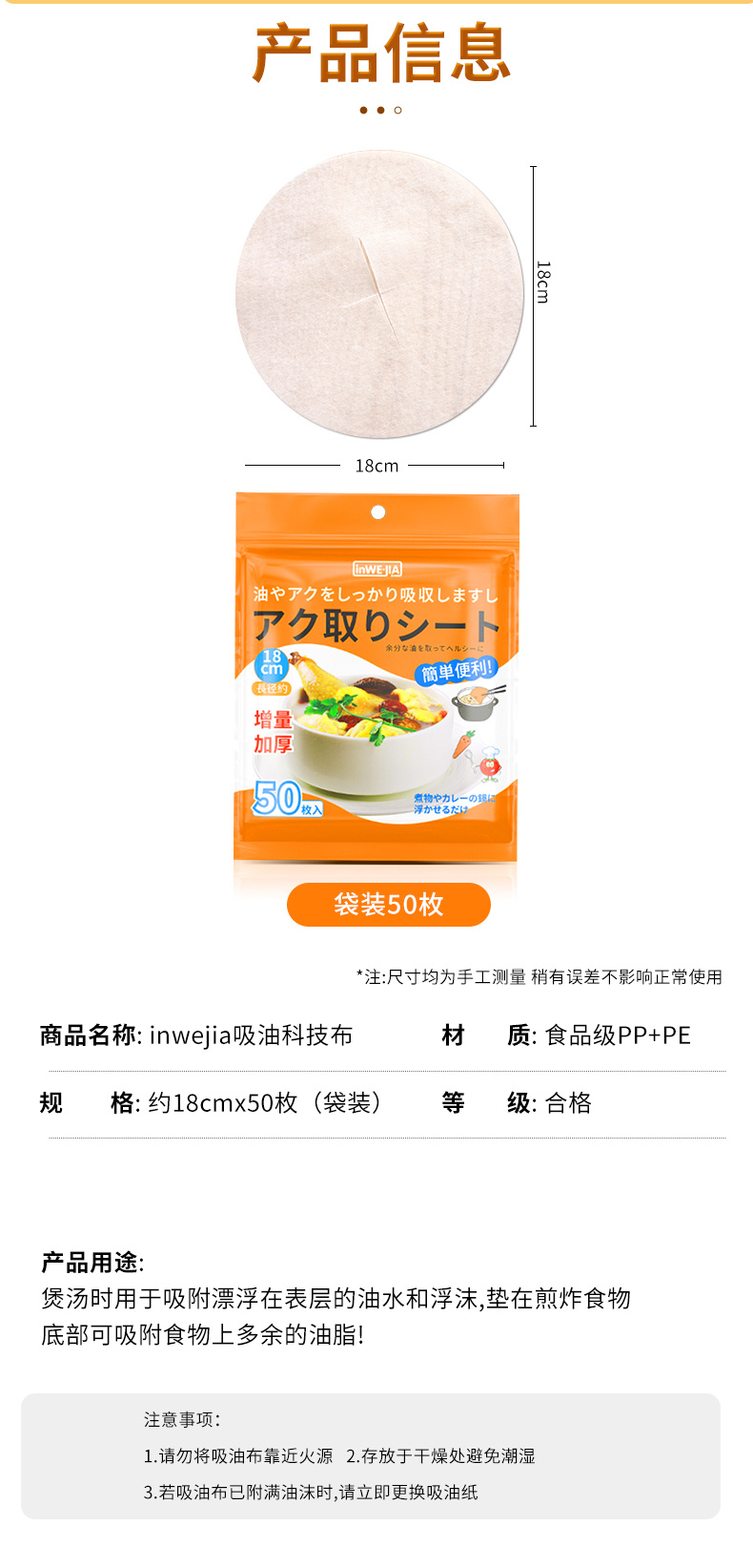 【品名】:inwejia食品级吸油纸 【品牌】:inwejia 【材质】:食品级PP 【规格】:50枚/袋 【产品用途】:煲汤时用于吸附漂浮在表层的油水和浮沫,垫在煎炸食物底部可吸附食物上多余的油脂! 【生产日期】:2023年2月 【保质期】:3年 【发货快递】: 韵达,圆通,邮政(随机) 【发货时间】:72小时 【不发货地区】新疆、西藏、港澳台 【售后标准】支持七天无理由,退货不影响二次销售!! 1、收到后如有质量问题24小时之内带面单+产品照片联系客服进行赔付或者补发 2、产品一旦发出后拒绝任何形式拒签,收到产品后当场验货,如出现问题,请及时拍照并与我们联系,我们会第一时间处理 3、客户留地址 电话等信息导致货物不能正常送达均不在售后范围内 4、产品已经发出的情况下,不可更改地址,不退货下单前,一定要留对信息,如果一定要更改地址,该地址产生的运费我们不承担 5、不以个人喜爱为由进行售后 6、每天安排提交订单提交订单后不允许改地址!!! 注意事项: 1.请勿将吸油布靠近火源 2.存放于干燥处避免潮湿 3.若吸油布已附满油沫时,请立即更换吸油纸!!