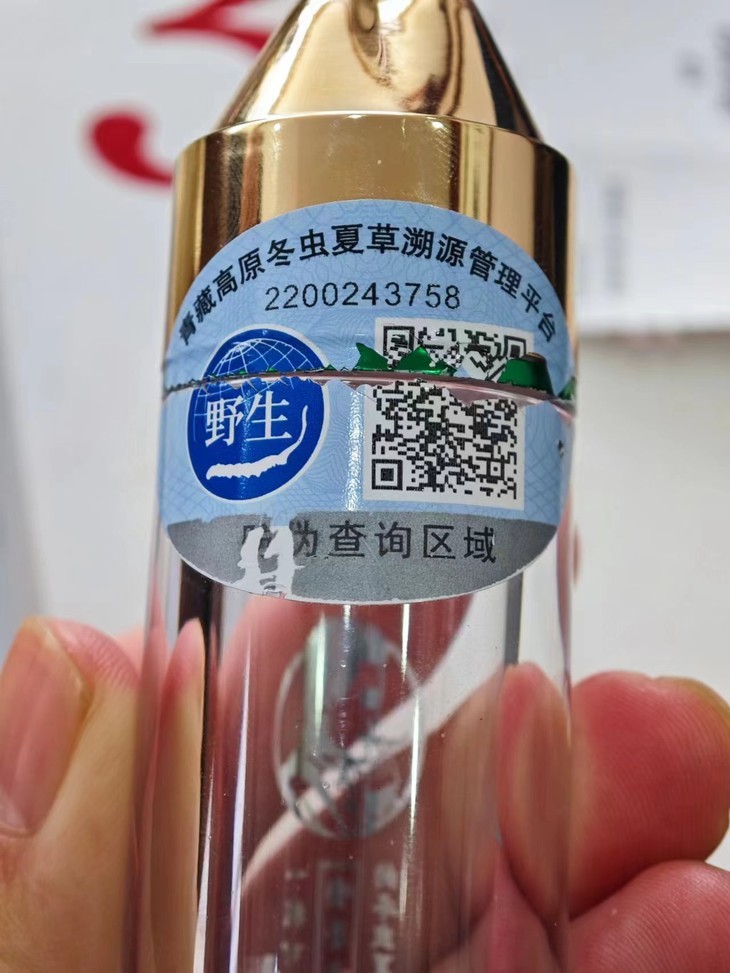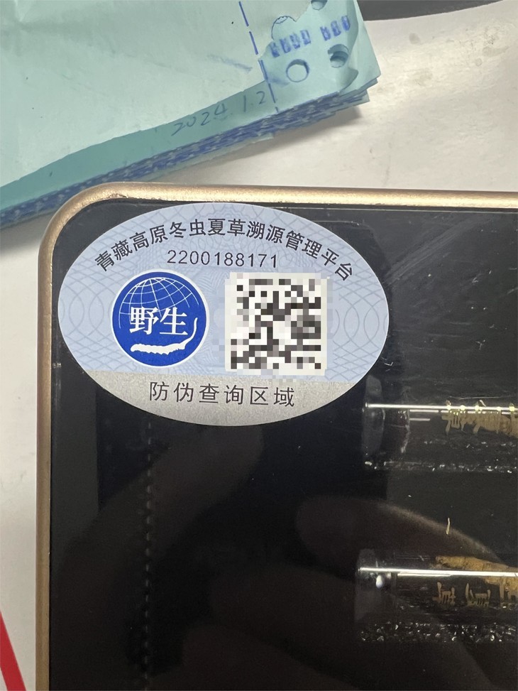 ▲实拍,国坤堂不同规格的礼盒都会贴有"野生虫草溯源码",扫码即可溯源虫草产地等信息。