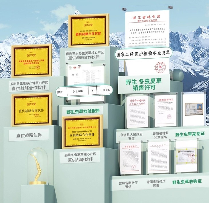 ▲实拍,国坤堂总部的荣誉奖项/权威背书陈列室,"冬虫夏草原产地诚信企业""玉树冬虫夏草核心产区直供战略合作伙伴""那曲虫草核心产区直供战略合作伙伴"等相关证书。